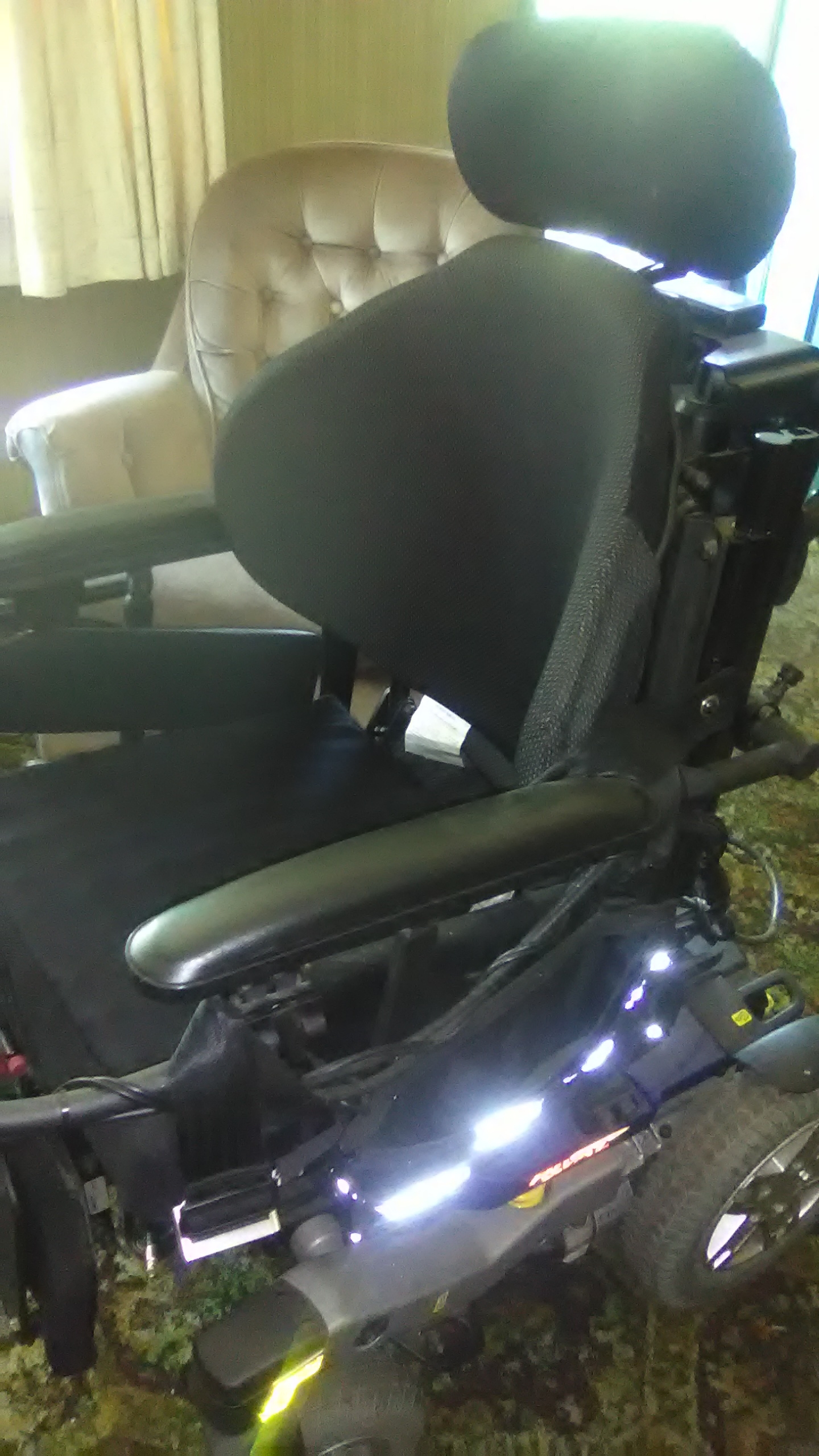 Quantum  wheelchair was purchased in December of 2004. Chair has been used, but is in good condition. Top speed of up to six miles per hour. There are three speed settings pre-programmed into the control system, which can be adjusted as necessary with a computer module, which will be included with the chair. These show up on the display panel to the left. There is also a control display panel for adjusting the chair, back, seat and foot rest. Computer display control is on the left side with the 2 control switches and stick on right side base. Chair can fully recline so the user is laid almost flat on their back. Chair can elevate person  up to five feet to be eye level with people. Has multi-function attendant control box on back. Motor lock kicks for wheels so you can disengage motors to push the chair if needed. Charger will also  be included with the chair.