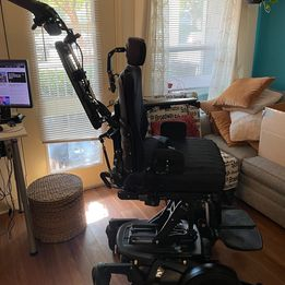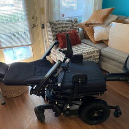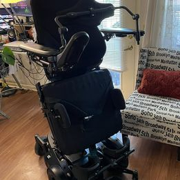 This Permobil Corpus F5 Power Wheelchair is in great condition. It features the full suite of power features including: Standing, Seat Lift (elevate), Tilt, Recline, Elevating Legrest, and a very adjustable seating system. The chair will be shipped, ready to ride with fully charged batteries. The specs of this Permobil F5 are: