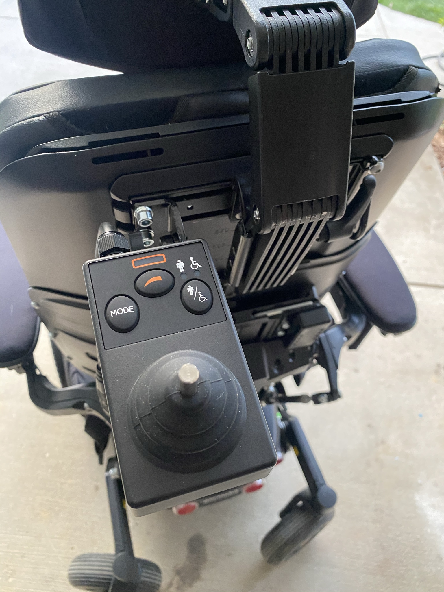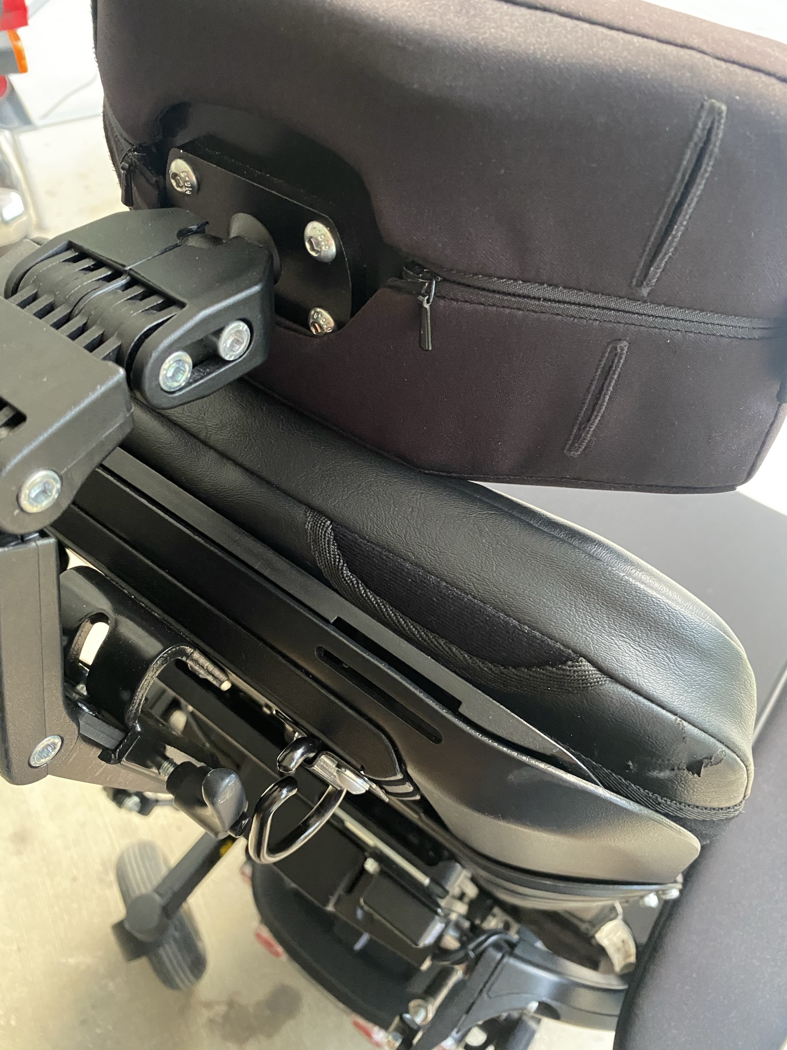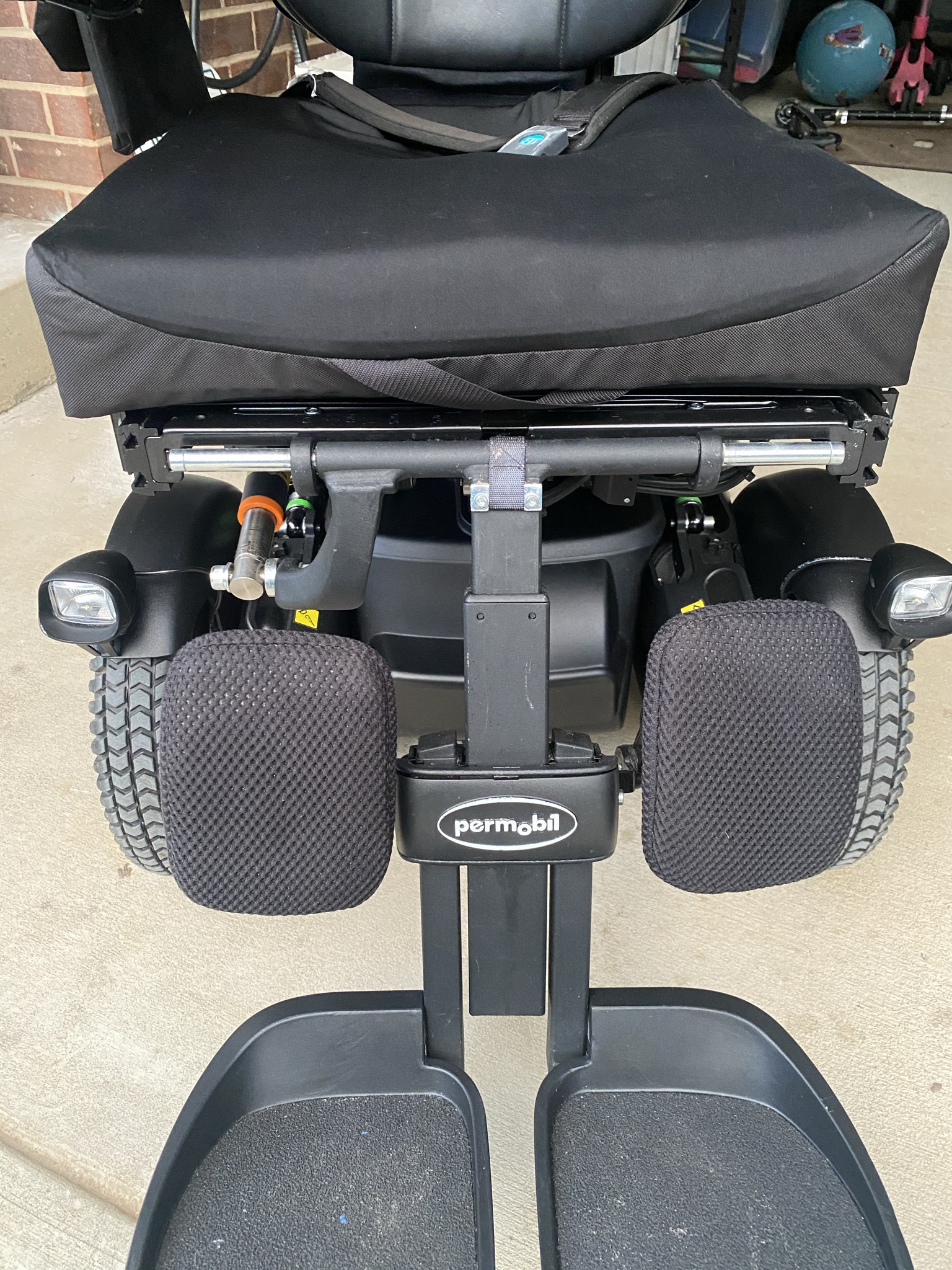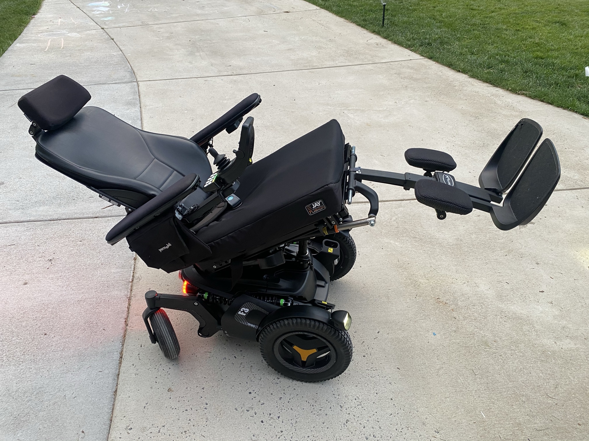 Seat rises and reclines. Includes Head support. Leather seat back and cushioned bottom. Lights, turn signals, flashers, LCD user screen, RNET. Batteries date sticker reads 1/18. No issues charging and holding charge. Runs at all speeds up to 6mph. Precise speed and turning control. Easily navigates tight quarters. This is a premium wheelchair.