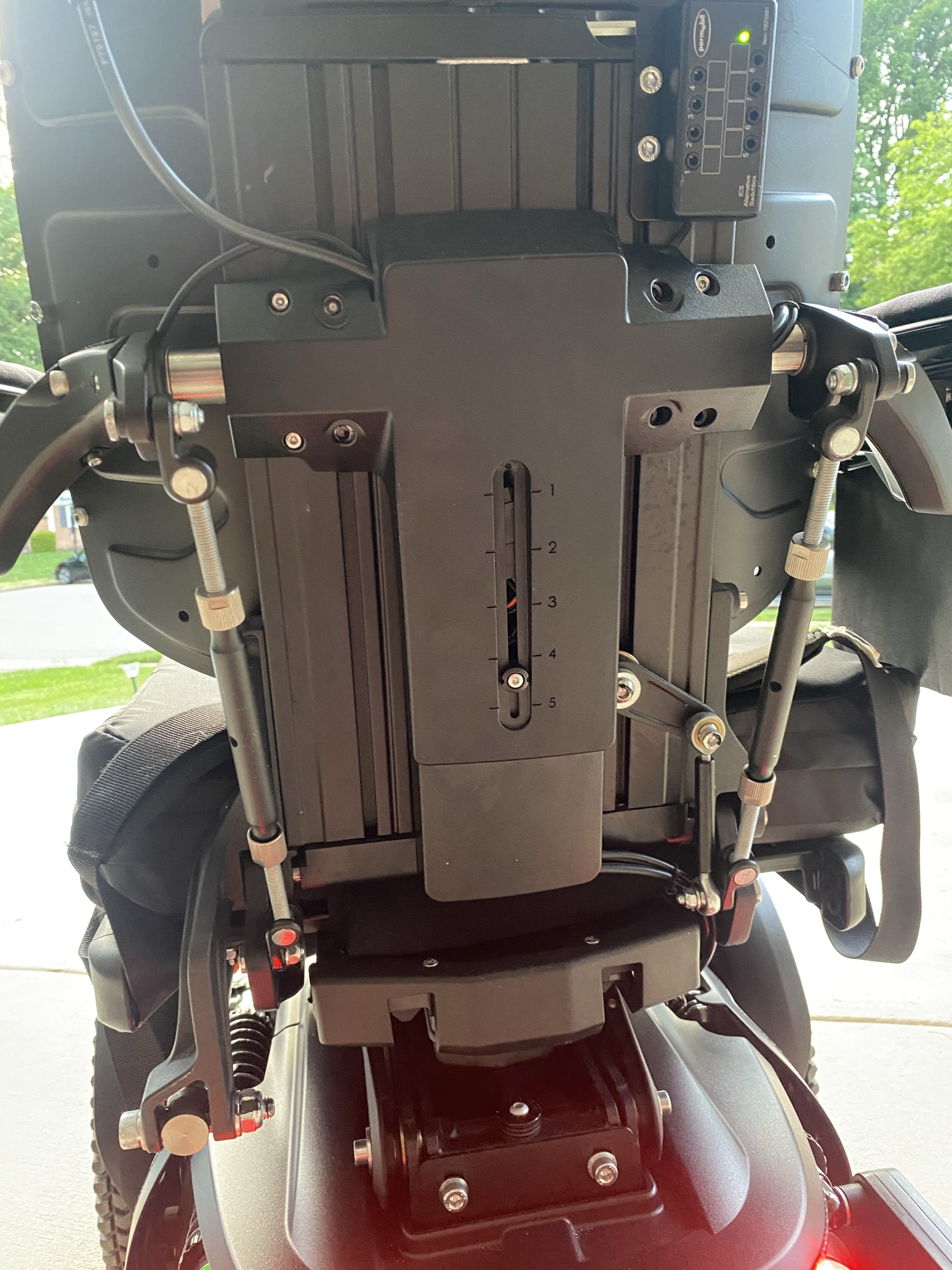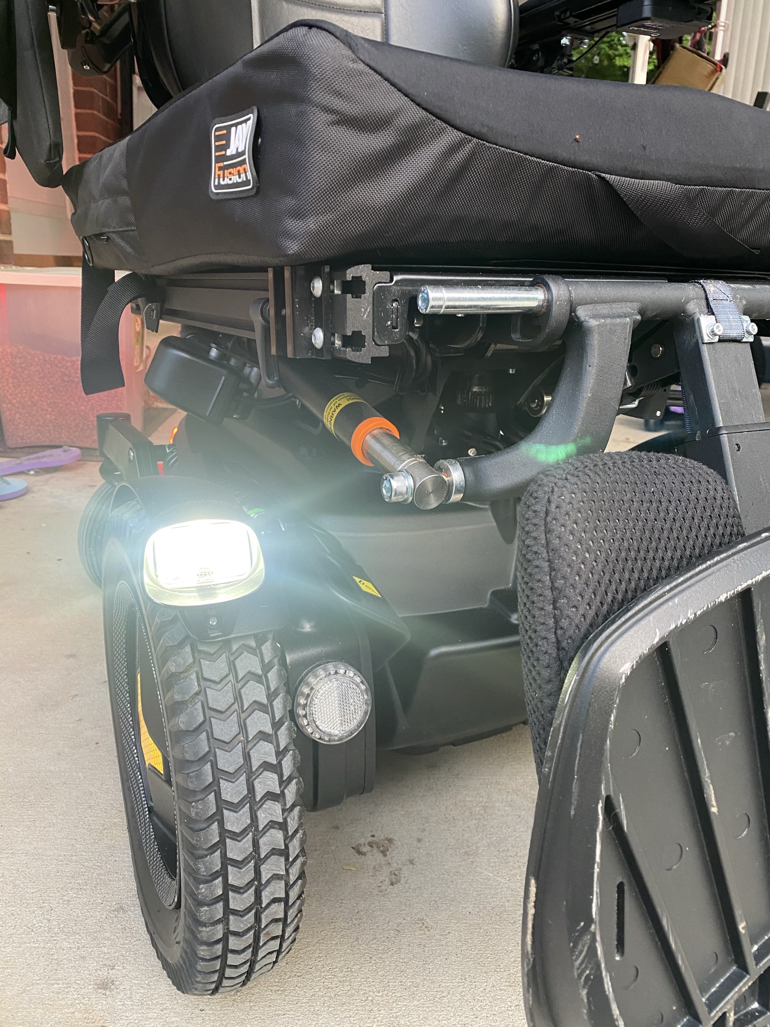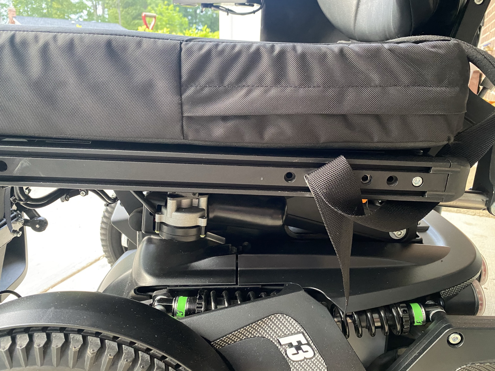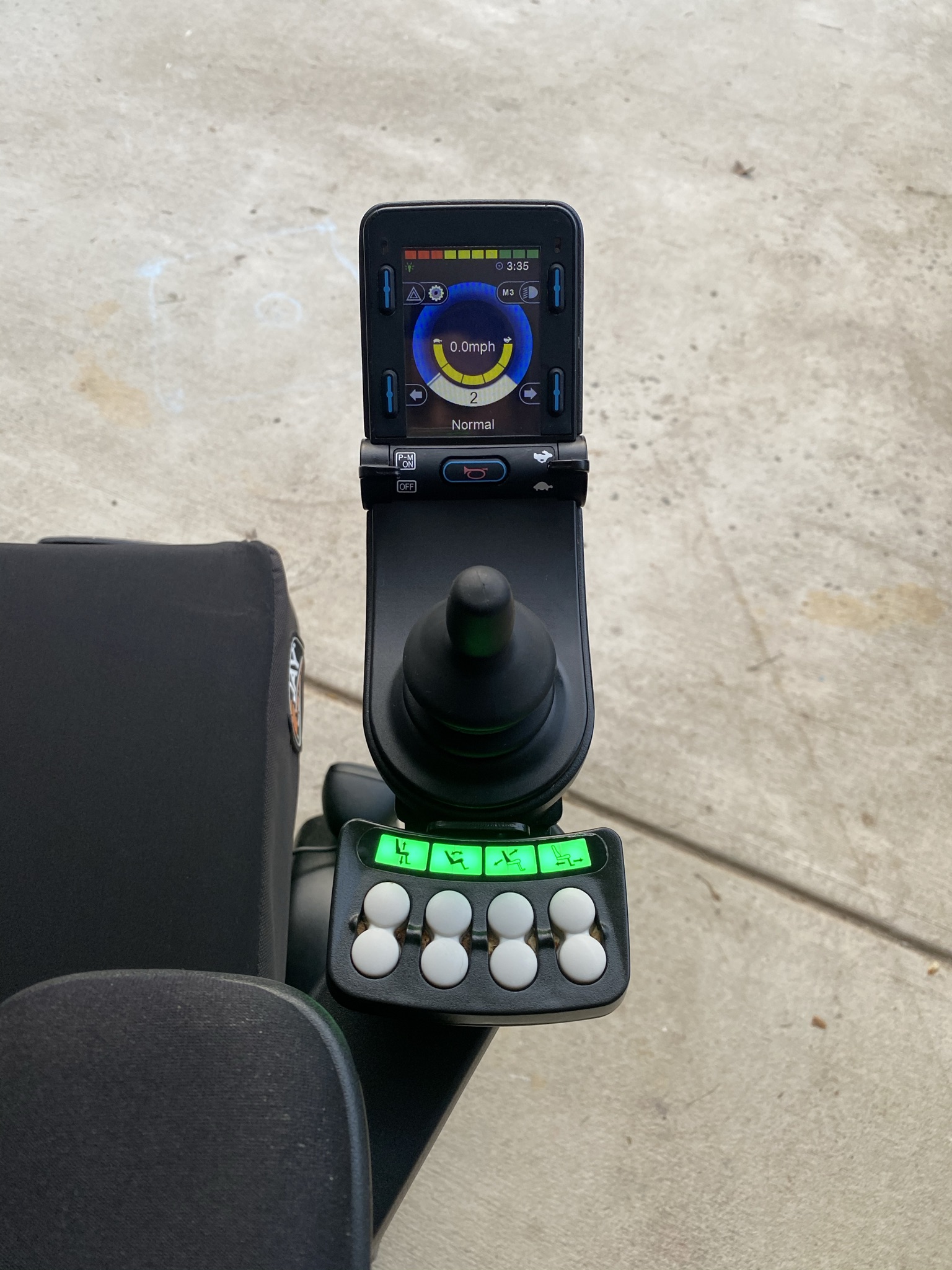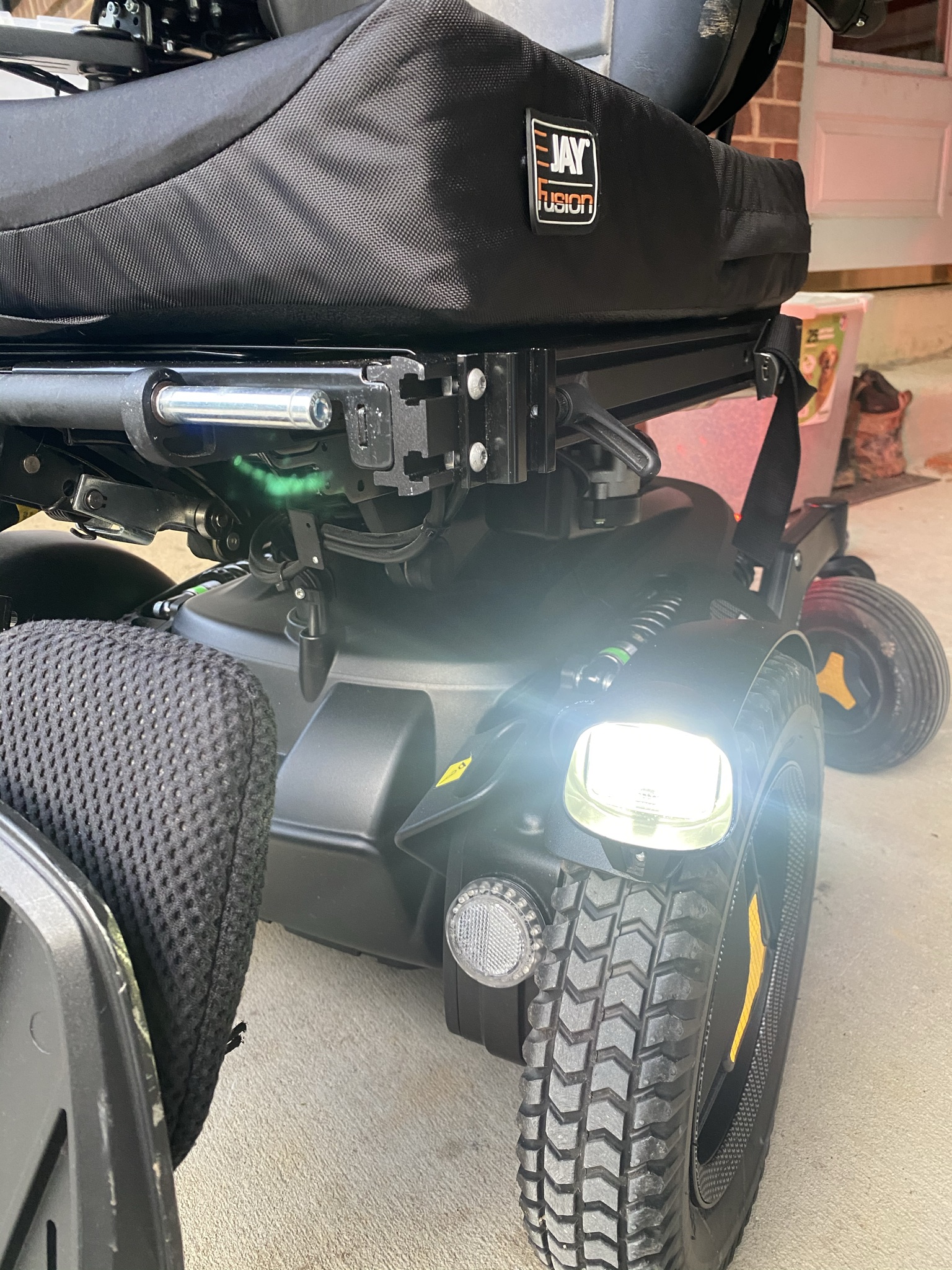 Seat rises and reclines. Includes Head support. Leather seat back and cushioned bottom. Lights, turn signals, flashers, LCD user screen, RNET. Batteries date sticker reads 1/18. No issues charging and holding charge. Runs at all speeds up to 6mph. Precise speed and turning control. Easily navigates tight quarters. This is a premium wheelchair.