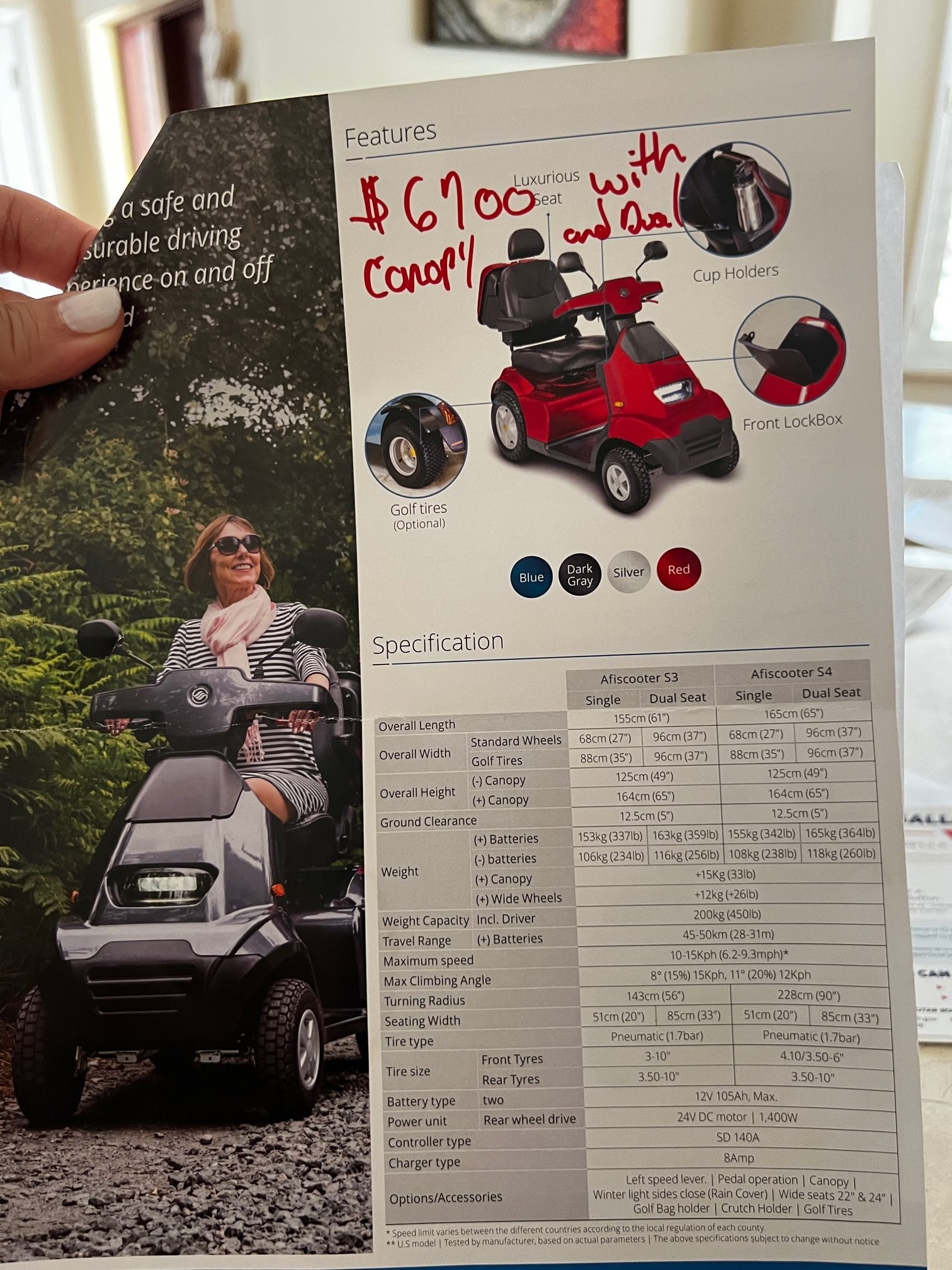 Feel free to check his link for more information about this scooter: https://www.mobilityscootersdirect.com/mobility-scooters/afiscooter-s4-with-dual-seat-by-afikim.html