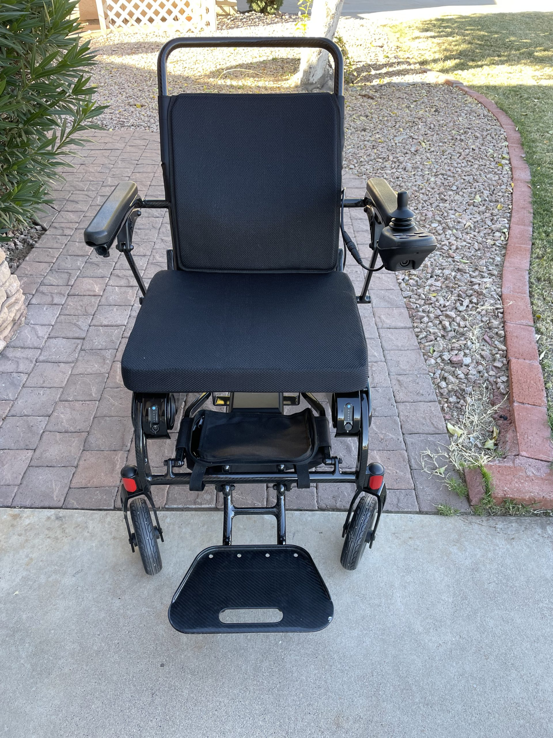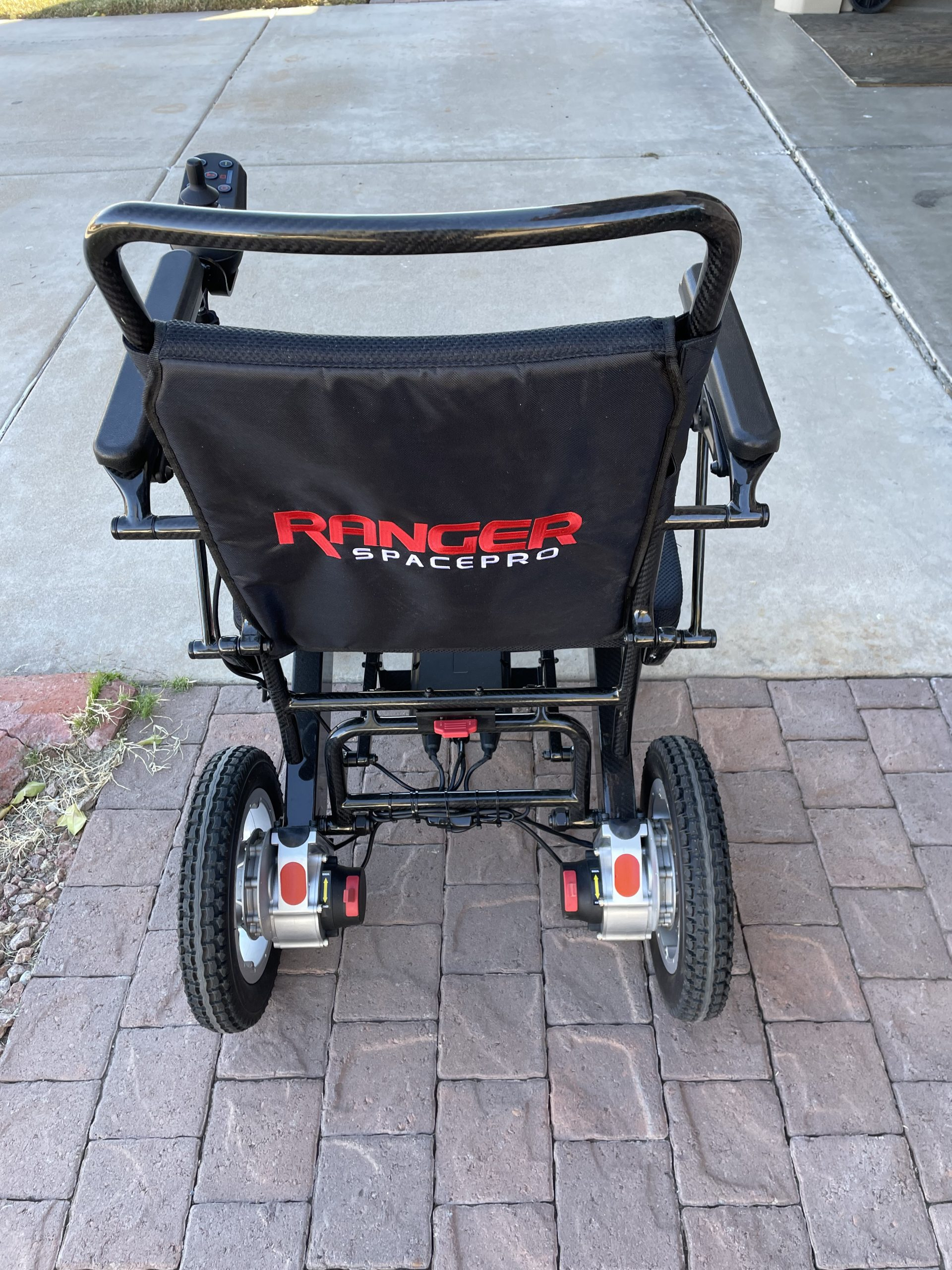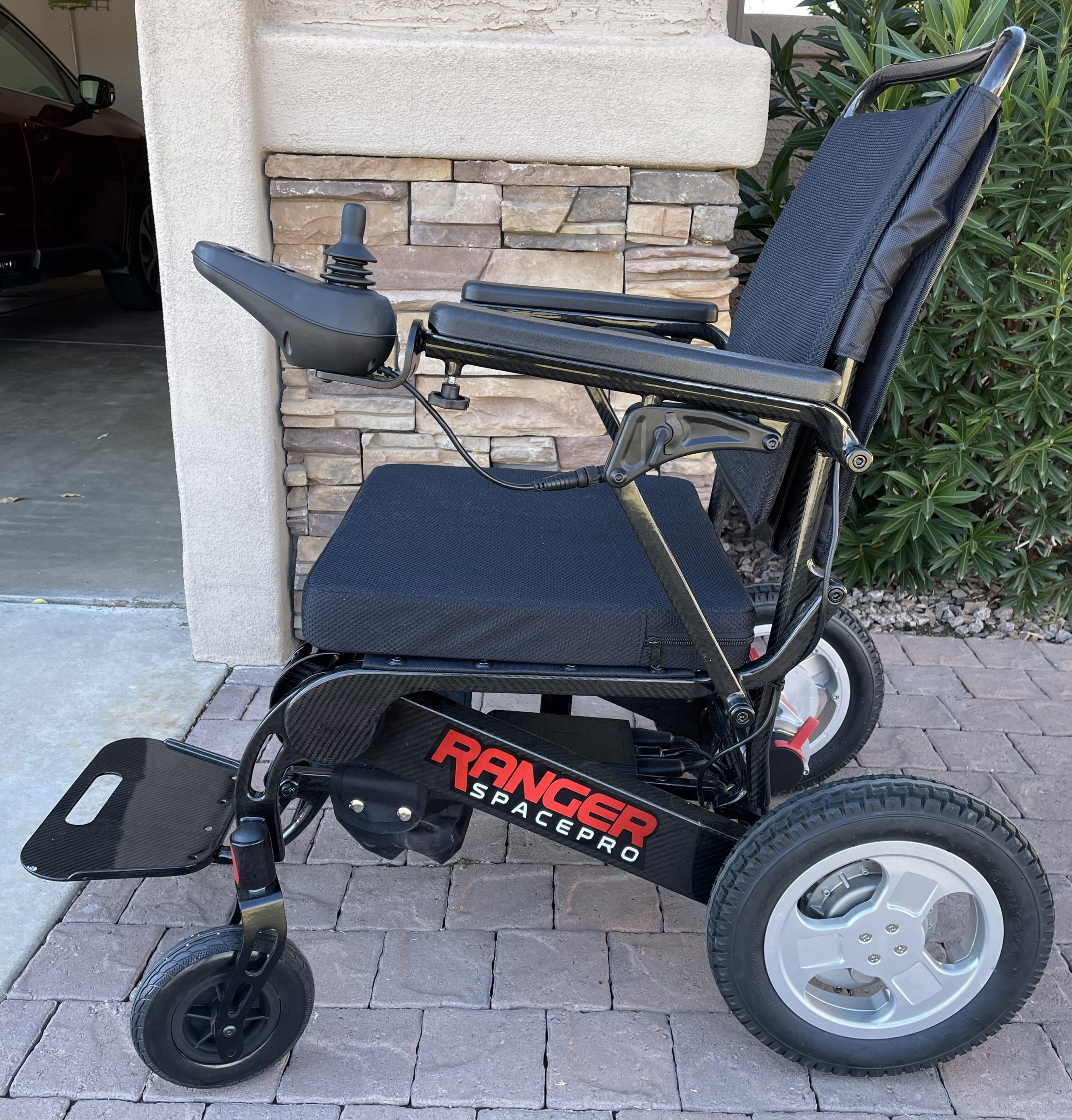 Like new Ranger Spacepro Carbon Lightweight Folding Power Chair from Porto Mobility. Purchased in September, 2022 and used lightly for 1 month, primarily indoors. Paid $5,000 new. Carbon frame (lighter than aluminum); large puncture-free solid rubber all-terrain tires (8' front wheels and 12.5" back wheels); 360 precision control joystick; 2 long range lithium-ion batteries; intelligent electromagnetic brake mechanism; airline and cruise ship travel friendly; fits in compact car trunks; base weight of 43 lbs (without batteries); 31" turning radius; 20 mile drive distance; 400 lb maximum weight capacity; adjustable backrest height; back and bottom storage; 25 degree grade ability; 5 mph maximum speed; manual mode switch allow caregiver to push the chair. Includes multiple accessories: cover, headrest, phone holder, drink holder, additional side armbag storage, LED light, etc. Very easy to use both indoors and outdoors and can be loaded into the back of a vehicle by one person.