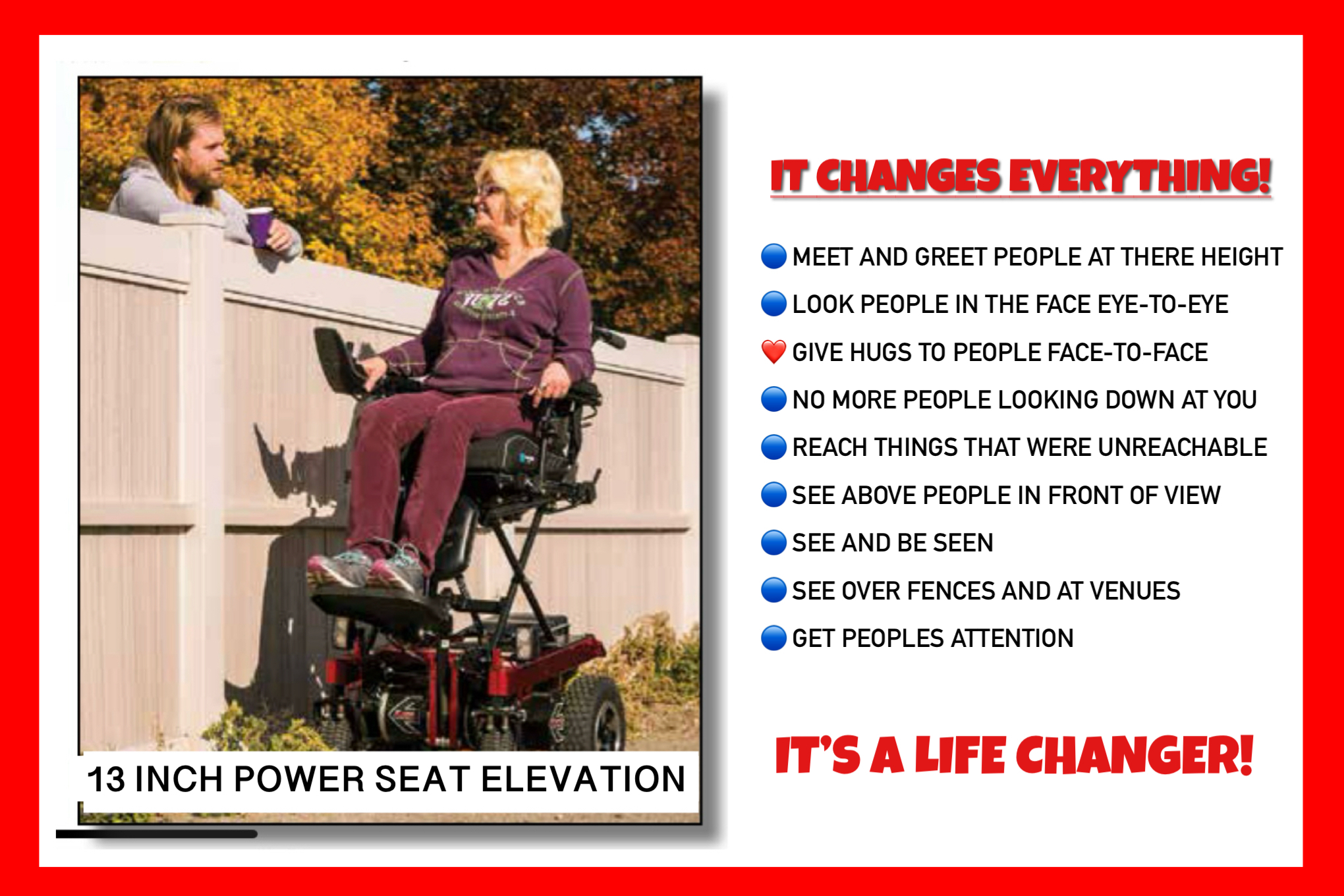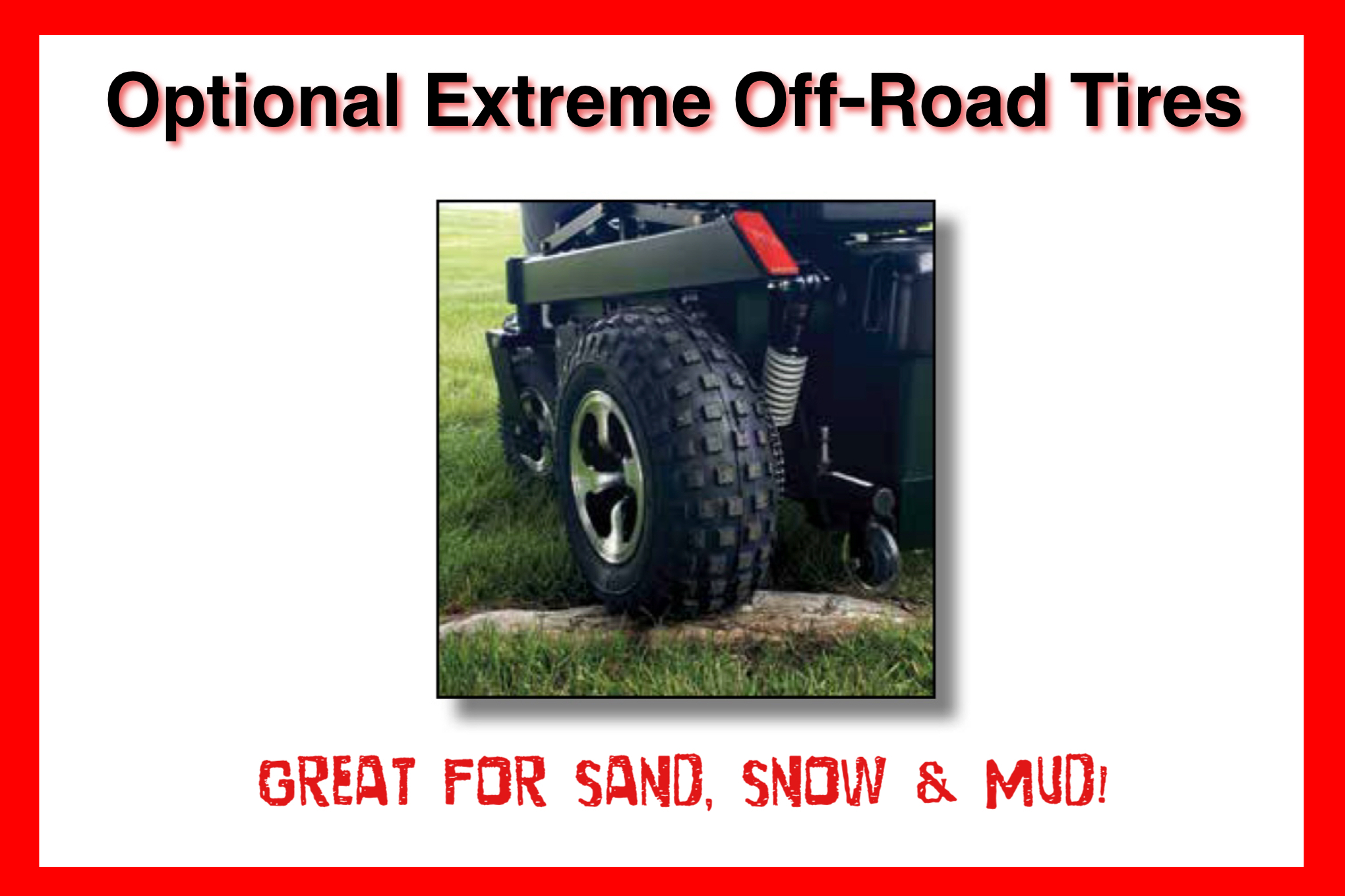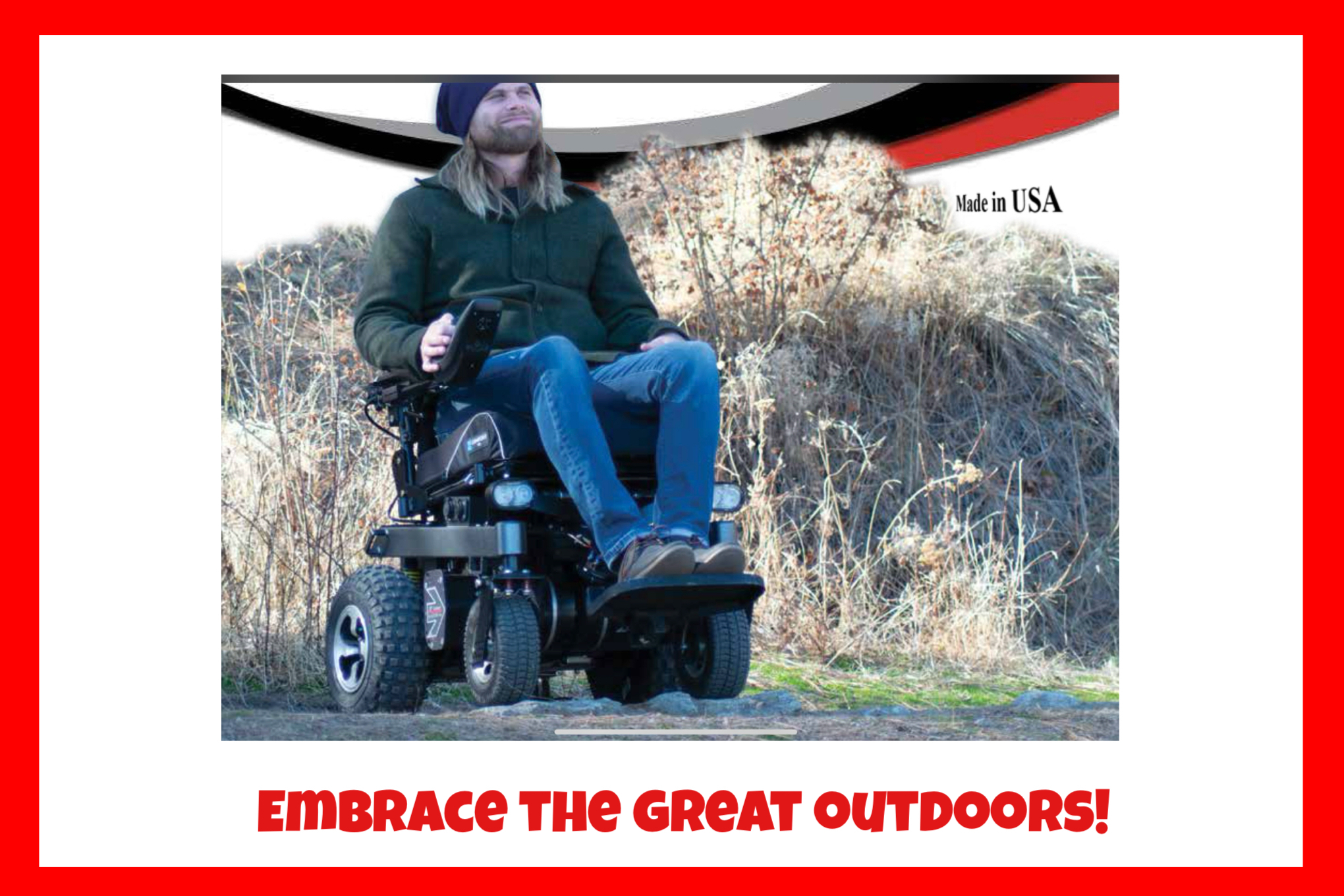 A lot of engineering and design has went into this wheelchair to make it easy to service and customize to the users needs…by the user or any wheelchair technician. A custom one-of-a-kind Lithium Battery has been made specifically for just this wheelchair exclusively that gives it a incredible driving range in real world situations for up to 120 miles per charge. This chair is designed to get you out in nature and go everywhere you want to go. Battery can be fully charged in less than three hours. This 230 AH Lithium Battery is brand new. It has Bluetooth capability and can connect to your phone to check the status of the battery and its usage. The Bluetooth can also be turned off, so it’s not transmitting when you don’t want to have it transmitting. You will not find this custom-made lithium battery or its capacity on any other wheelchair in the world! This Lithium Battery has a 10+ year lifespan. This chair also has two USB ports and one 12V cigarette lighter outlet so you can plug in all of your devices to charge them directly from this huge Lithium Battery. Even though this battery has a huge energy capacity, it weighs less than the standard factory wheelchair batteries. 30 pounds less! It still has the same physical size as regular wheelchair batteries. This chair also comes with Powerful Dual LED Driving Lights and the tail lights which makes it very safe to drive at night to see and be seen. This chair has a custom built-in horn which is incredibly loud and fun to honk! No more wimpy wheelchair “beep-beep” horn. This powerful horn will make sure you are heard! This chair has all the power seating options a chair can have so you can sit and ride in comfort. It has Power tilt, Power Recline. Power Foot Elevation. Power Seat Elevation up to 13 inches. Another great and unique design feature is the Quick Access Battery Tray that is also designed into the chair so with the flip of a switch/lever you can release the battery and it removes with a slide out tray that you can remove or access the battery from the back of the chair. Very convenient! No tools needed! Another incredibly great feature with this chair is that there is NO CASTER FLUTTER OR SHAKING!!! No more shaking of the casters wheels like ALL other wheelchairs do when you drive them down the road. These caster wheels are incredibly well built and are large and wide 9” x 3.5” caster wheels and have xtra heavy duty forks and super strong bearings. Everything is built incredibly tough and made to last and handle whatever you throw at it! FAR SUPER to any other chair on the market! This chair is great to drive in the mud, snow or sand because of the wider tires too. There is even optional wider and larger off-road tires that can be purchased to go on this chair. This chair still has the same width, length and height of other wheelchairs so it can go everywhere other chairs go…and more. This chair can easily be driven into small spaces like minivans or in and around tight spaces inside. Unlike other wheelchairs that are mid-wheel drive or front wheel drive this chair is rear wheel drive and so it’s very intuitive and easy to drive. Just like a car. Unlike other chairs it’s better for handling and not fish tailing when driving fast.