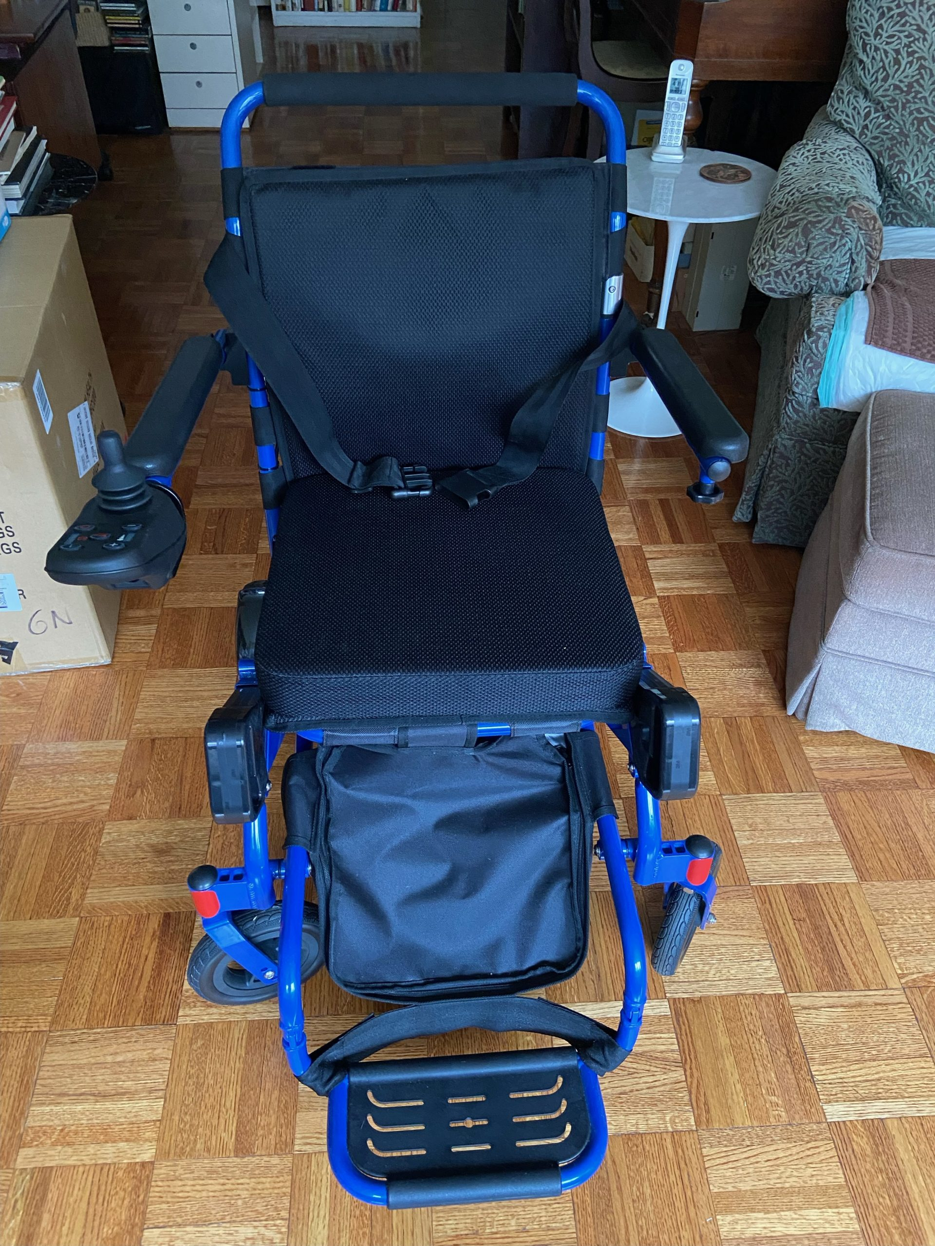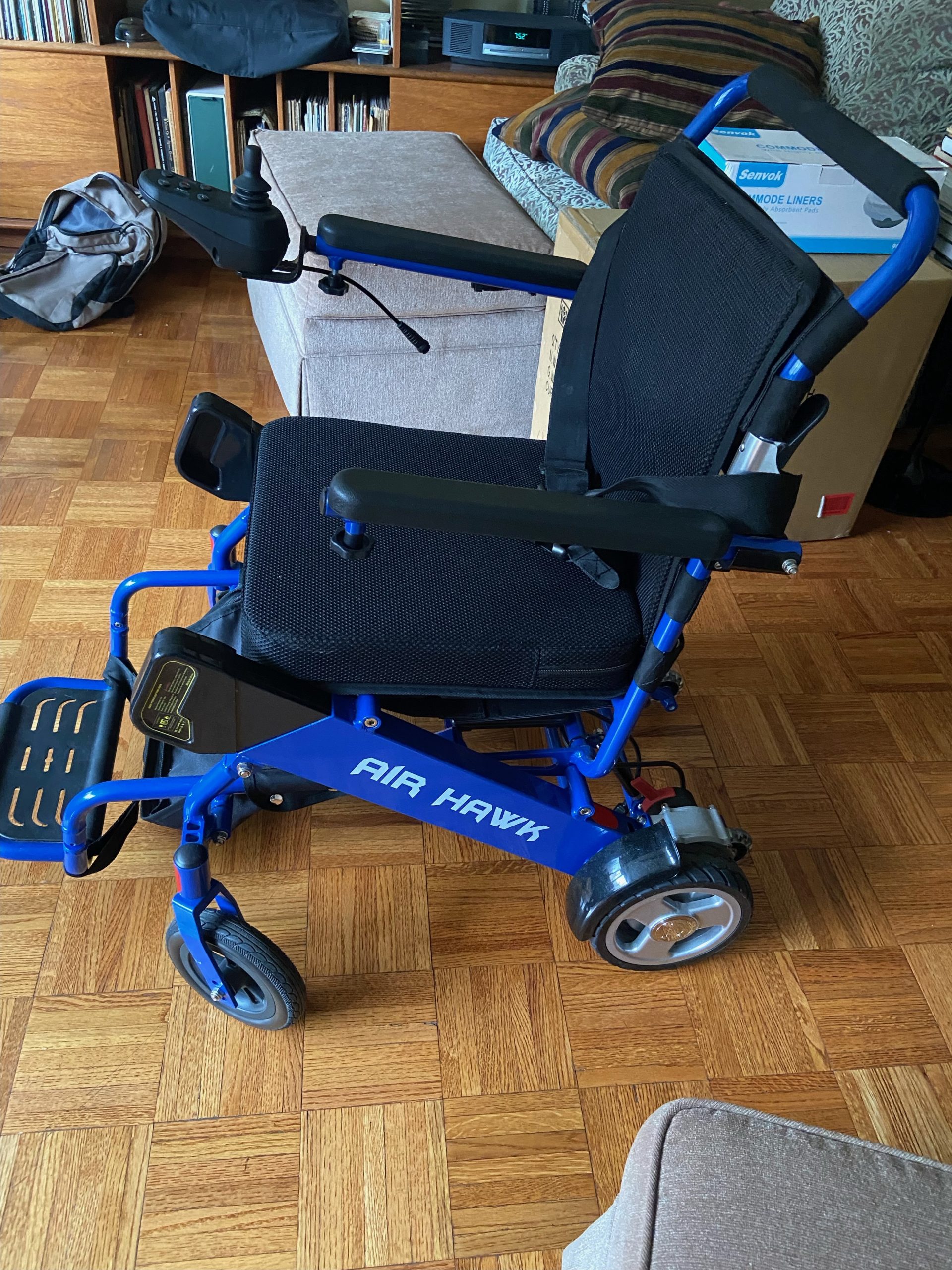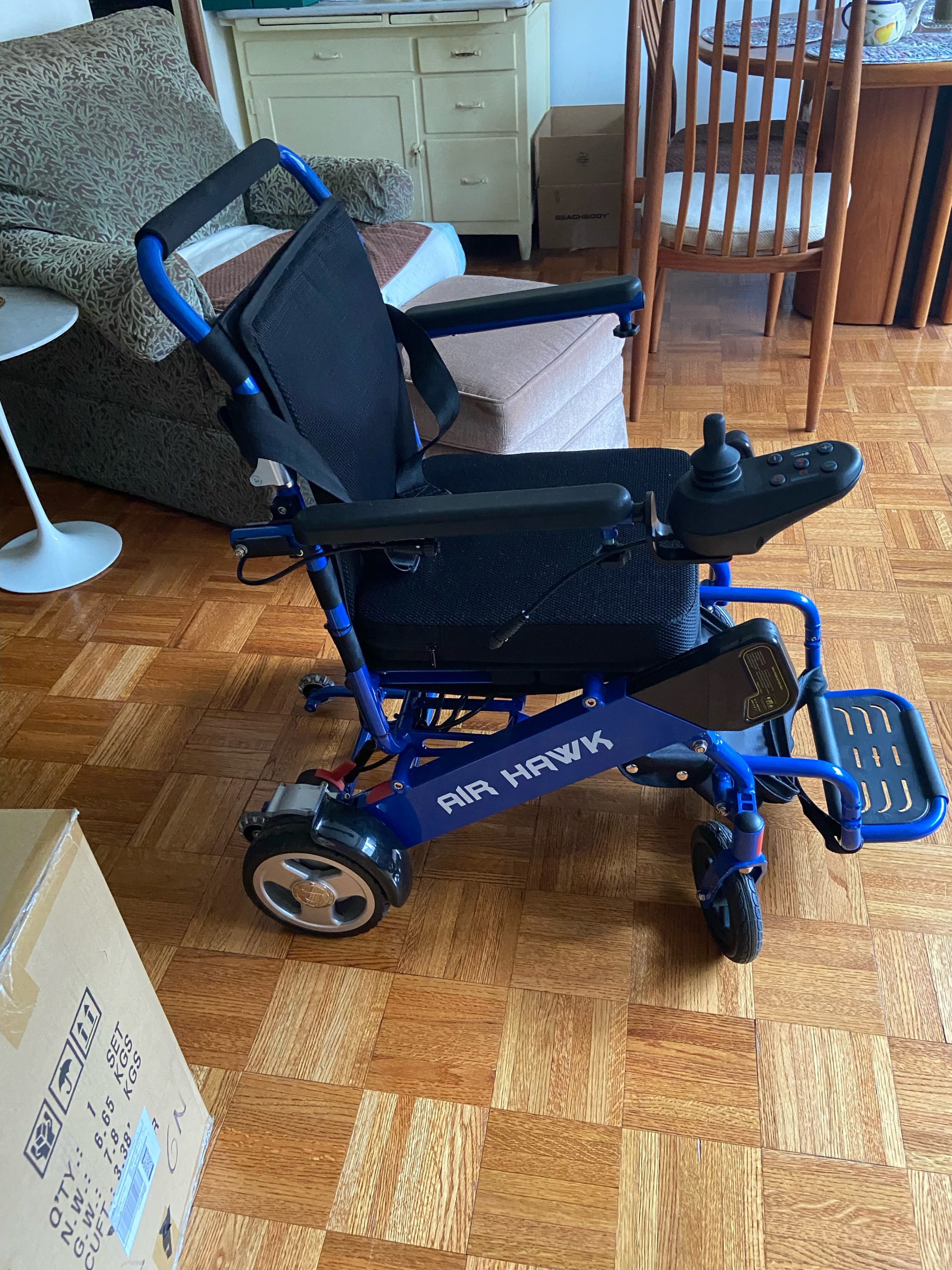 Air Hawk Electric Lightweight Portable Wheelchair from Discover Your Mobility. Bought in 2022 from an online company, used three times and advertised as the best on the market. Comes with all accessories, including long lasting battery. NYC or North/Central Jersey location. The color is blue and at 41 pounds, can be easily folded to fit in a trunk or taken on a plane as a piece of carry on luggage. It is made of A Aircraft Quality Aluminum Alloy, with a width of 12.25 inches. Bought for my aunt who was not comfortable navigating an electric wheelchair. Not sufficient for a very heavy set individual. I can answer any questions or concerns. Original price was $1,987. Invoice available to review. The wheelchair is currently located in Manhattan and can be easily brought to New Jersey for testing or review either in my home in New Jersey, in a Manhattan apartment in the Chelsea area of 14th street and Sixth Avenue, or the location of your choice.