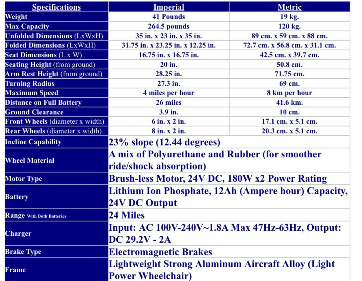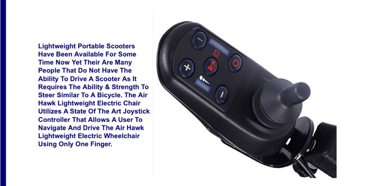 Vendor Description: (Demo video https://youtu.be/1_MZdncO05M ) The Air Hawk Is Easily The World's Lightest Lightweight Power Wheelchair, Weighting Only 41 Pounds. The Air Hawk Portable Power Wheelchair Easily Folds Into A Small Compartment With A Width Of Only 12.25 Inches Allowing It To Fit In The Trunk Of 'Any' Car And Can Be Taken On A Plane As Carry On Luggage. The Air Hawk Folding Electric Chair Has Two High Performance Hub Motors As Well As Anti Tip Wheels Allowing The Air Hawk Folding Electric Wheelchair To Take On Steep Inclines & Hills Safely And Effortlessly. Also The Air Hawk Lightweight Power Wheelchair Is The Only Folding Electric Wheelchair With A Optional Built In Battery Backup So You Will Never Be Caught Out Needing A Charge And Waiting Several Hours Before You Can Continue What Ever It Is You Need To Do.