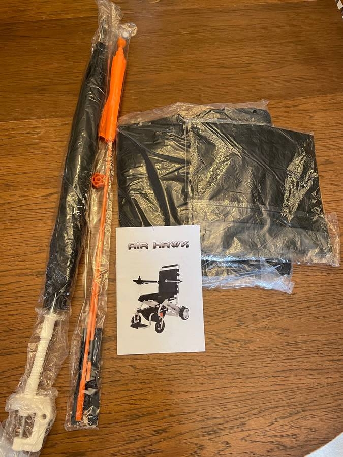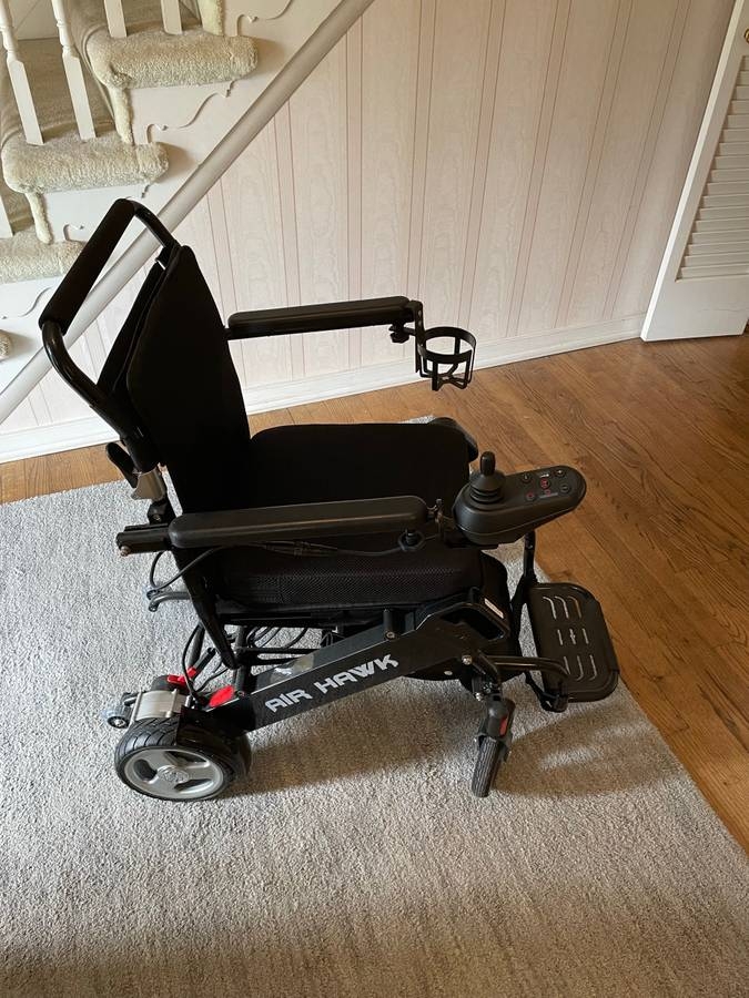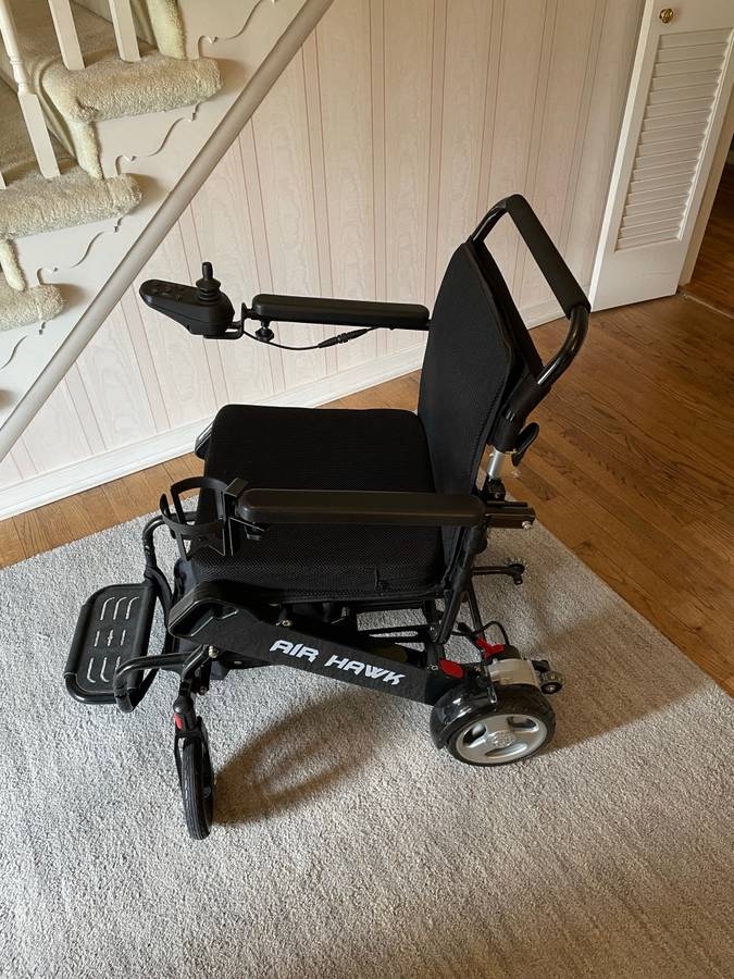 (Herndon, VA) Like new. Barely used, less than 10 times (purchased in June 2020 for $2,085). Includes extra battery and charger. Air Hawk is a lite weight 41 lbs foldable electric power wheelchair; includes oxygen tank bag and pouch for under seat storage. Comes with umbrella, safety flag and two batteries with chargers. One owner, barely used. Owner moved into assisted living, wheelchair not needed.