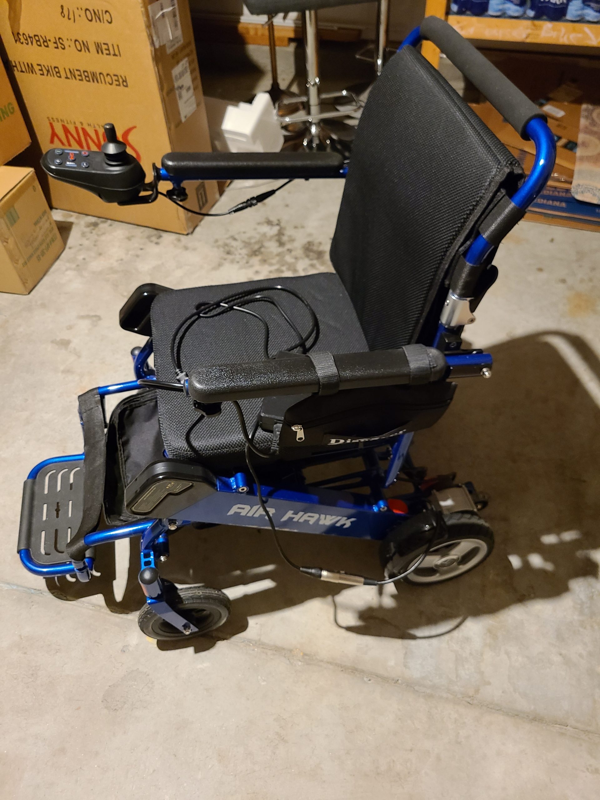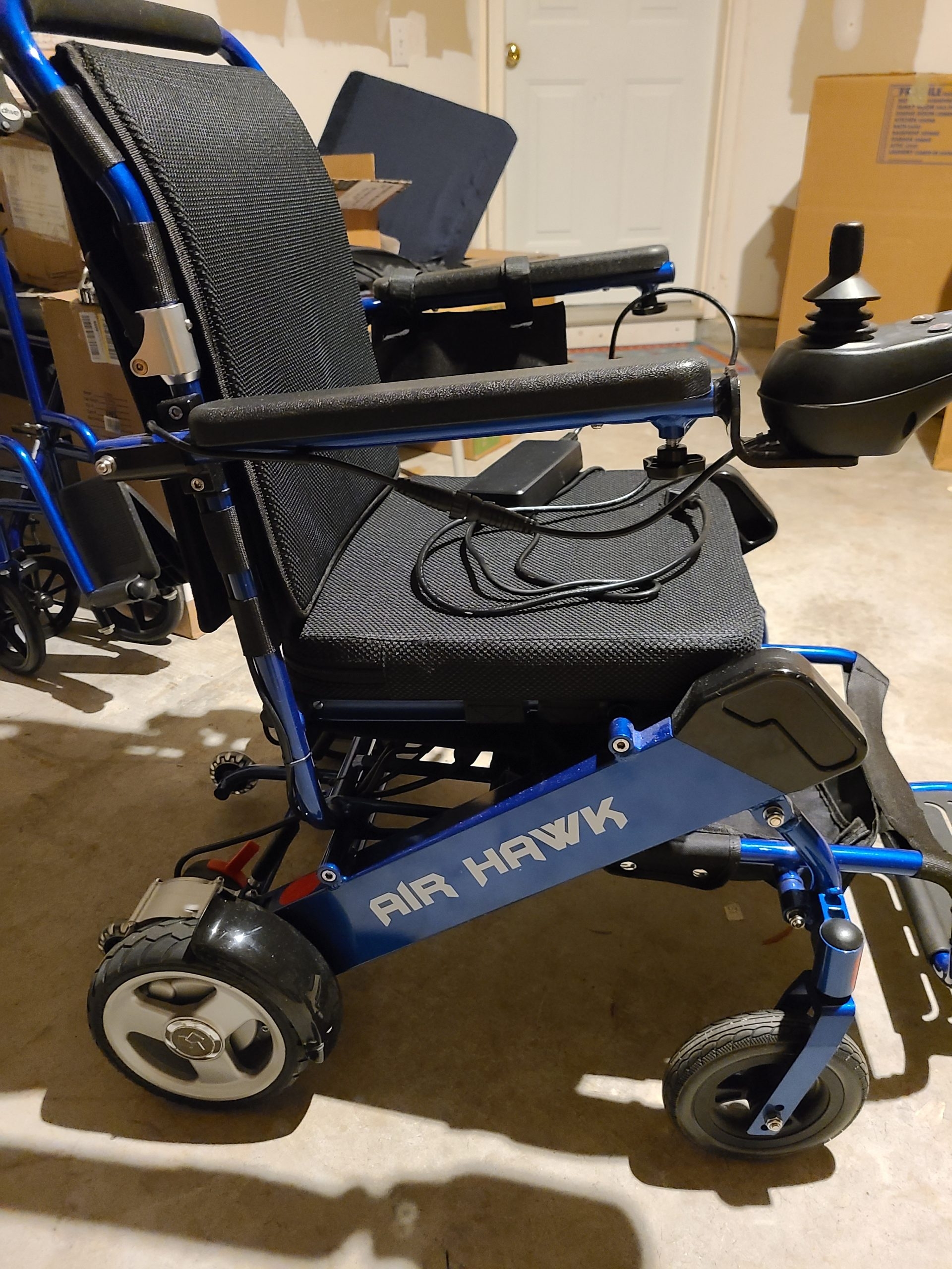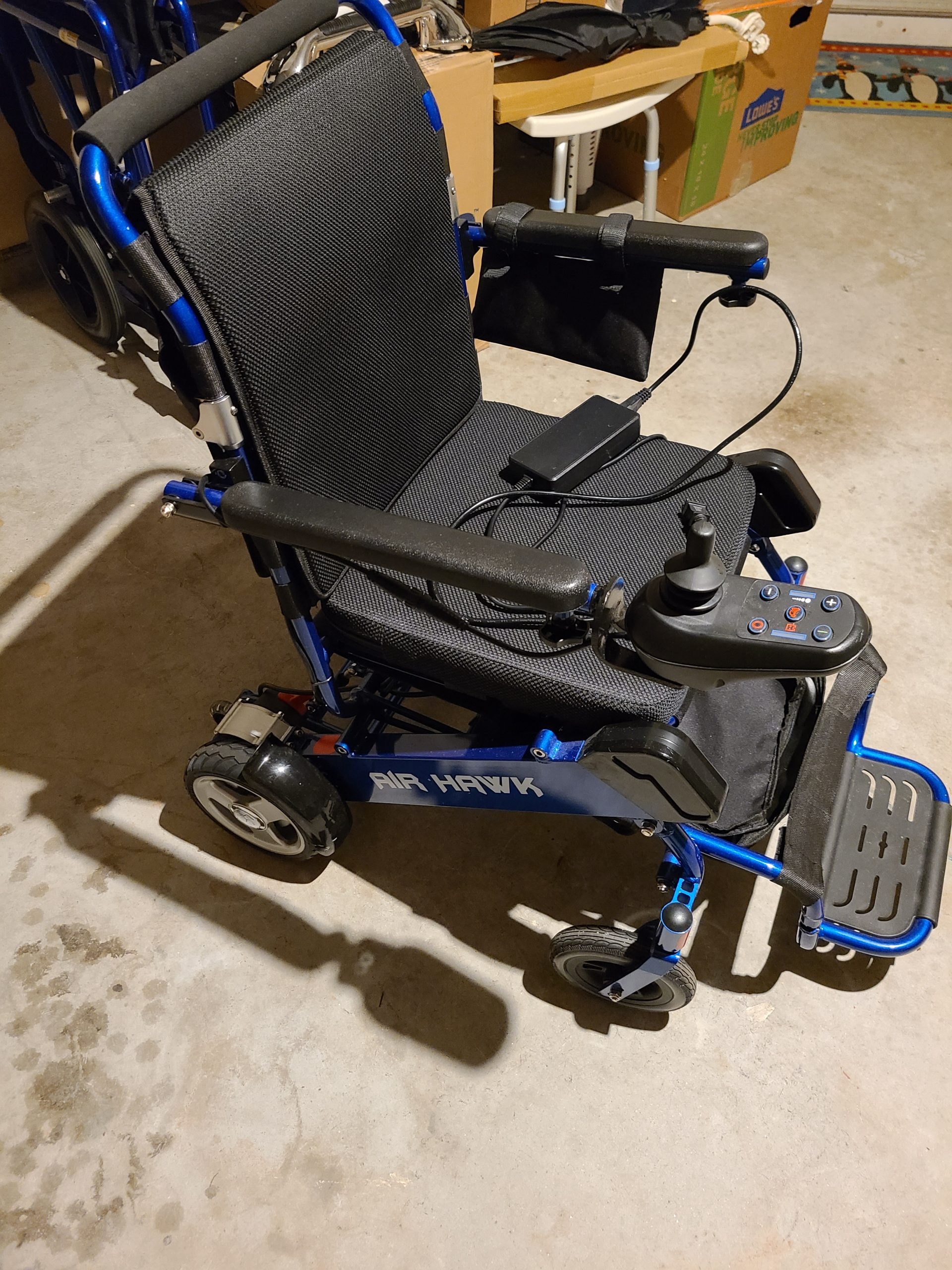 Top of the Line rarely used Air Hawk Motorized Wheel Chair with Traveling Case, Accessories and Extra Battery. Dual Batteries for longer use, excellent condition, Foldable and Lightweight. Accessories include extra battery, cup holder, flag and umbrella.
