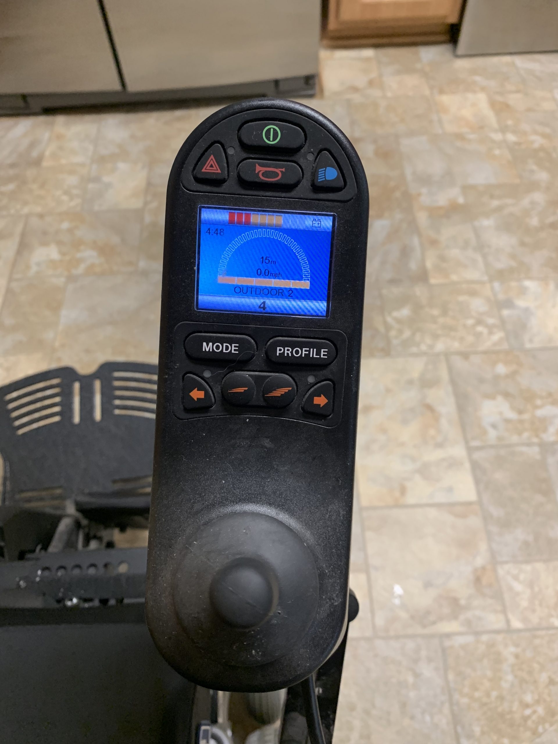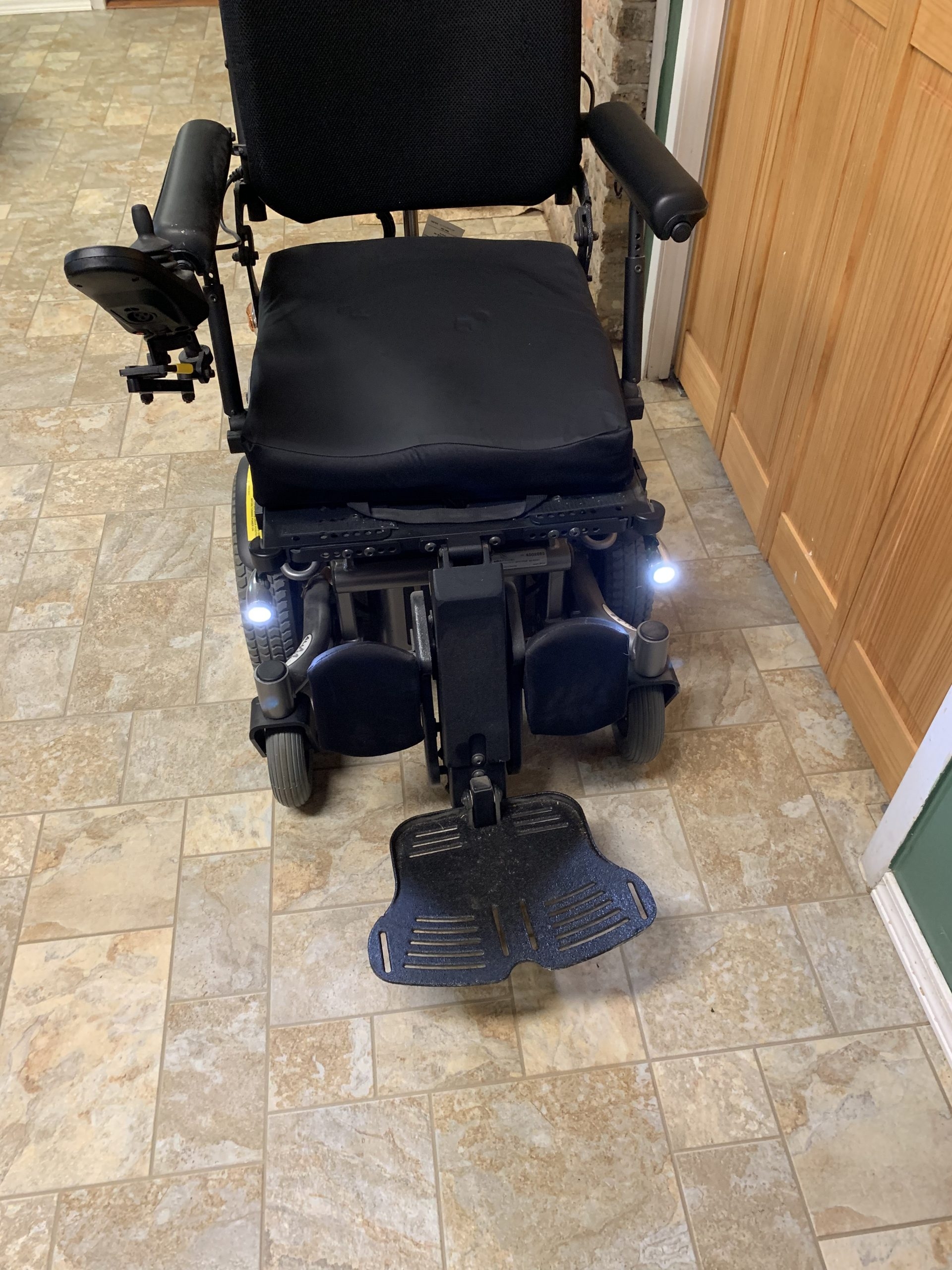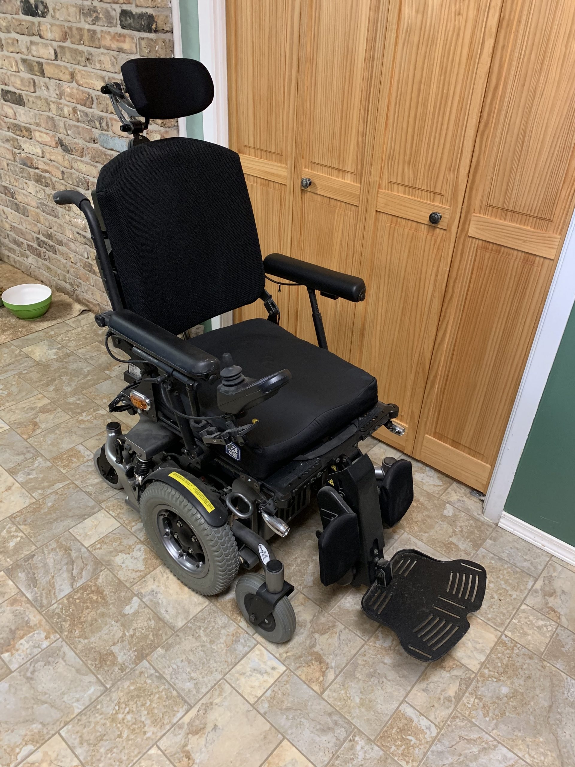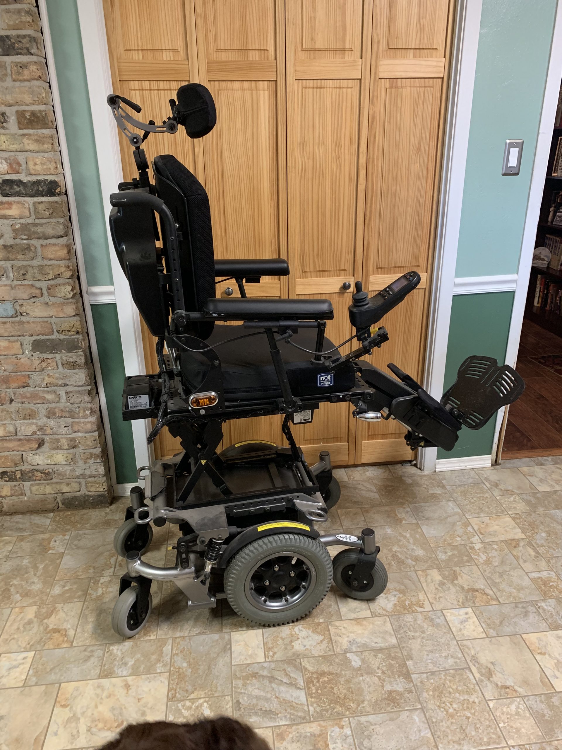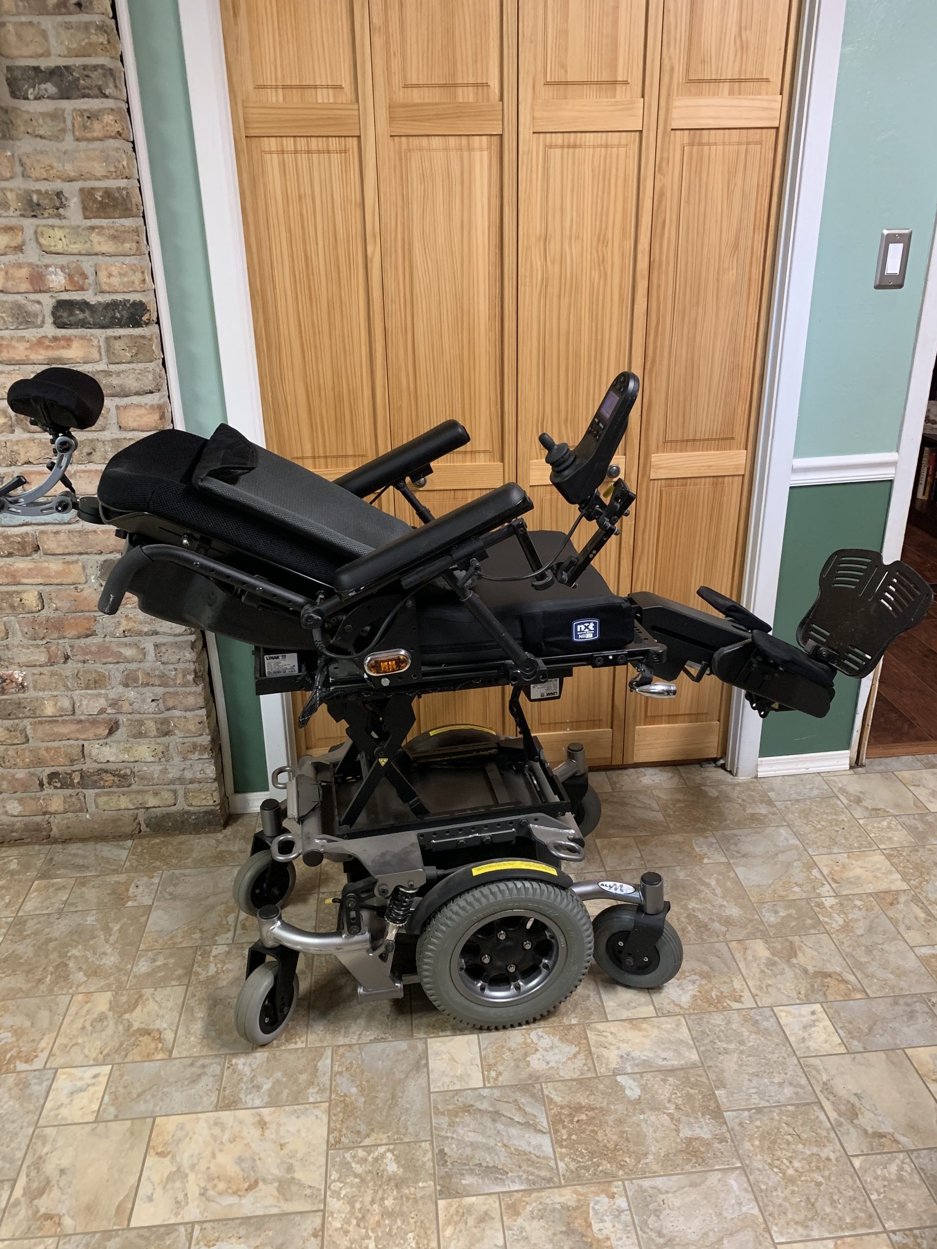 All Track M Series electric wheelchair in great condition! Only used a handful of times. Purchased for my disabled mom, but it just did not work with her condition. All the bells and whistles including seat elevation, full recline, speed adjustments. 6 wheels, lights, blinkers. All in good working condition, including battery and charger. See all photos and videos for more details. Owners manual is included. Original cost: $19,346.22. A photo with a list of features is included as well. This is an excellent deal for a wheelchair that has been used 20 times or less. Must be able to pick up in North Texas or willing to coordinate and pay for shipping. Very comfortable seat and headrest with lots of adjustable features to make it fit the driver just right. 6 wheel drive makes it very maneuverable in a variety of spaces and you can adjust the elevation to reach higher shelves and objects.