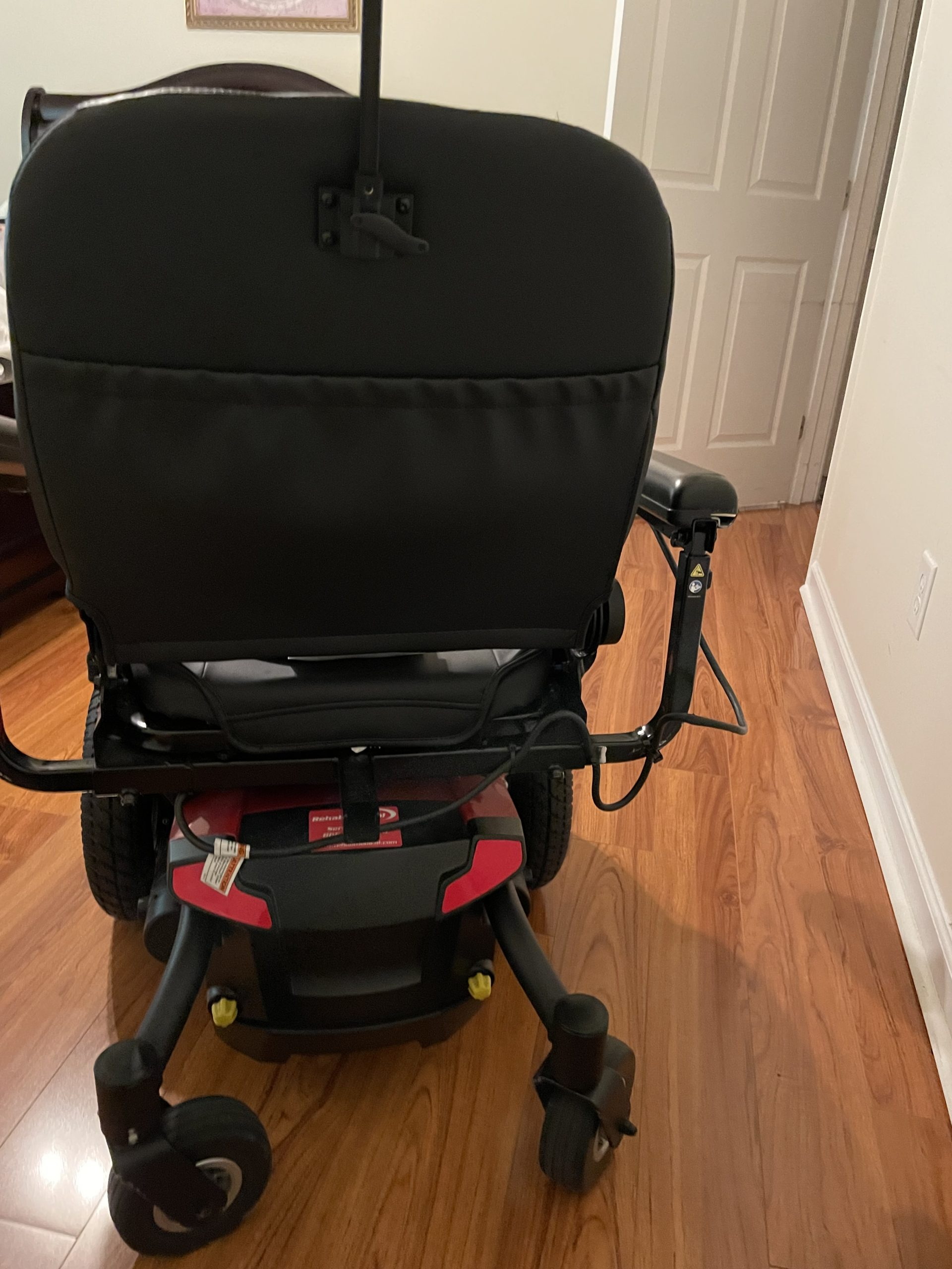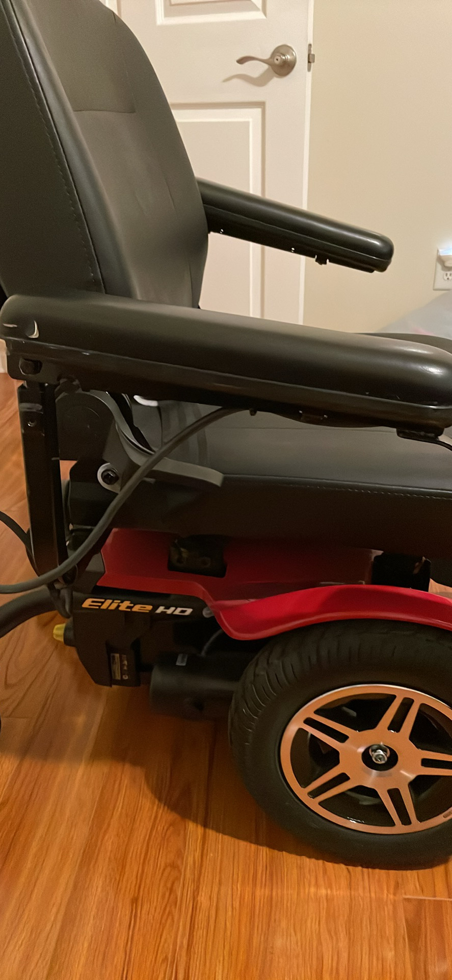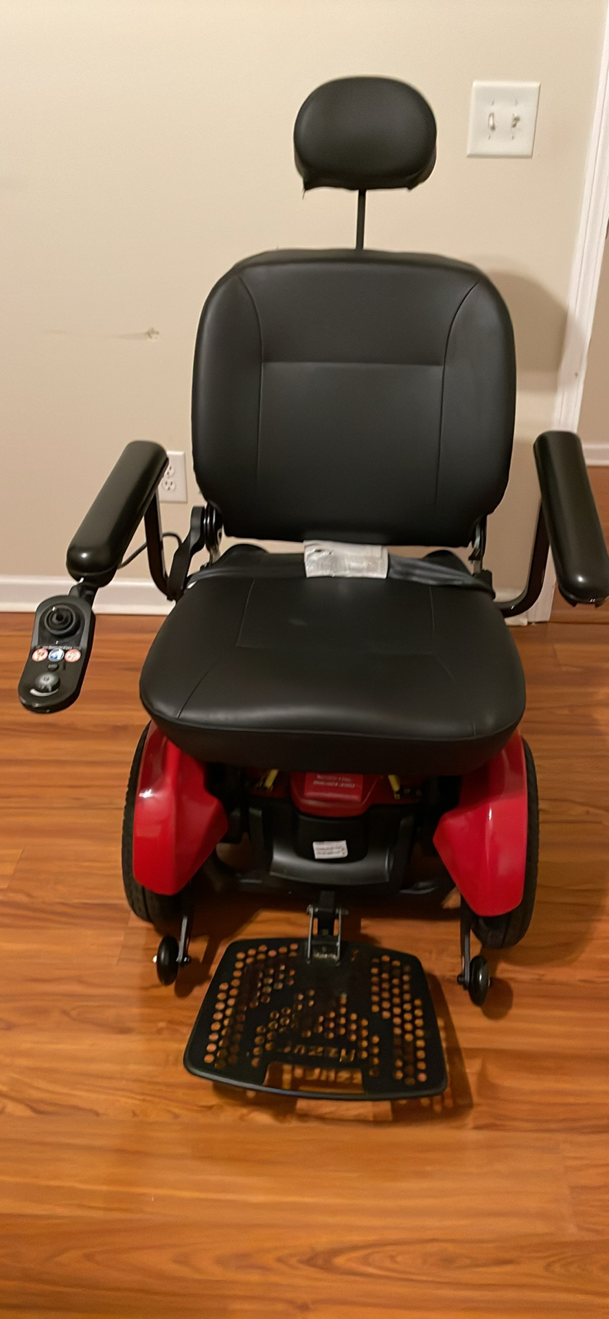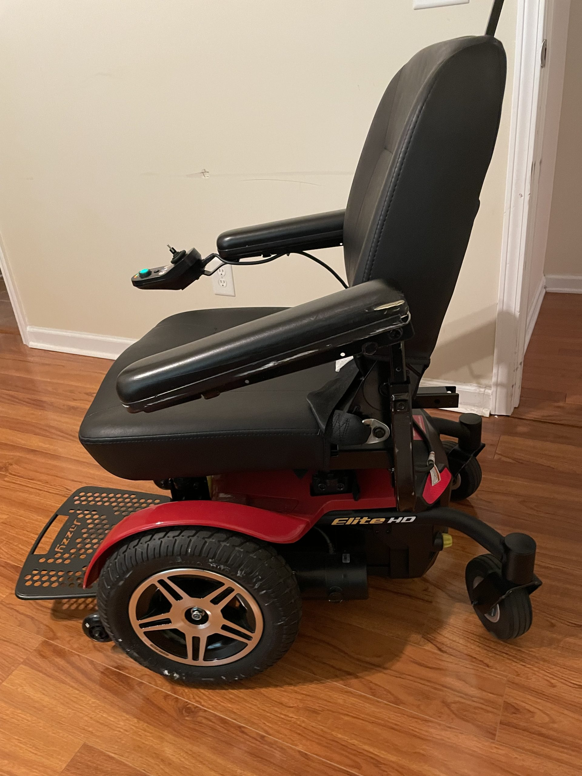 Jazzy Elite HD bariatric power wheelchair was purchased new in March 2023 and only used for approximately one year. It works great and is in good condition. The chair is red in color. It runs great and the charge lasts for days with normal use. It comes with a charger and also has a footrest. It has a maximum speed of 4 mph. The power chair has a turning radius of 24”. It has a ground clearance of 3” and has 3” solid anti-tip front wheels. The seat width is 21”. The seat depth is 21”. The power wheelchair can be switched to manual if it is needed to be pushed. As shown in the pictures, only one small approximately 1” tear on each arm of the wheelchair. The maximum weight is up to 450 lbs. The width of the chair is 29” so make sure it will fit through your doors. The wheelchair must be picked up in Flowery Branch, GA.