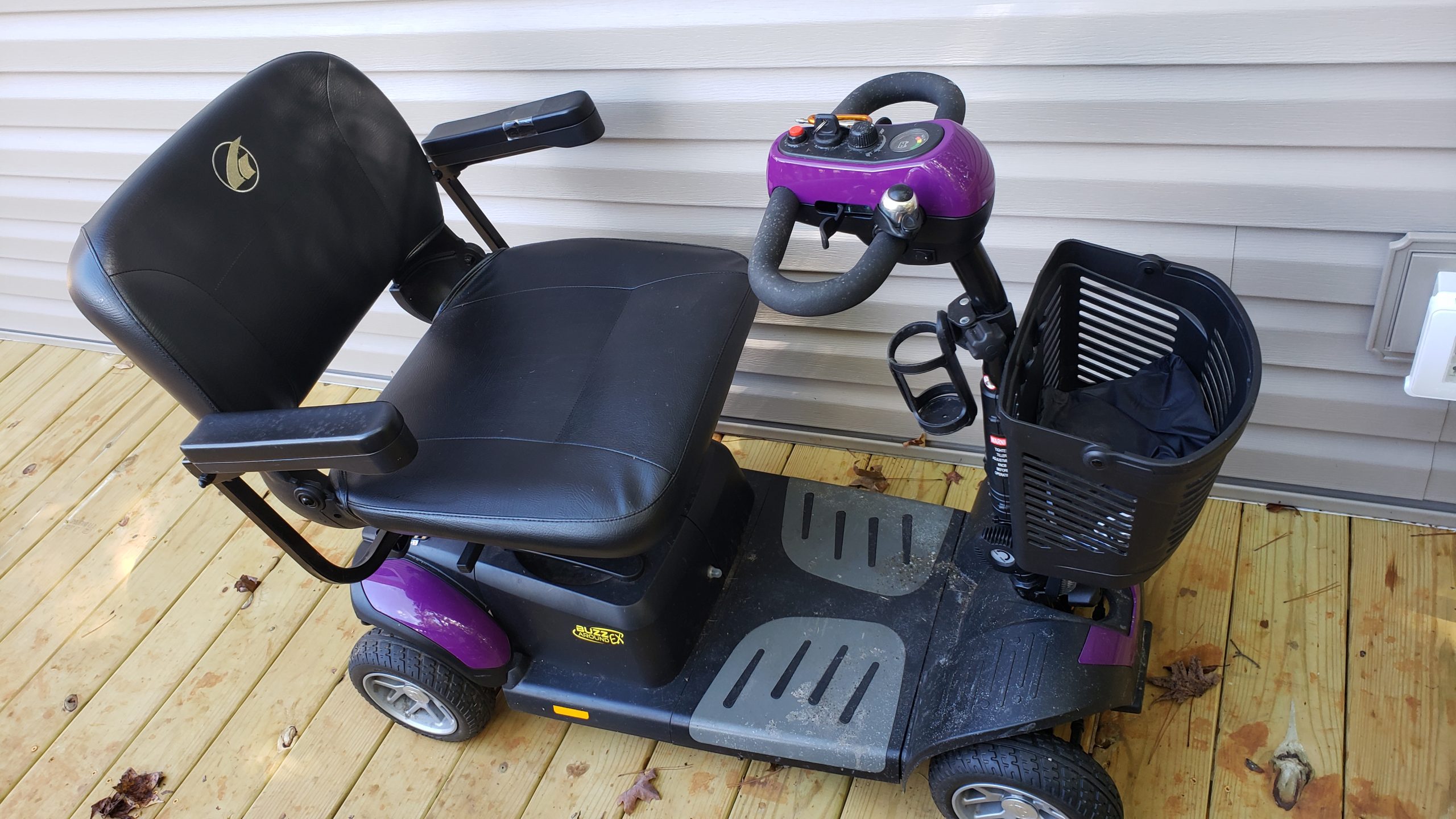 This scooter is in good condition. There is a small tear on the arm as shown in photos. Large 20" seat. Increased weight capacity up to 350 lb. Operating range up to 18 miles per charge. 5 MPH maximum speed. Battery holds a great charge. Included with the scooter: battery charger, panels to change the color from purple to red or blue, manual, 2 keys, and cover. The Buzzaround EX offers more standard features to make your riding experience better than ever. Featuring a wraparound Delta Tiller, a LED battery gauge, a wireless U1 battery, and a new ultra bright LED angle-adjustable headlight, the new Buzzaround EX is also longer to offer more foot room, with a great turning radius. The Buzzaround EX disassembles in seconds with just 4 easy steps making transporting it from one destination to another a breeze! Scooter is located in Harrisburg, NC. Contact me for more information.