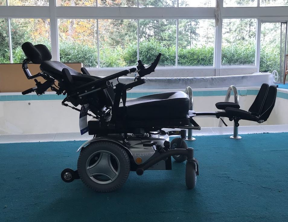 This wheelchair fully reclines, has power tilt, a deluxe high back seat, 14 in solid drive tires, extended floor plate, R-new joystick, goes 6.5 miles per hour, and has a tight turning radius.