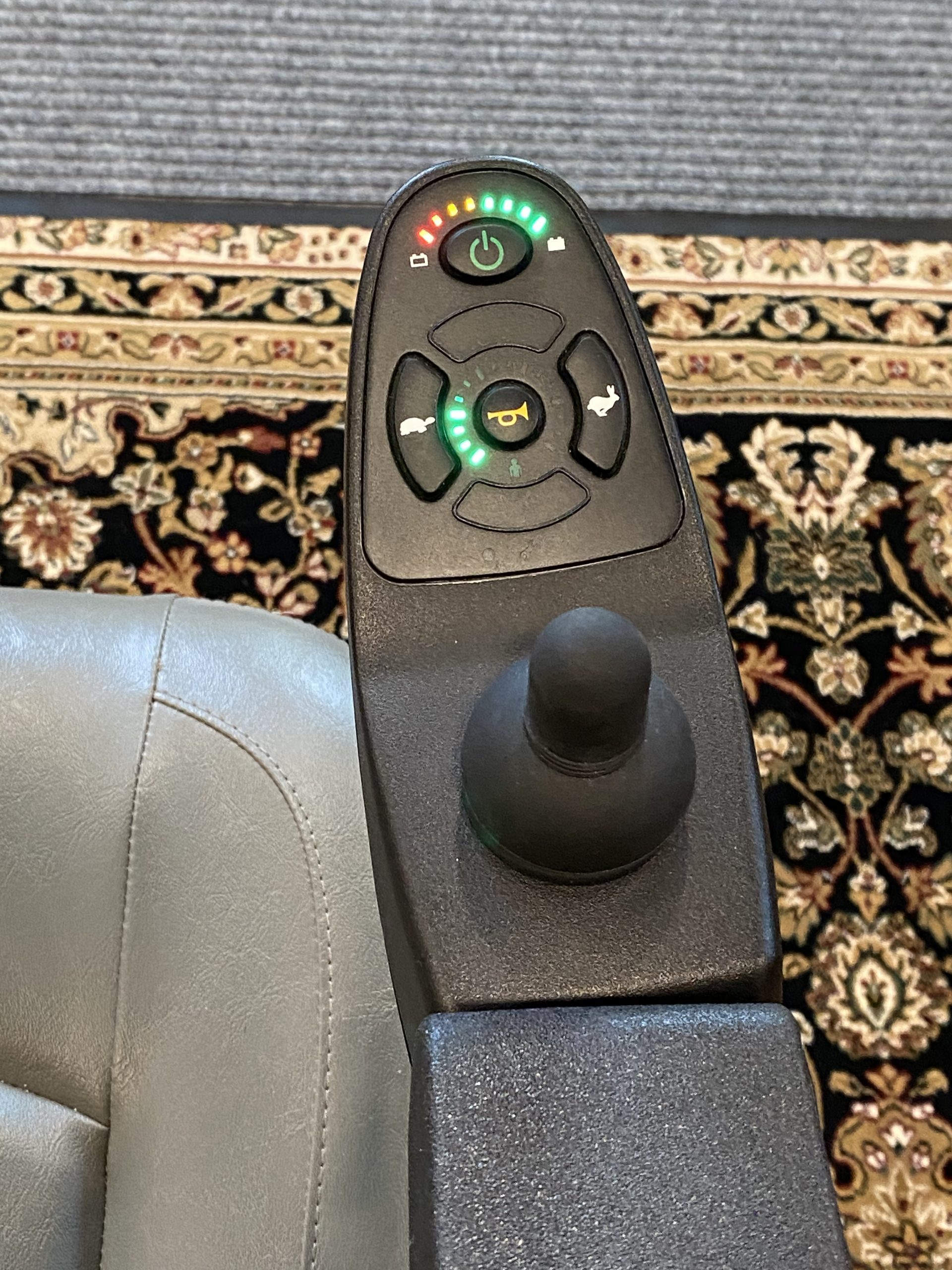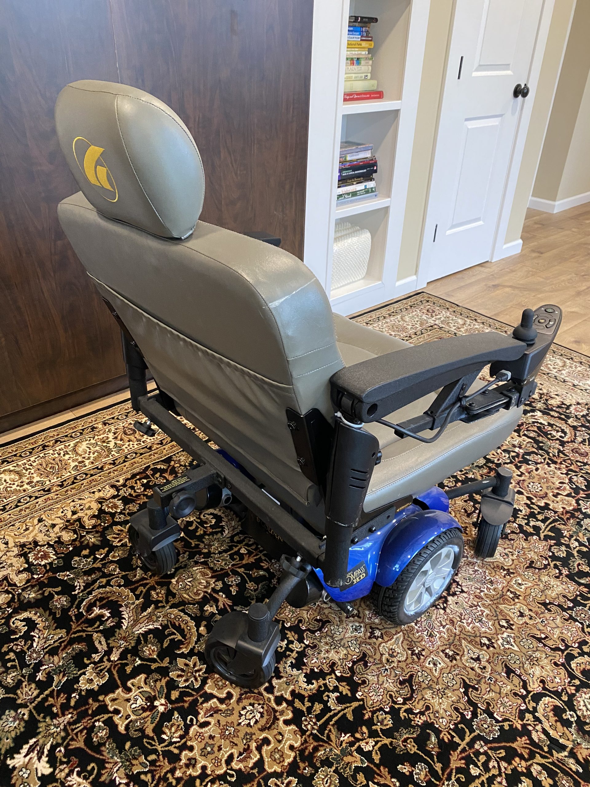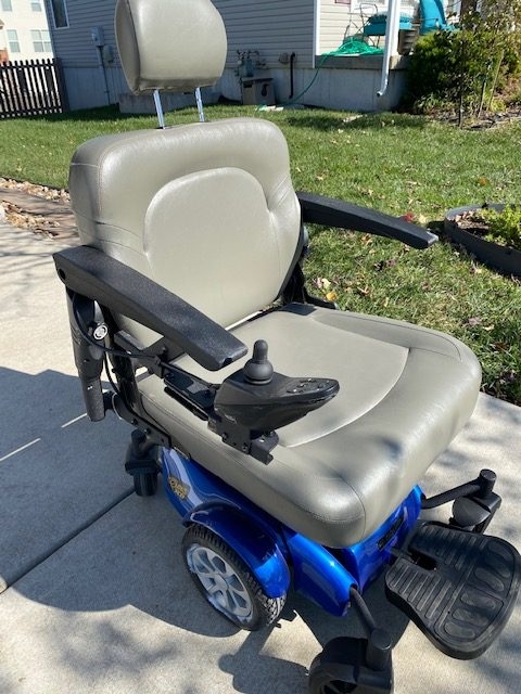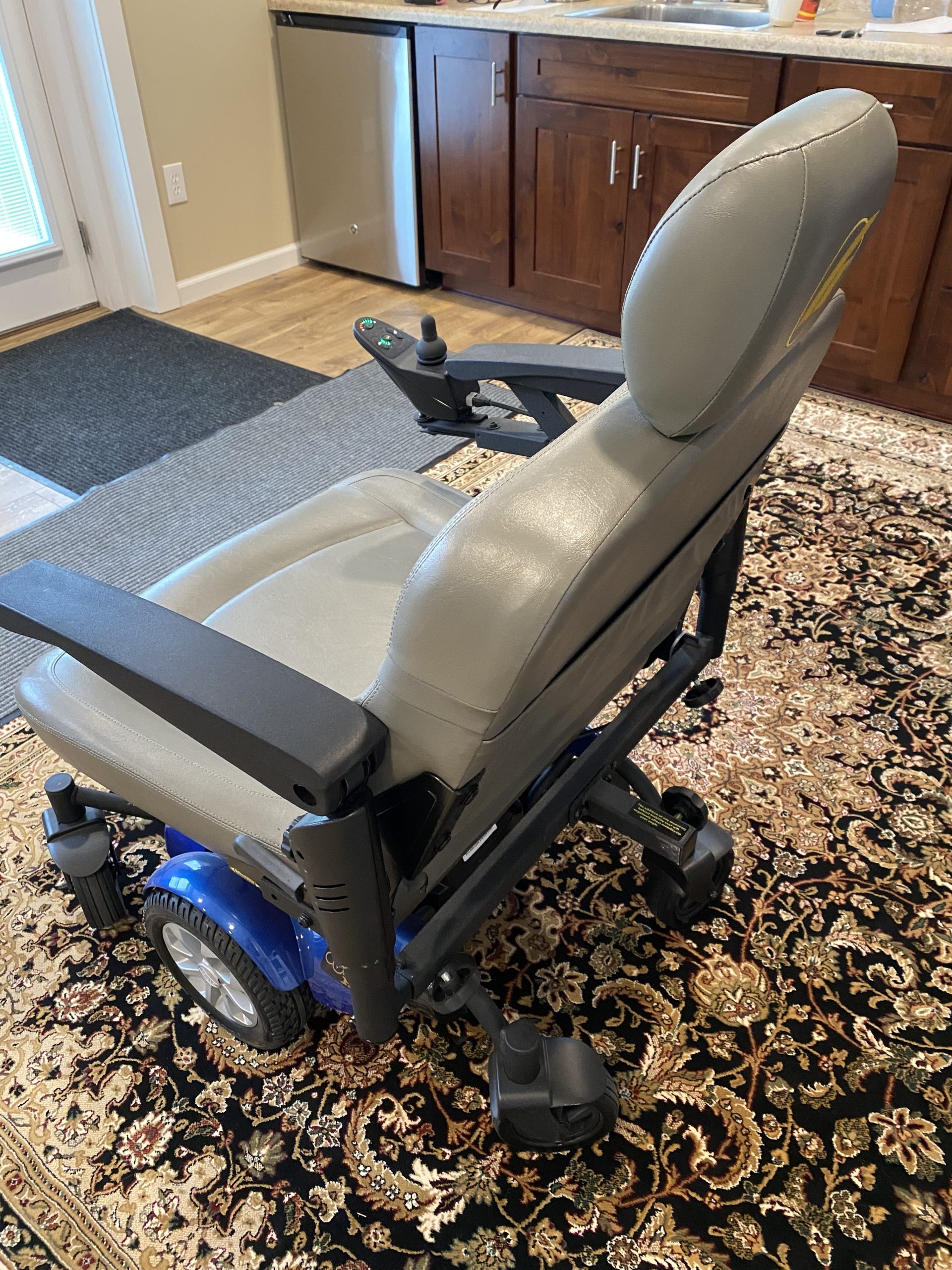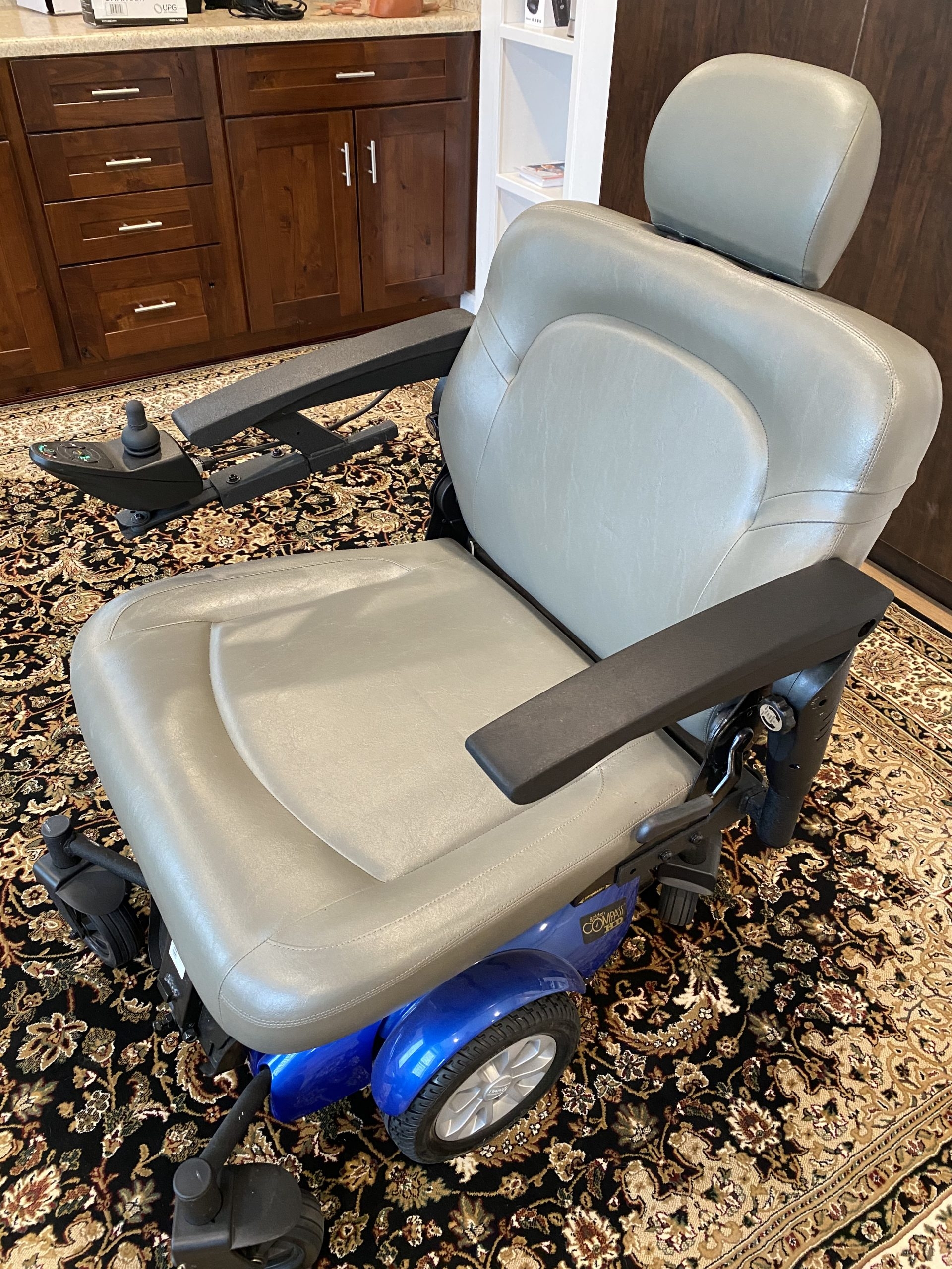 This is a Heavy-Duty 450lb capacity wheelchair with blue a body and housing. There is a universal bracket behind the seat which can allow for an oxygen tank to be mounted. The extension/holder piece is not included but is easily found online or from a local wheelchair store.