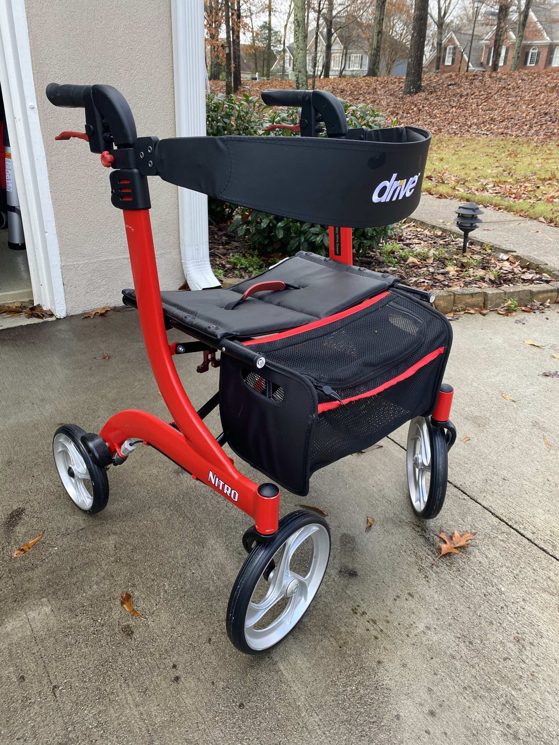 Supreme Value, Comfort and Mobility Drive Medical's Nitro Euro Style Rollator Walker in Tall Height was designed for those who want unmatched value along with proven comfort and convenience. With a sturdy and long-lasting frame made of lightweight aluminum, this walker is durable, yet easy to move around over all surfaces, giving you outstanding value, unmatched comfort, independence and ease of movement.Designed with your comfort, safety and convenience squarely in mind, the Nitro Euro Style Rollator Walker in Tall Height comes with large front wheels, giving you the ability and convenience of moving over most kinds of terrain, whether indoors or out, an easy task.The flexible height adjustable removable back and the height adjustable ergonomic handles conform to the individual needs of each user, thereby affording you the opportunity to customize the walker. You'll also note how the Nitro Rollator is easy to transport, due to the nature of its frame which allows you to fold it up with one hand.At the end of the day, The Nitro Euro Style Rollator in Tall Height is perfect solution for those who desire a convenient four wheel mobility enhancing walker that operates virtually anywhere and everywhere. Go ahead...Experience the Drive Difference Now!
