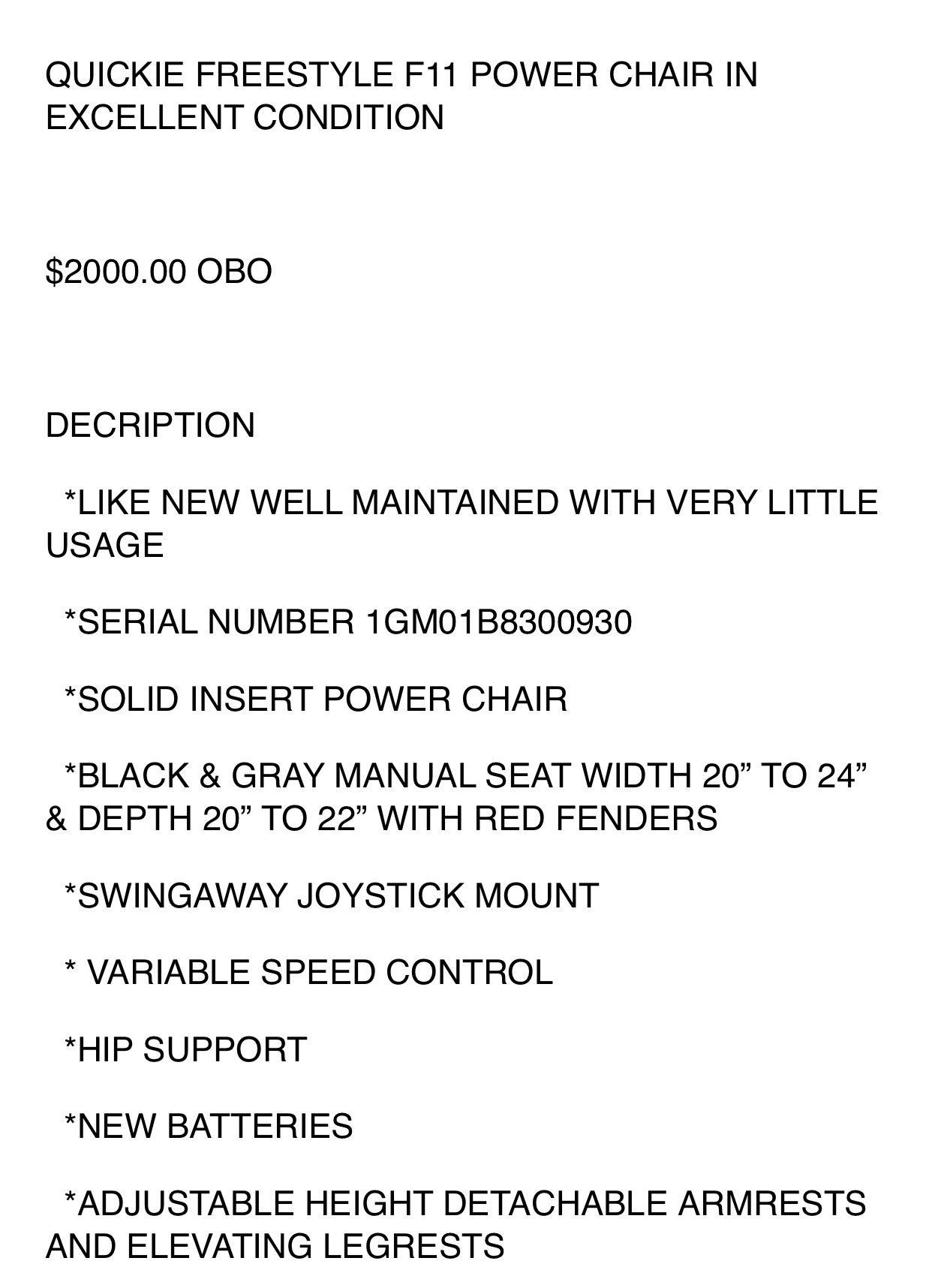 Quickee brand F11 electric wheelchair. Used in excellent condition. New batteries within a year and ready to go. Info listed in pictures.