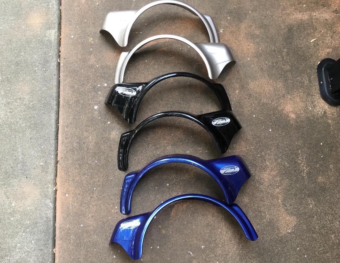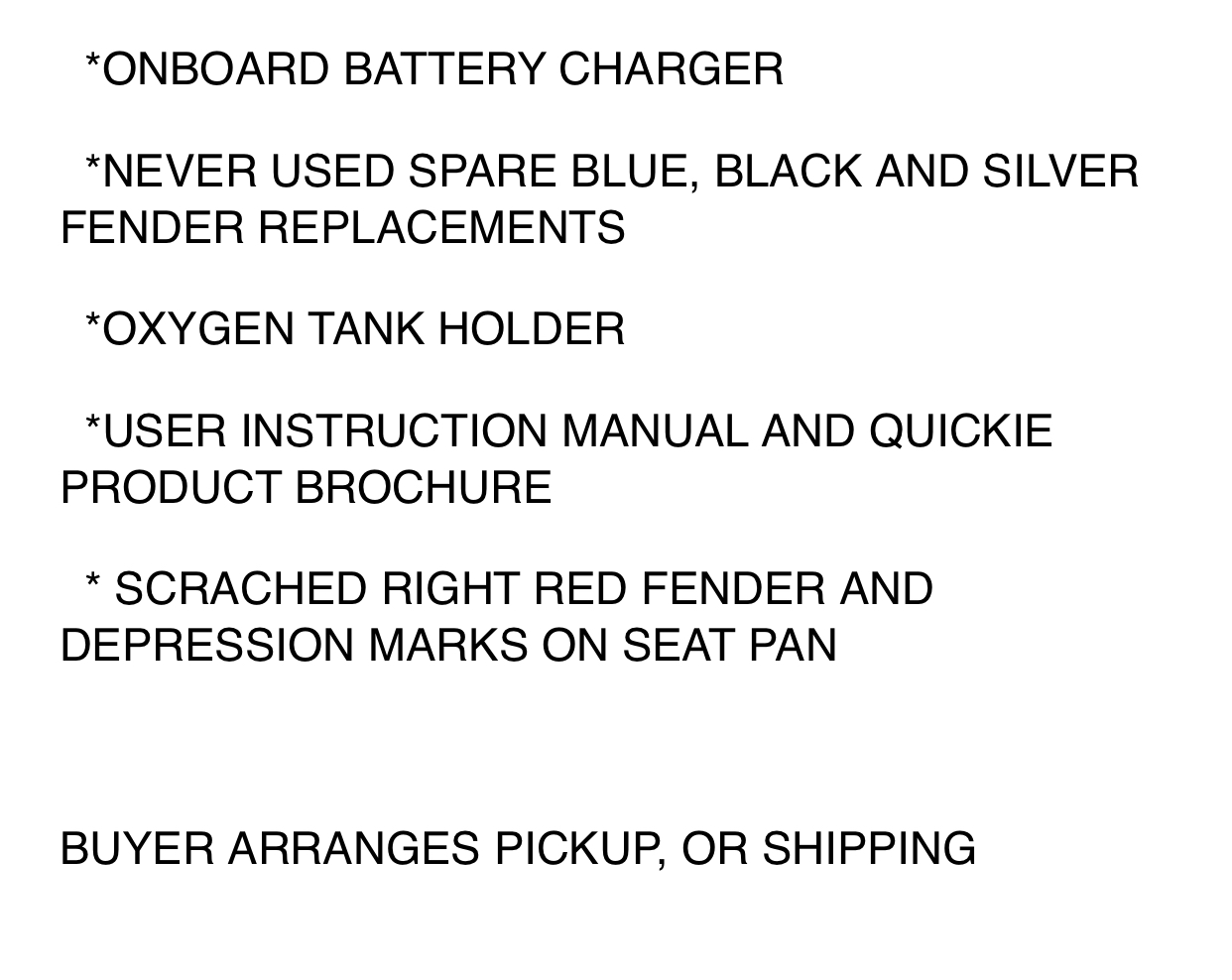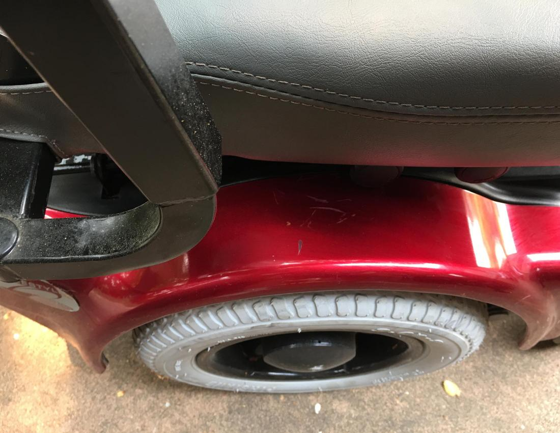Swing away joystick mount. Variable speed controls. Hip support. On board battery charger. Several fender replacements.