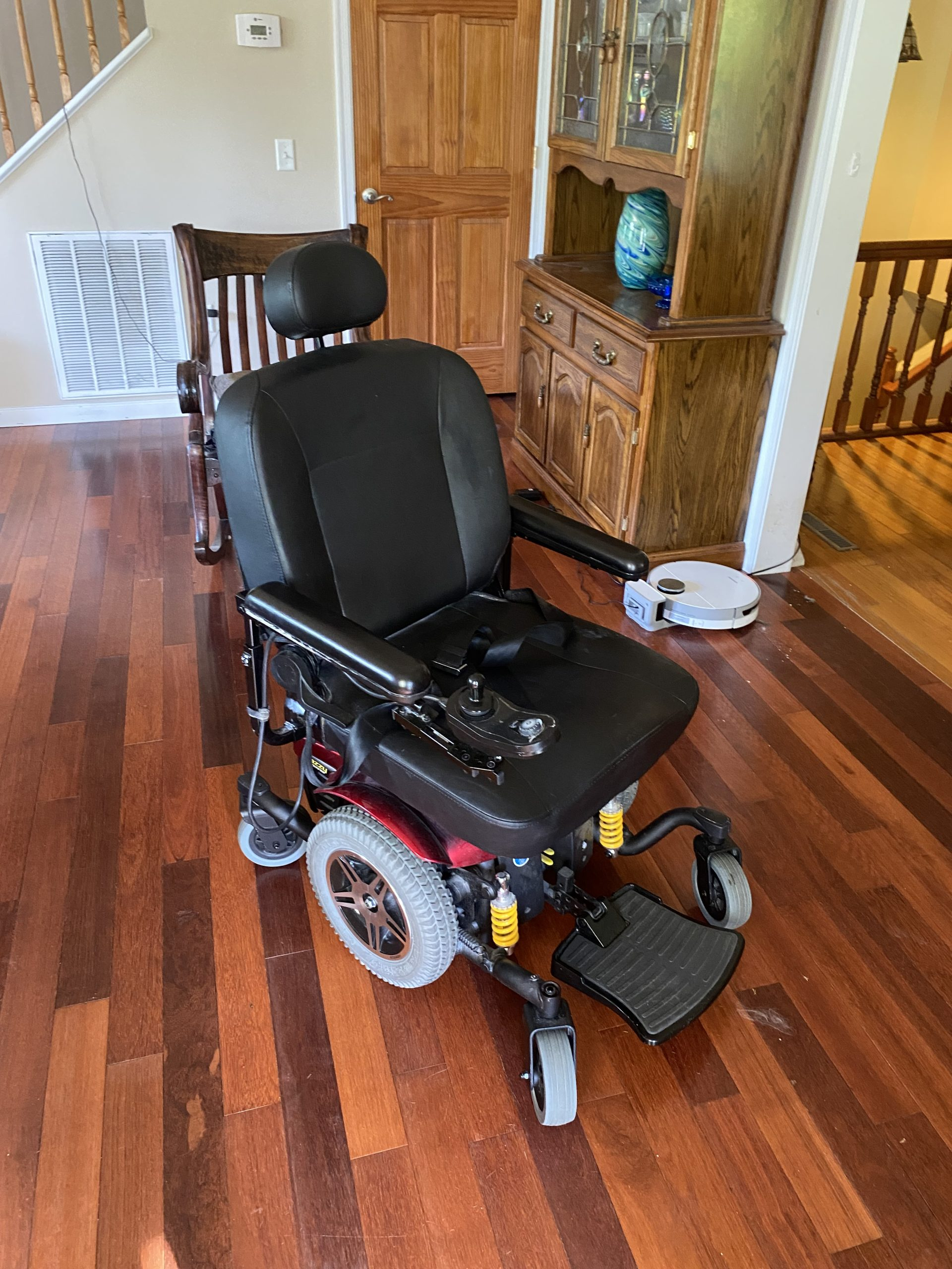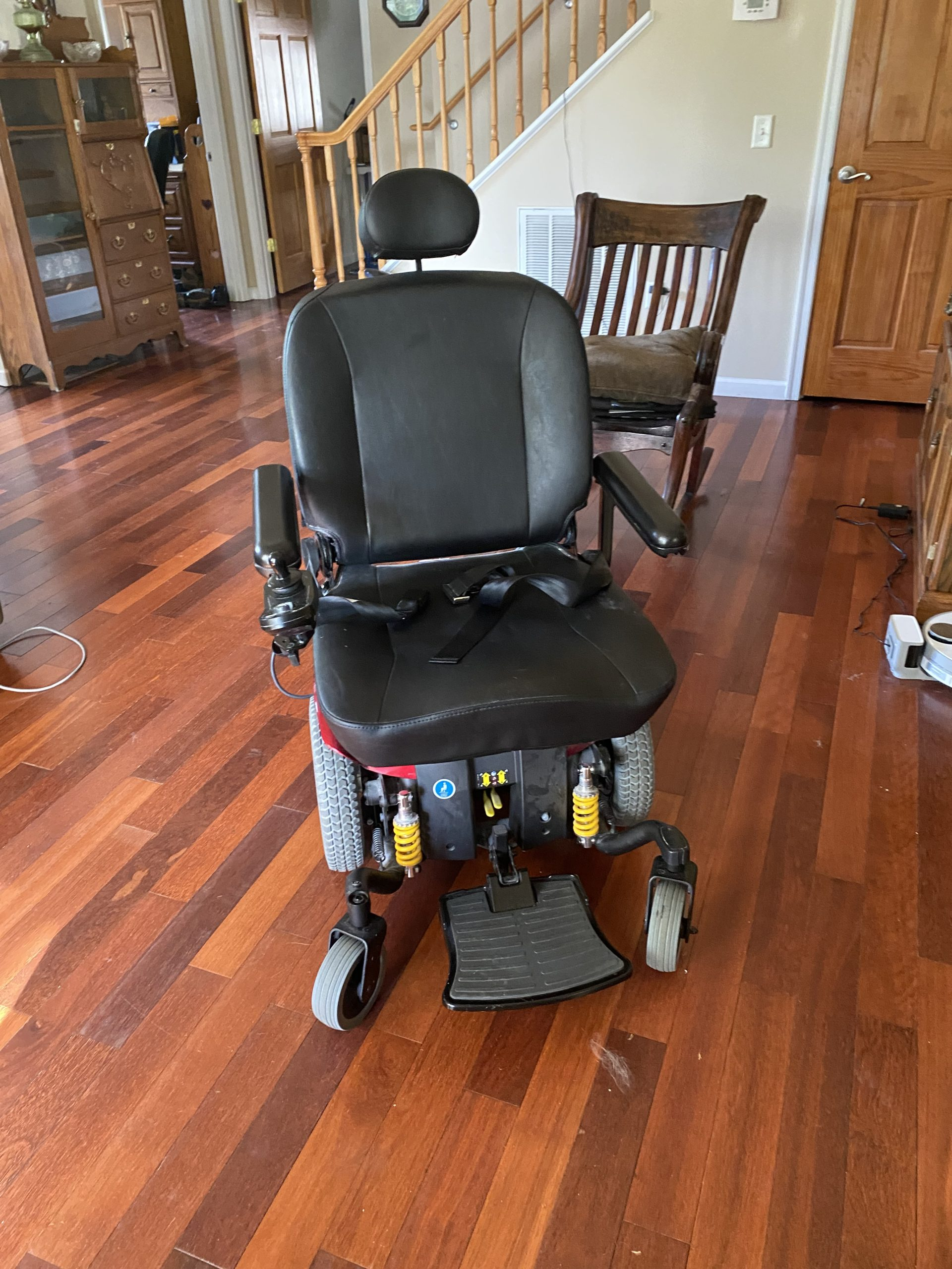 This is a Jazzy electric wheelchair. It is years old and in very good condition. My wife used it around the house and had no problem navigating turns and riding through doorways. It runs smoothly rides nicely and is easy to operate. The speed is easy to control which is helpful for going downhill or ramps. The back folds down over the seat and it fits in a regular-size minivan. You must have the back folded down to fit. We used a metal ramp from the back of our minivan to drive the wheelchair up and into the back. We have stow-and-go seating so with the seats of the van down there is plenty of room for the chair and the ramp, you must take the ramp with you to get the chair out for shopping, restaurants, etc. I can send a video of it working if needed. I am located in Harrisonburg Va. My email is davidcrullrealestate@gmail.com
