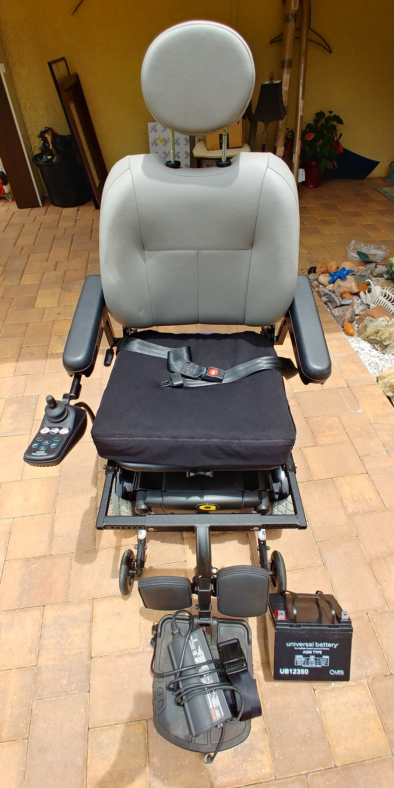 Wheelchair is in new Condition, never used. Family member health declined before it could be used. Unit is a compact, sporty mid-wheel drive design offering excellent tight quarter maneuvering and performance.
