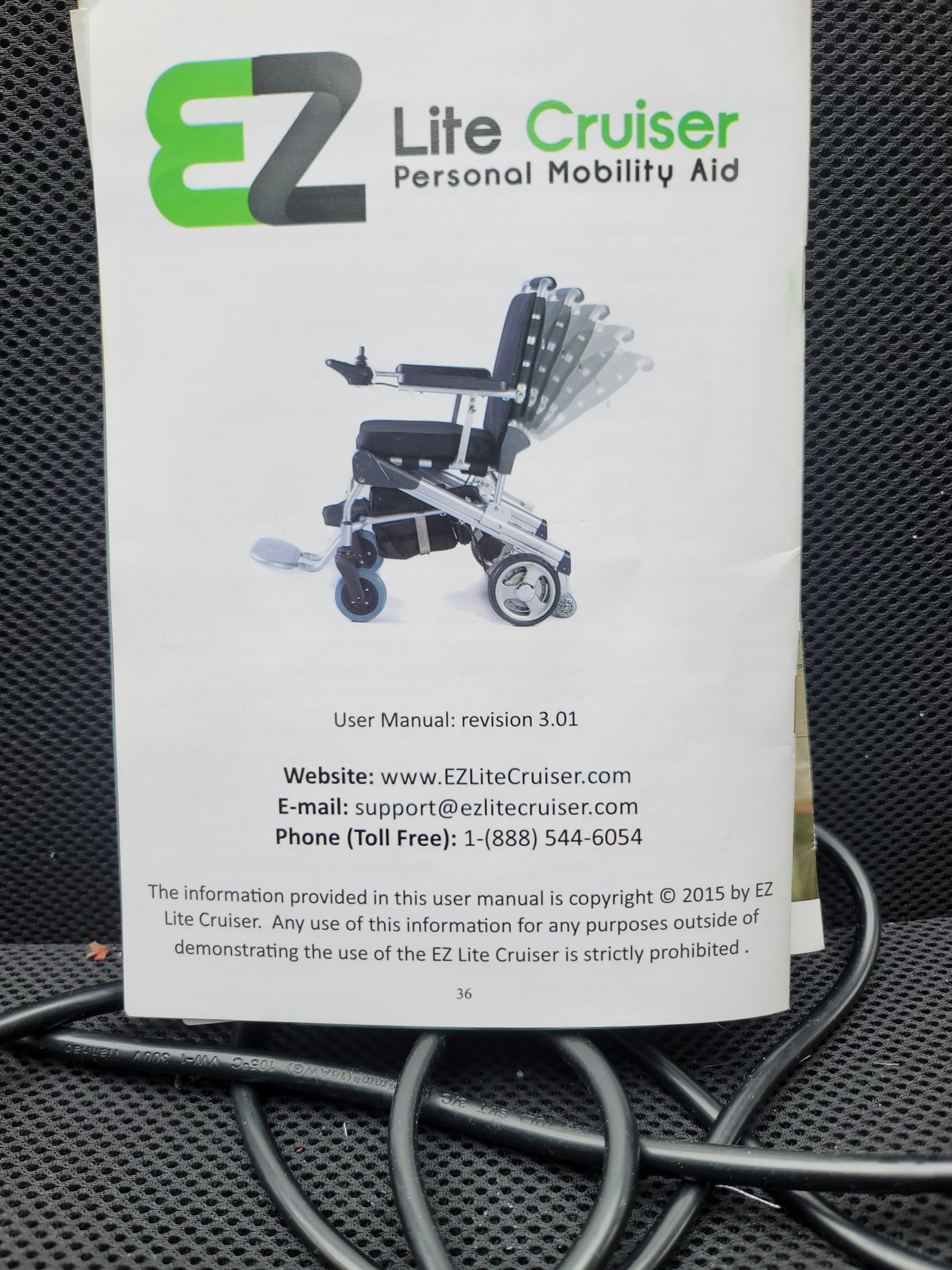 EZ Lite Cruiser Power Chair. Used, Like-New . Excellent cosmetic appearance and is in good working condition. This power chair was well maintained and has had very little use. Has a 24V 10AH Lithium battery for long life. It folds up for easy storage and transportation. Comes with the original owners manual. A battery charger is included. Free delivery is offered with 50 miles Bel Air, MD 21014.