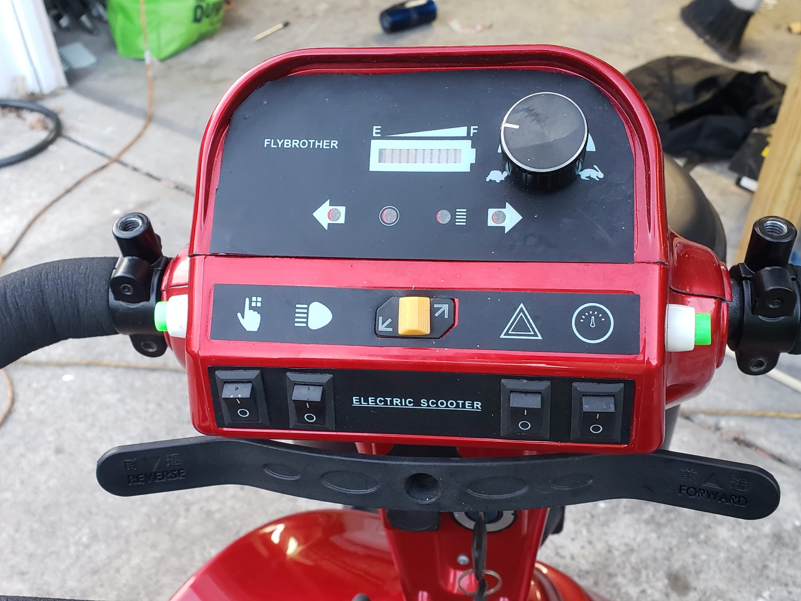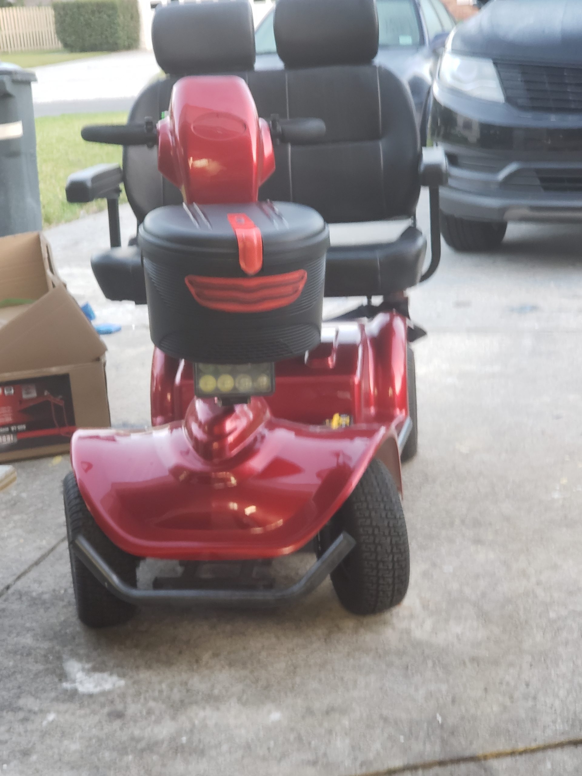 This is a new in 2020 Flybrother 2 seater mobility scooter. It is a full size, 4 wheel, all terrain mobility scooter, perfect for outdoor use. Has a spacious seat for two individuals with seatbelts and armrests. It has a 400 pound capacity. Speedy 8 MPH top speed, 15 Mile Range. Large 13 inch tires, and 4 wheel coil over suspension for a smooth ride. 8 inch ground clearance helps tackle obstacles. It includes 2 12V 38AH Batteries. A bright front LED headlight shows the way at night with with rear stop and turn signals. Includes rear view mirrors on tiller handle. Front basket.