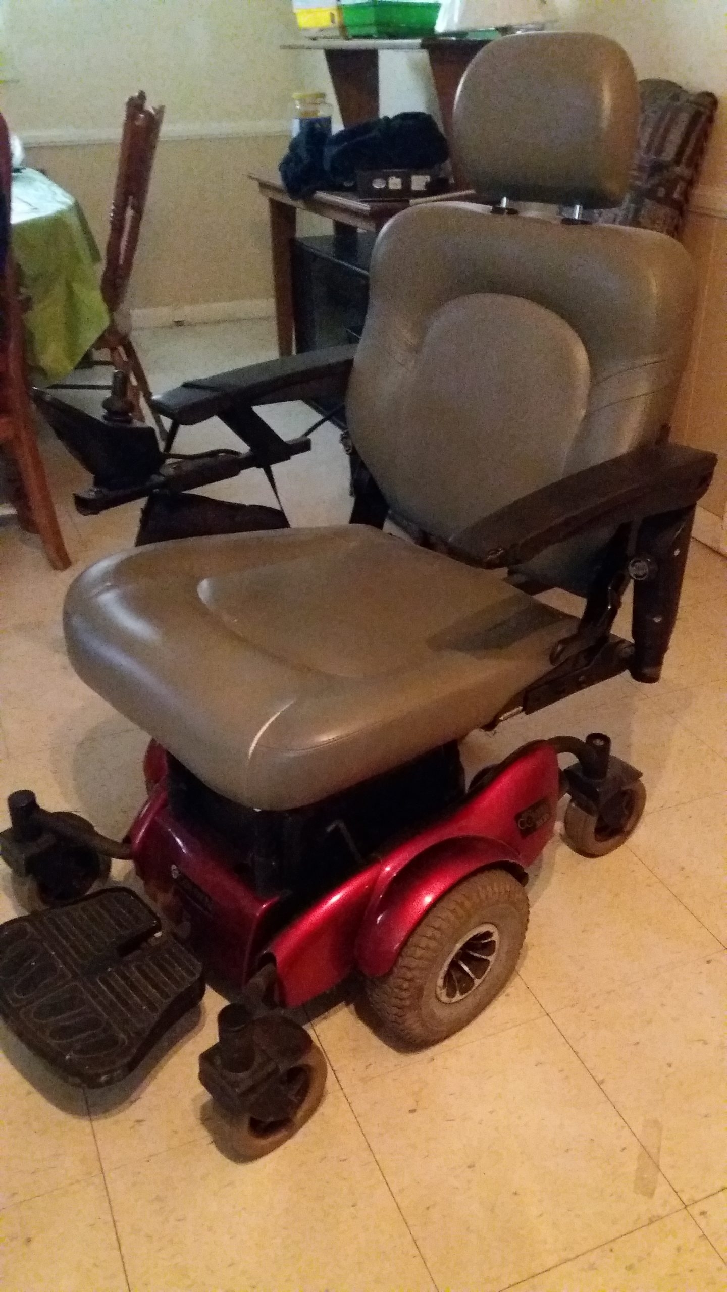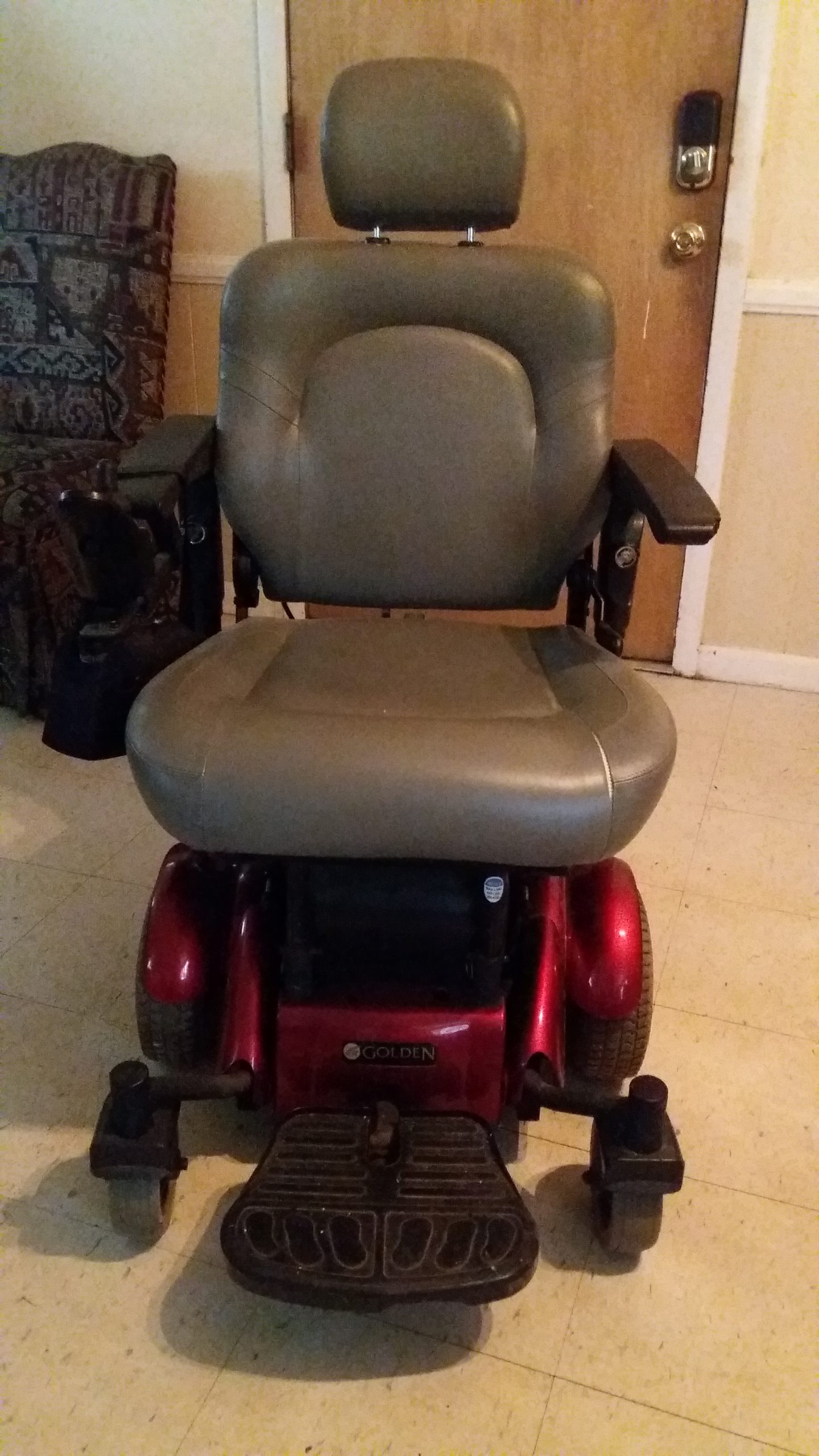 I inherited this chair when my mother passed away last fall. This Golden Compass HD Power chair is the heavy duty model, and is rated up to 450 pounds. The chair is in very good condition. While I do not know exact date of purchase, I do know she had the chair less than 2 years, prior to her passing. The chair has two battery chargers that go with it. It also has a cover that goes with it. There are very small scratches under the arms, where she got too close to dining room chairs. Gray leather seat, with a red base. Mom was a large lady, and this chair handled her weight well. Asking 1100.00 for chair. Willing to deliver within 50 mile radius for additional 50.00. You would be responsible for having any necessary help or ramps, etc. needed to get the chair into your house upon delivery.