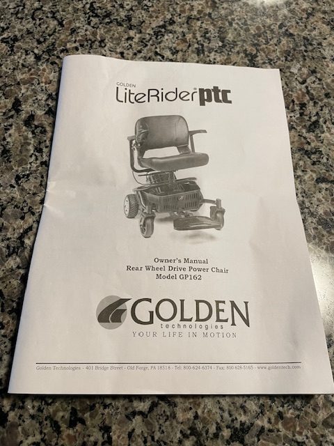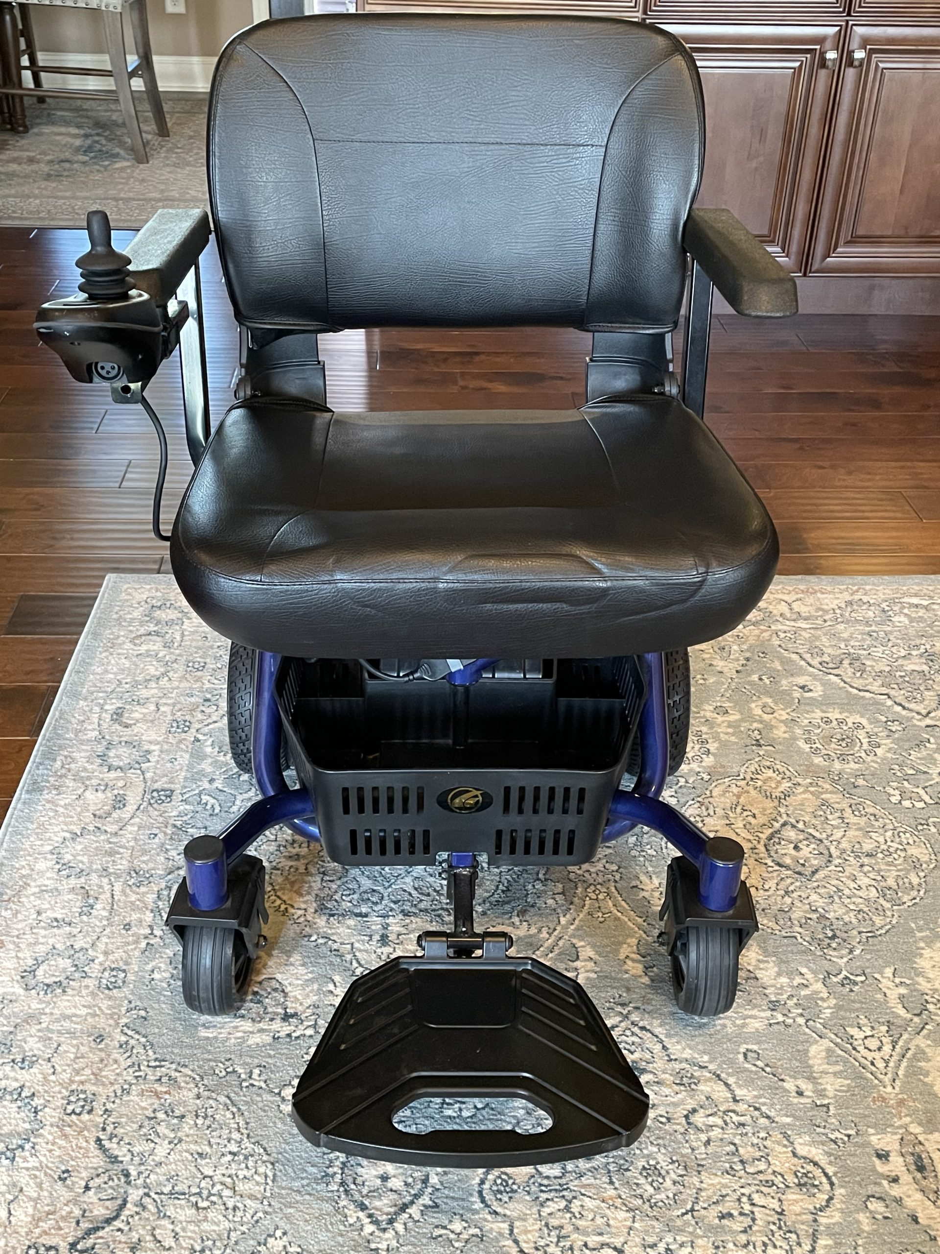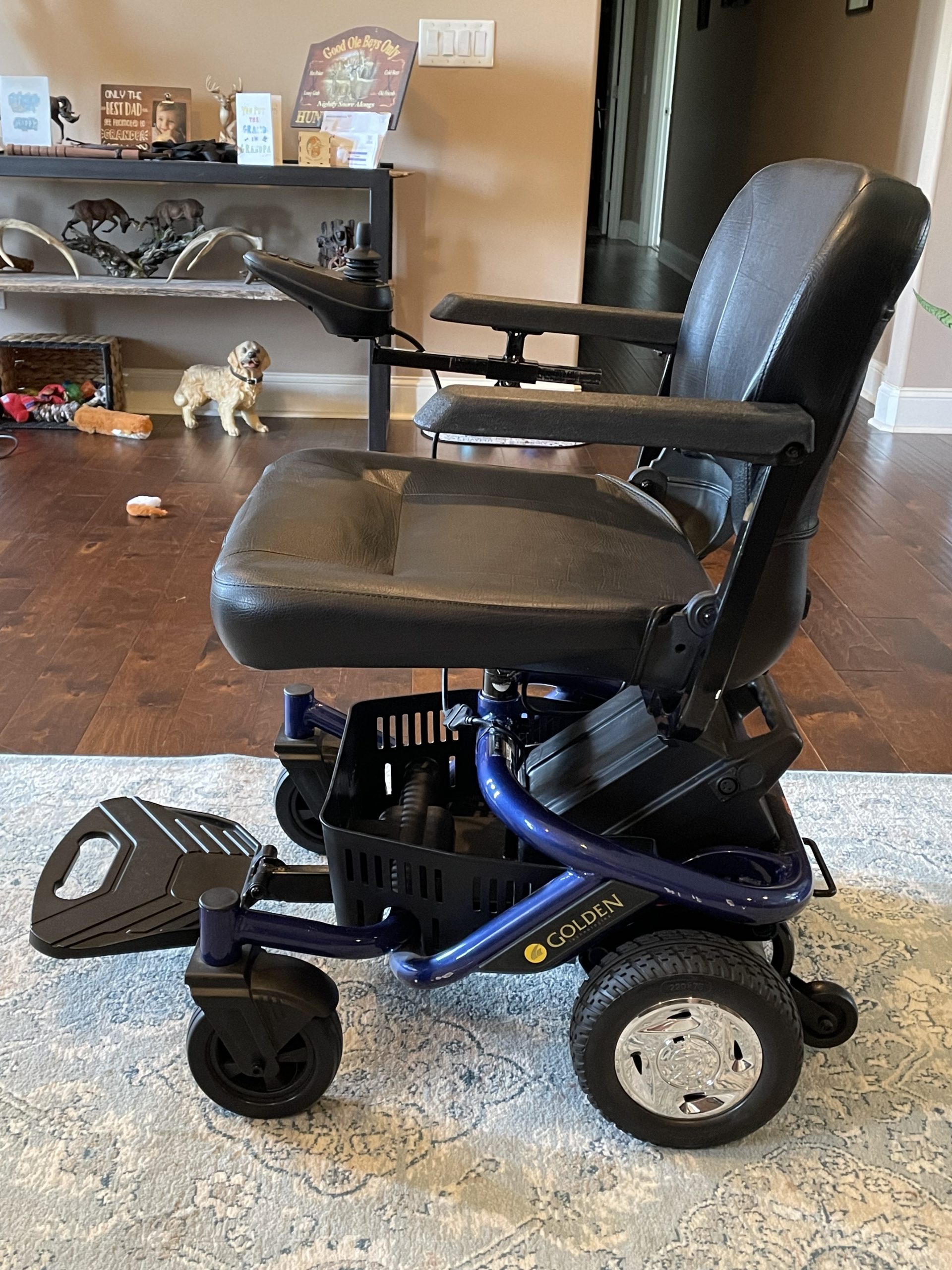 This is a "Golden" brand power wheelchair with the manual and battery charger included. It was used very little and is in great condition although it does have a few scratches. We just purchased new batteries for it that come with an additional 3-month extended warranty when you register the batteries. It works great with no problems! It has a battery indicator on the arm that will let you know how much battery is left and when it needs charging. The batteries charge in a couple of hours. It has 5 speeds on it and has a zero-turn radius. Honestly, the low speeds are pretty fast. The seat back folds down, the arms raise up and the footrest raises as well. It was my mother's, and I don't know exactly how old it is. It does break down for easy transportation and it fits nicely into a trunk.