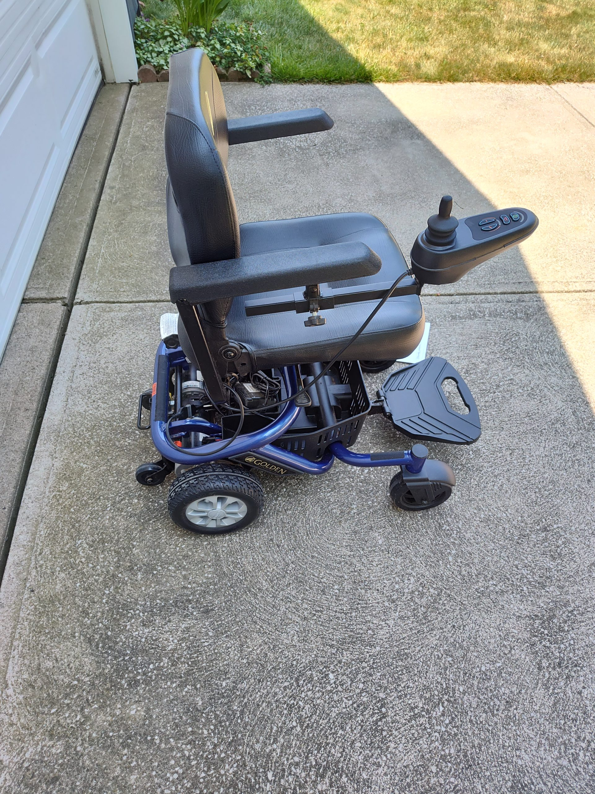 This chair was purchased in 2017 for my mother to use in an assisted living facility. Unfortunately, she passed away after using it for only 2 weeks. Since that time, the chair has been unused and securely stored at my home. The chair is a Golden Rear Wheel Drive Power Chair Model GP162 and is essentially brand new. All leather areas are in excellent condition with no tears or stains. The joystick can be mounted for either right or left-hand use. The battery is fully charged and operable. The chair is located in Eastlake Ohio.