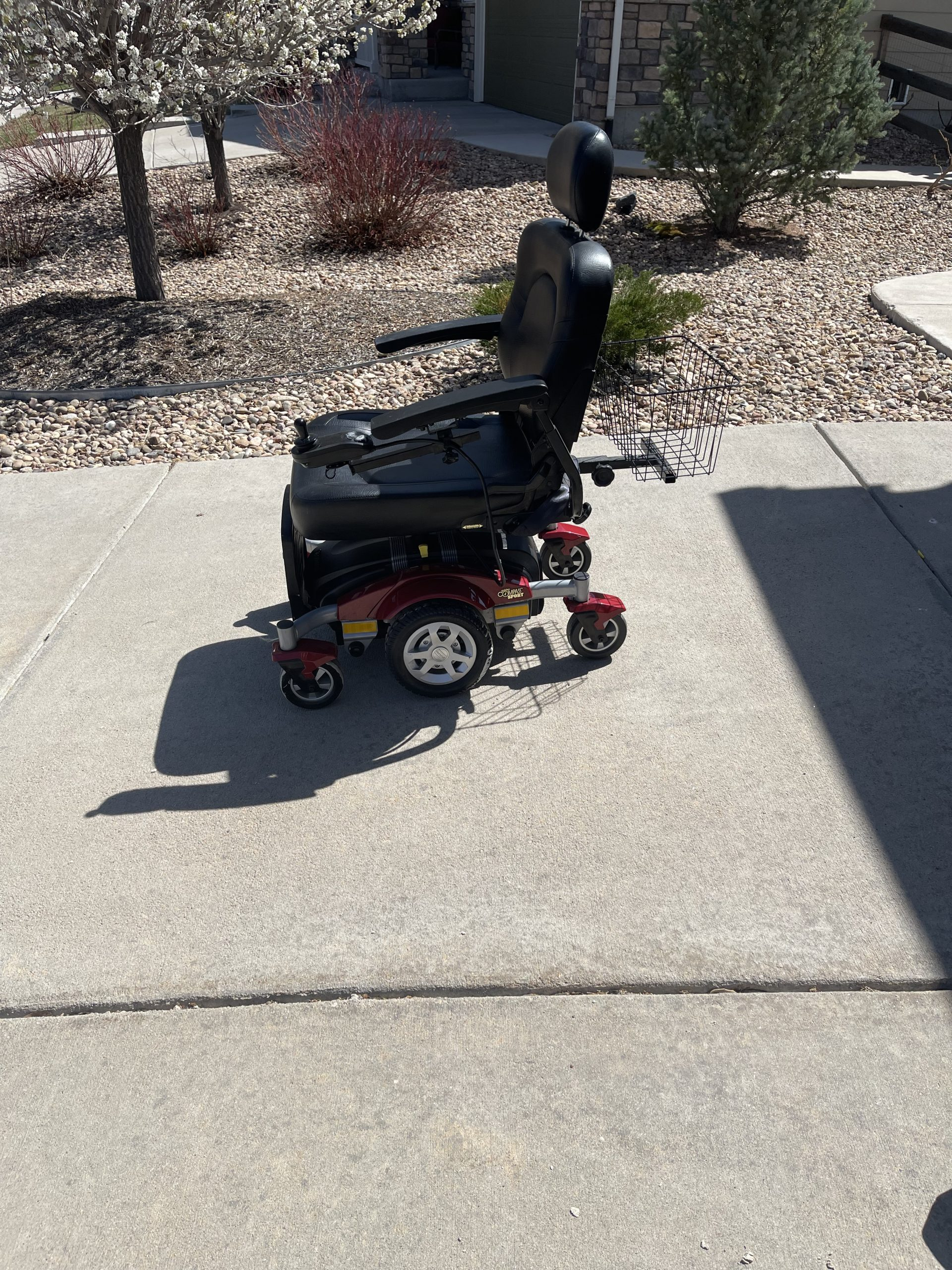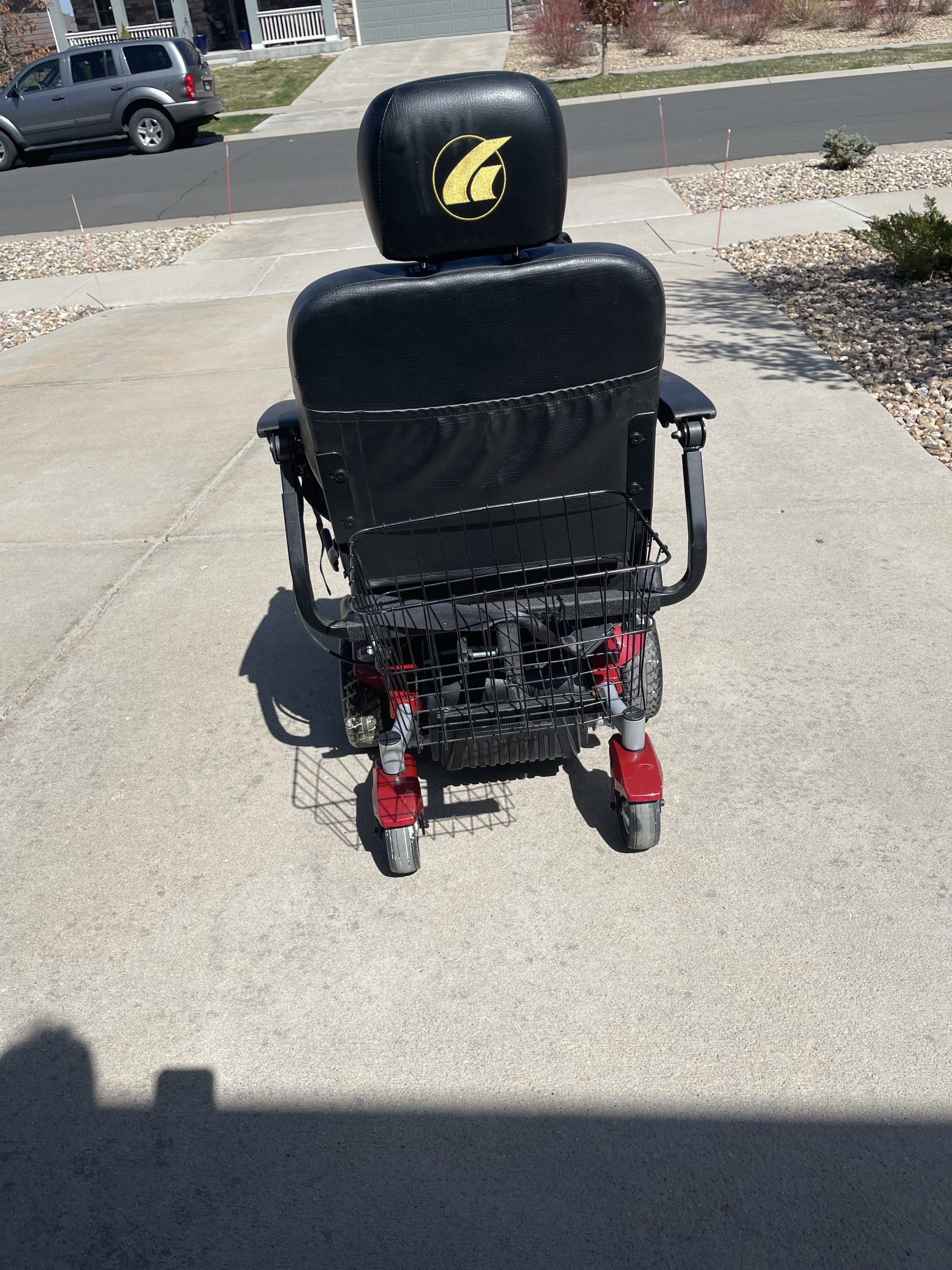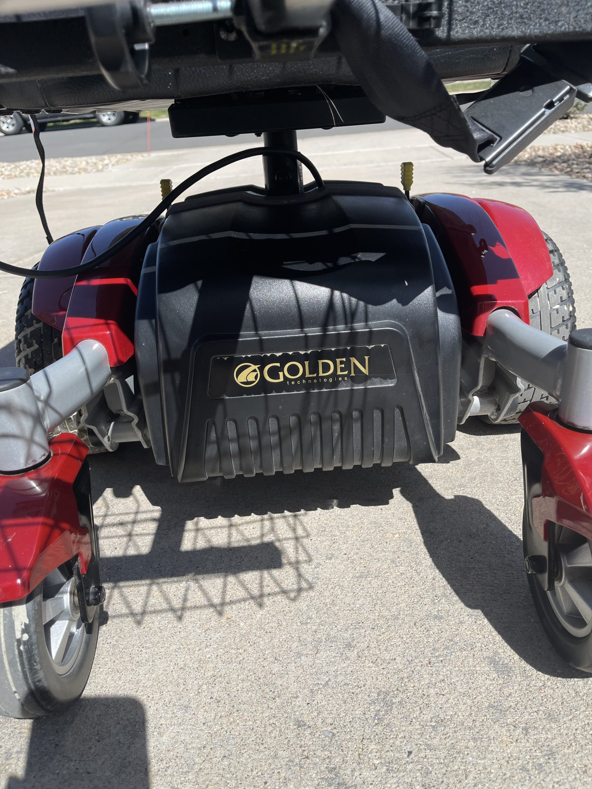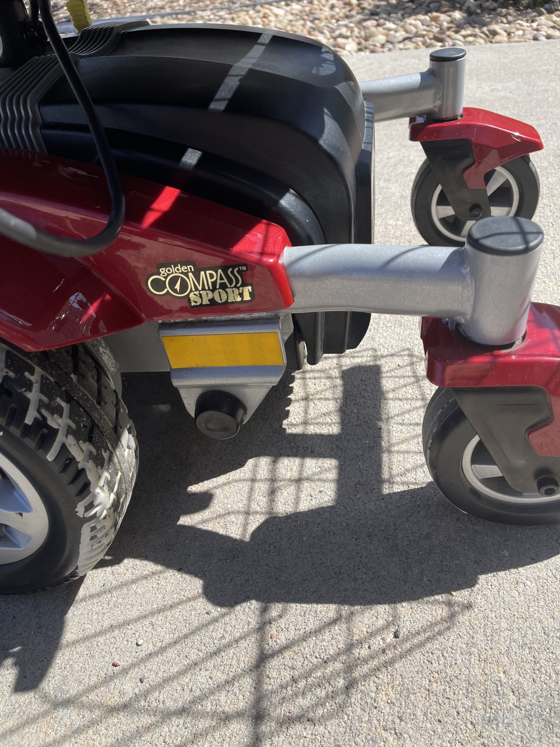 This Golden Technologies Compass Sport was purchased on 11/2022 and has had no maintenance issues. It is a red candy apple with a black seat. The seat is a 20” x 20” Captain's Chair with an adjustable footplate. It has adjustable speed so it can go as fast or as slow as needed. It has dual batteries. Also included is a removable wire basket that attaches to the back of the Captain's Chair, a travel cover, and a safety flag. The wire basket has enough space for a couple of bags of groceries. This chair was used sporadically - on average once a week for short walks and was only taken on sidewalks and asphalt streets. Its overall condition is good. The seat is quite comfortable if one has to sit in it for longer periods of time. One of the tires has some caulking on it that we have not been able to remove.