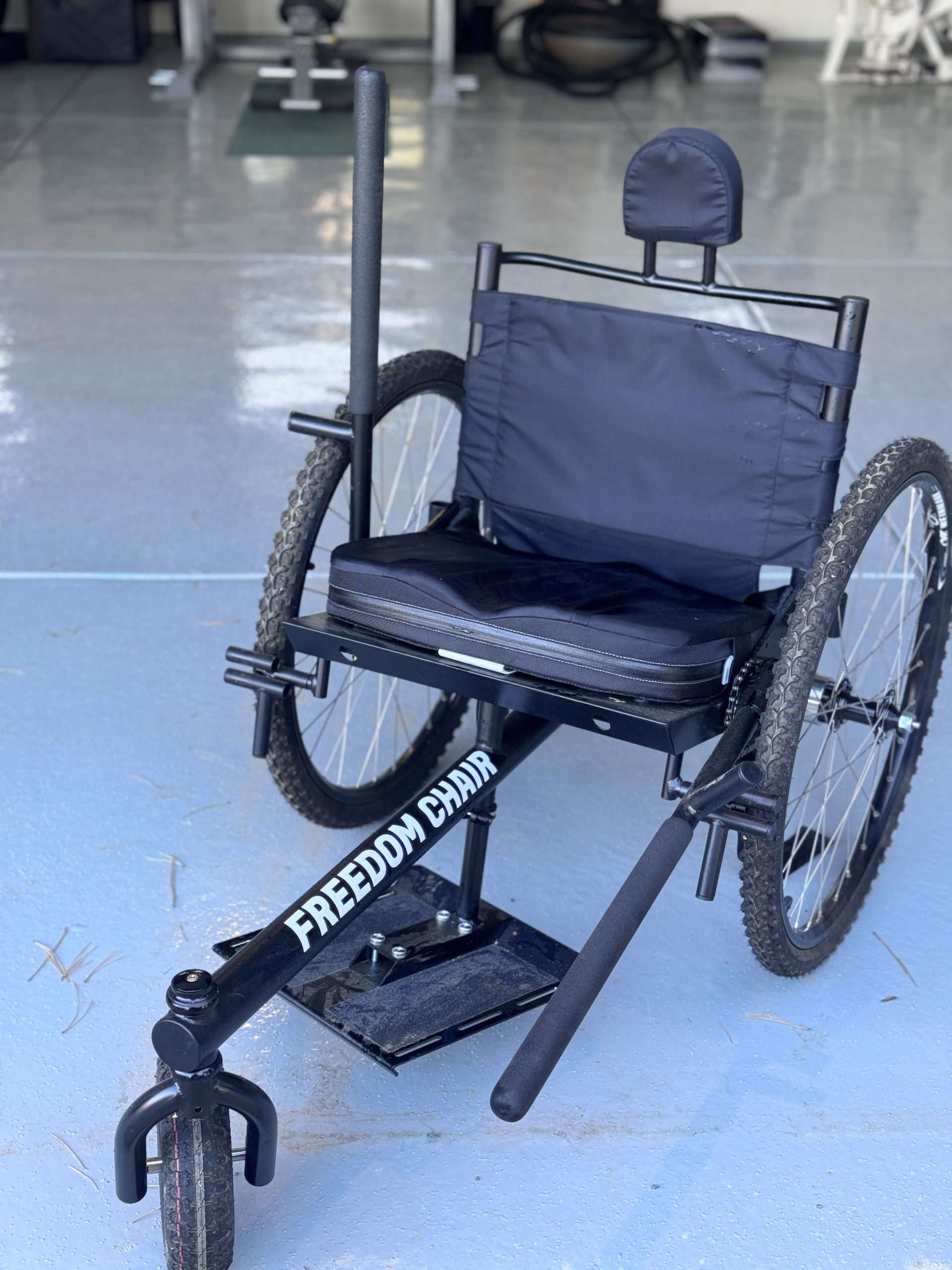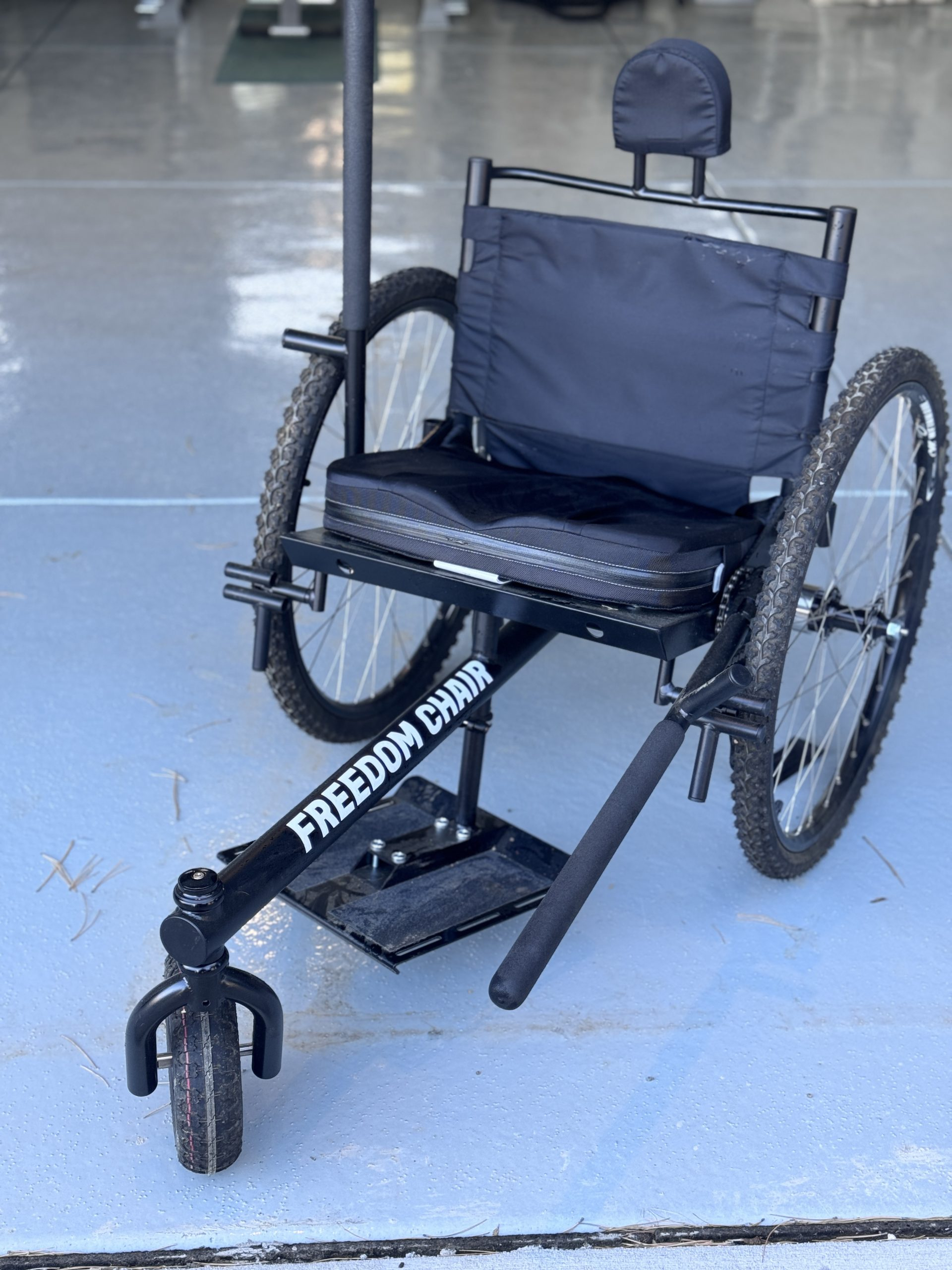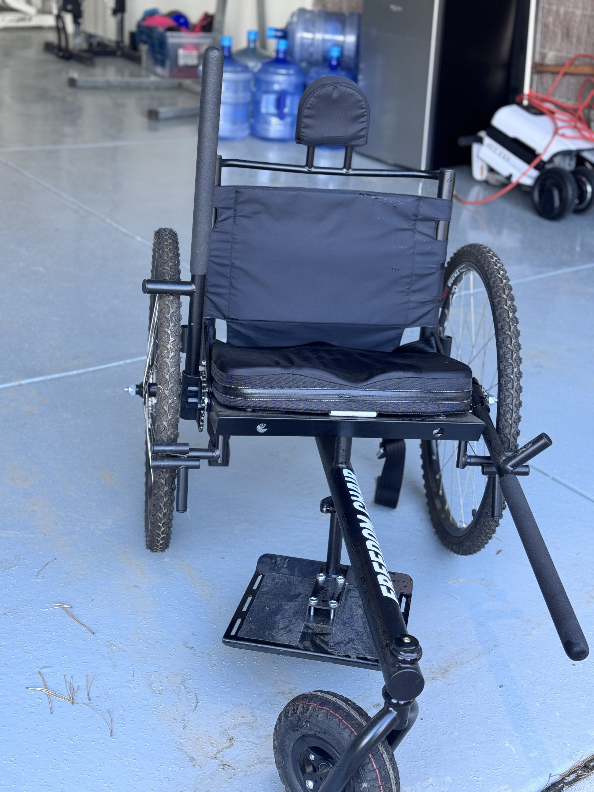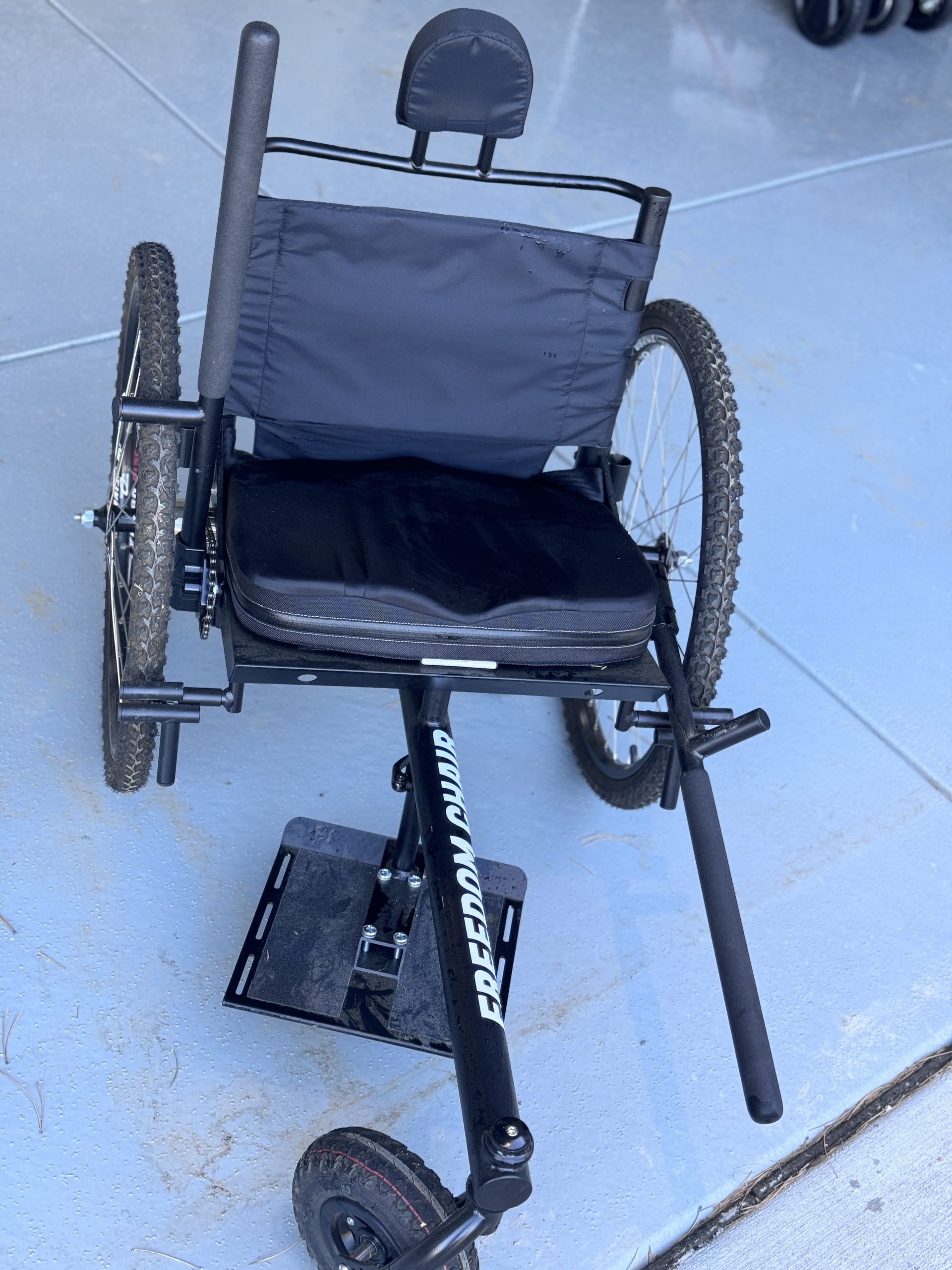 Used once in our yard. Has Drive-rain Upgrade, meaning it can ride really fast. The all-terrain wheelchair, GRIT Freedom Chair: 3.0, uses mountain bike parts, a manual lever-drive system, and simple maintenance to prepare you for any adventure. This is a manual wheelchair. The patented lever drive on this off-road wheelchair makes it twice as efficient as a standard wheelchair. To accelerate, push one or both levers forward. To brake, pull the levers back toward your body. It’s that easy. Quick-release hardware allows for disassembly in less than one minute. This all-terrain wheelchair fits in any vehicle, making it easy to get to the trailhead, airport, or beyond. Use it as a hiking wheelchair, beach wheelchair, rough terrain wheelchair, fishing wheelchair, and more -- there are few limits to the places you can go with GRIT. Stay safe with the all-terrain wheelchair seatbelt and adjustable parking brakes, plus mounting points for additional straps. This chair’s three-wheeled design distributes your weight so you can ride confidently through grass, gravel, snow, packed beach sand, and more! A key feature of any true, off-road wheelchair (or any outdoor wheelchair) is easy maintenance. For this reason, the GRIT Freedom Chair 3.0 is built primarily with off-the-shelf bicycle parts. For maintenance and repairs, either go to GRIT or to your local bike shop for maintenance, just like you would a mountain bike. The GRIT Freedom Chair is the top-rated wheelchair for all-terrain use and is enjoyed by thousands of off-road wheelchair riders around the world.