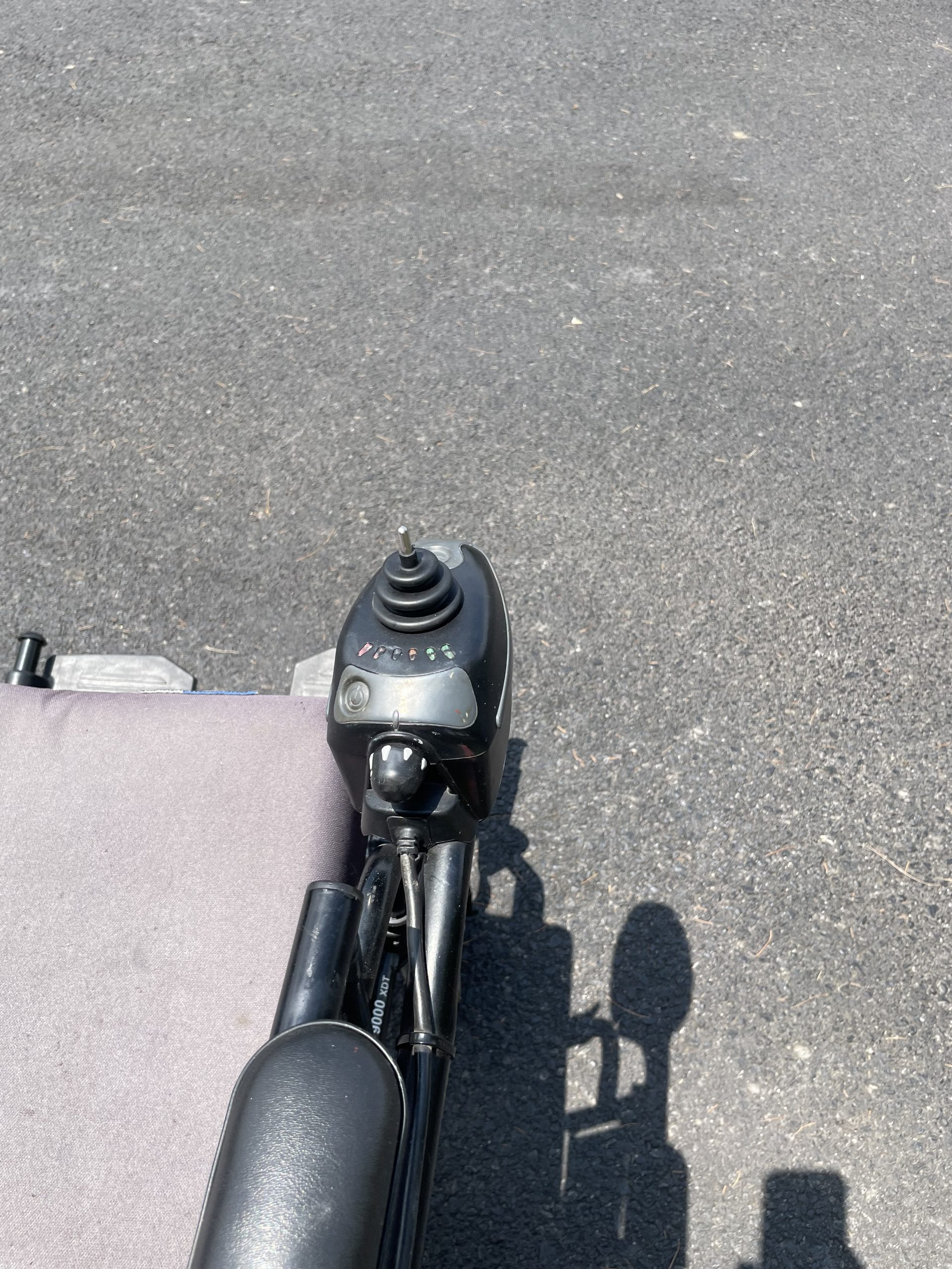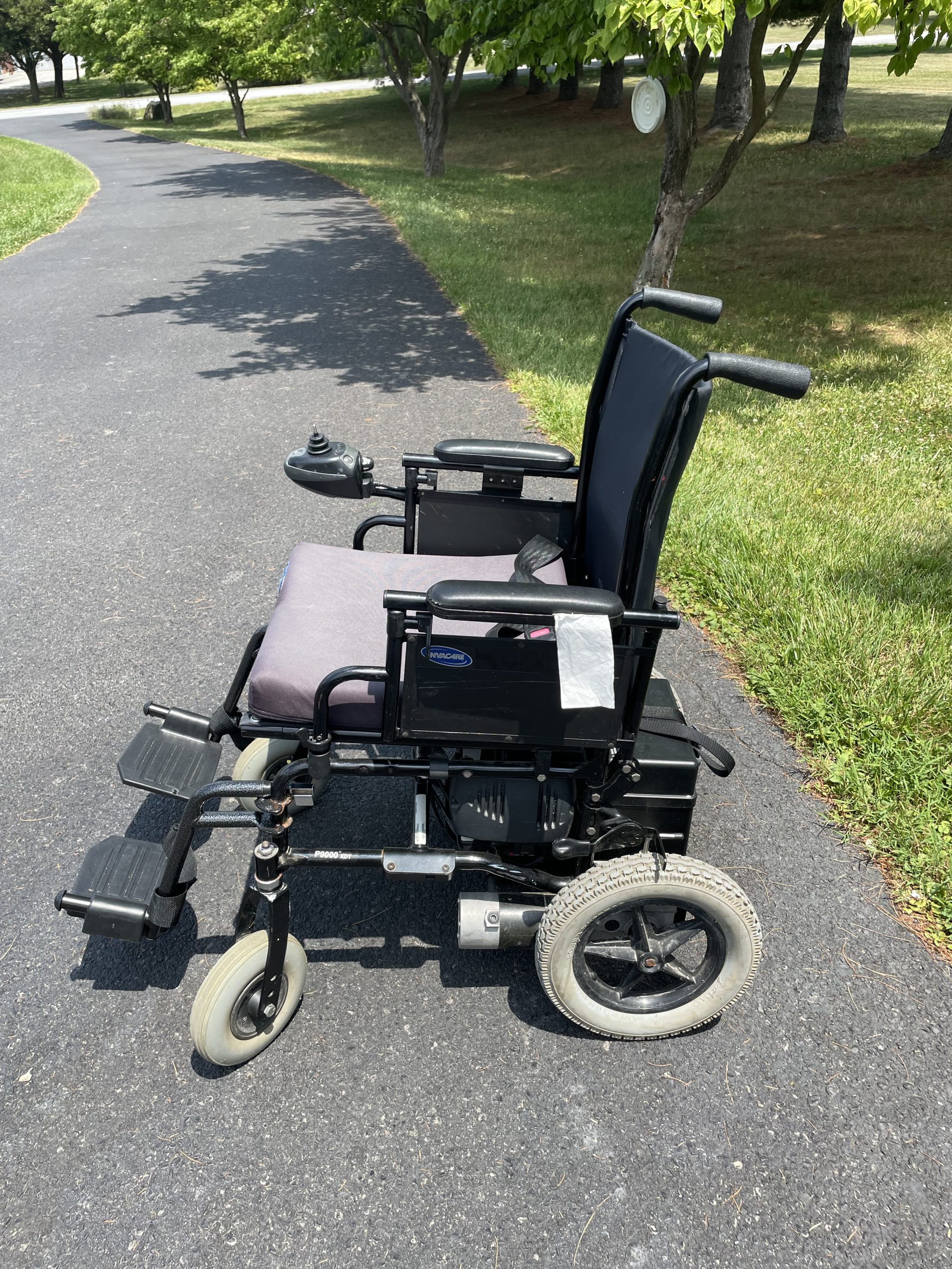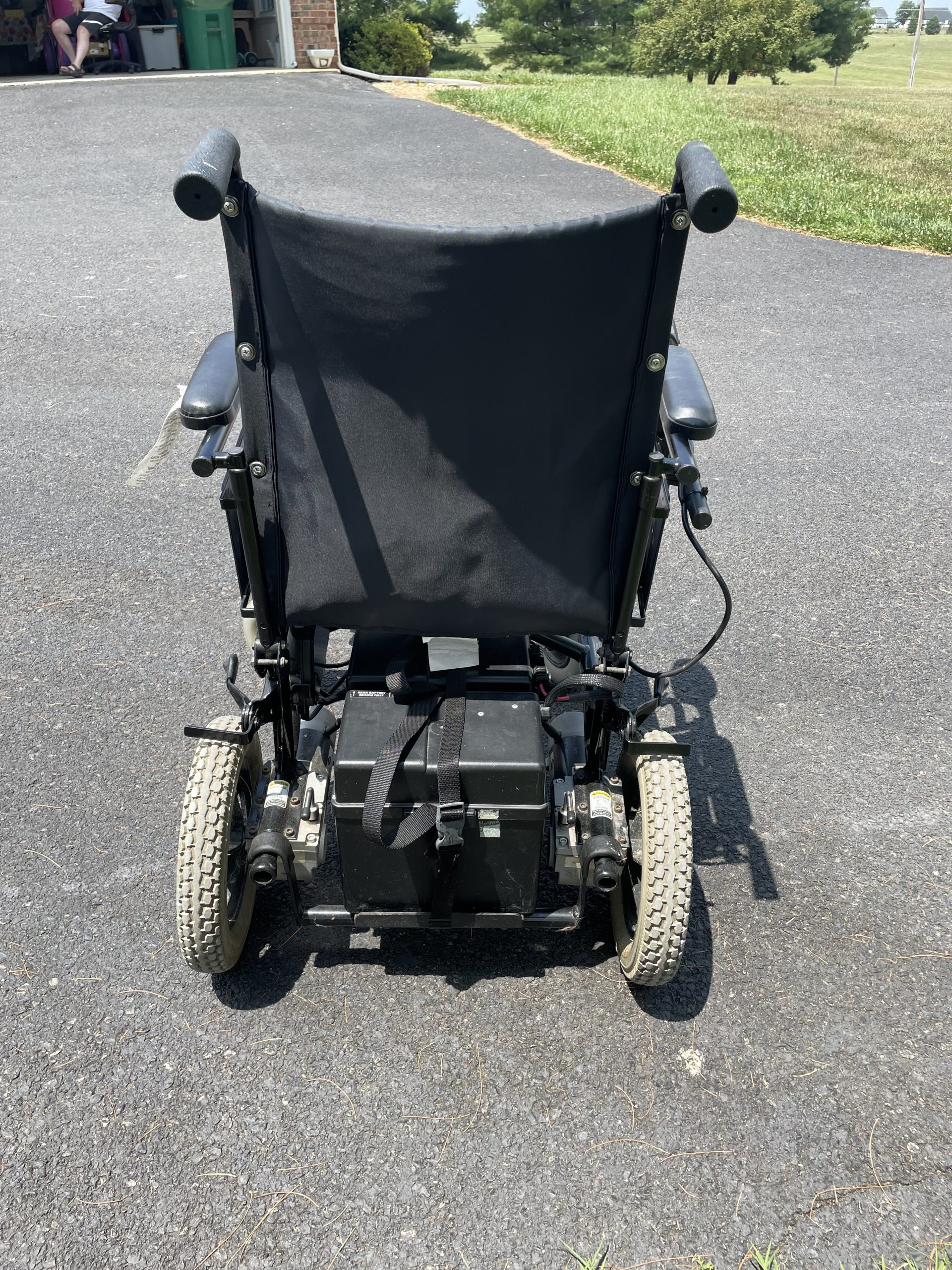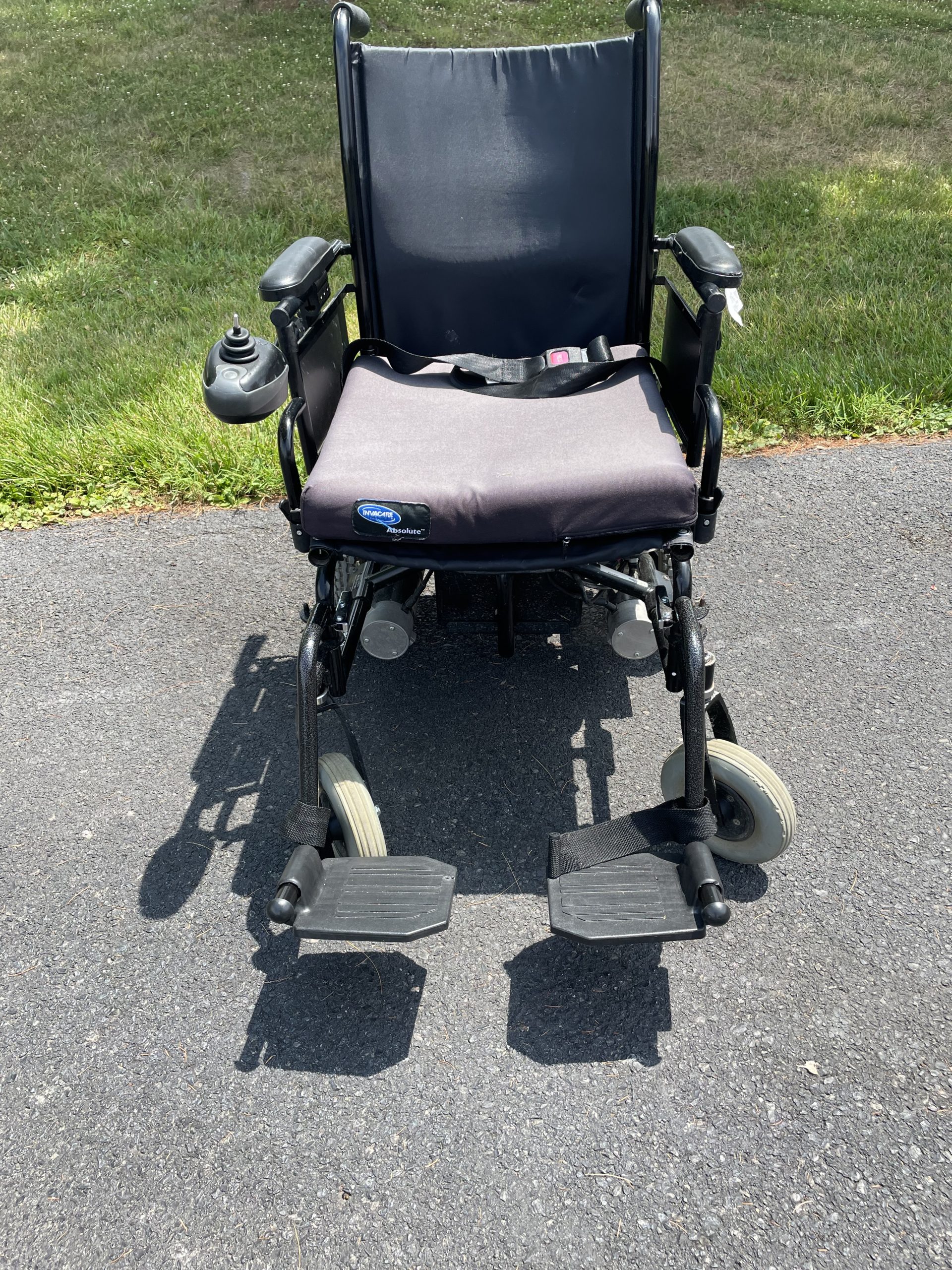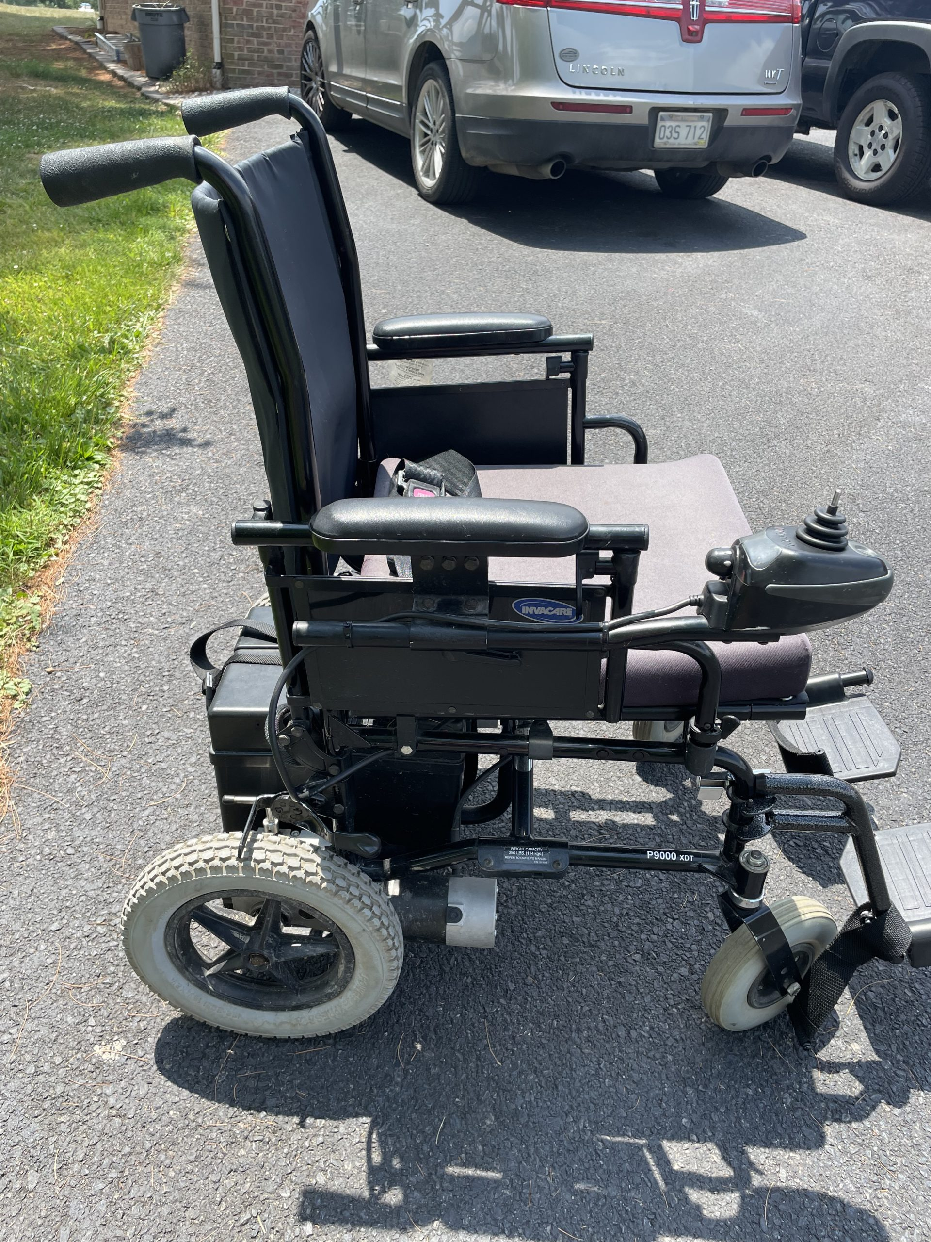 The Invacare P9000 XDT was the model purchased by my father to motor around his home and outside. This chair worked very well for him outside traveling from the house to the sheds on the property. It folds down for transportation. Very well made and in good condition. All of the original paperwork is included. It comes with seat belt and cushion if desire. This was my father's favorite power wheelchair, preferring it to his newer model. Works great, battery charger included as well. Seat width is 18 in. Weight limit is 250 pounds. Range is 12-14 miles. Speed 0 to 4. Footrests are swingaway, removable. Overall height is 38 inches. Back height is 17 inches. Weight is 82 lbs. without batteries and front riggings, with batteries, 142 lbs. Shipping 100 lbs. Armrests are adjustable height-desk. Upholstery is black nylon. Anti-tippers are removable. Drive wheels/tires (flat free) 12 1/2 in. x 2 1/4 in.