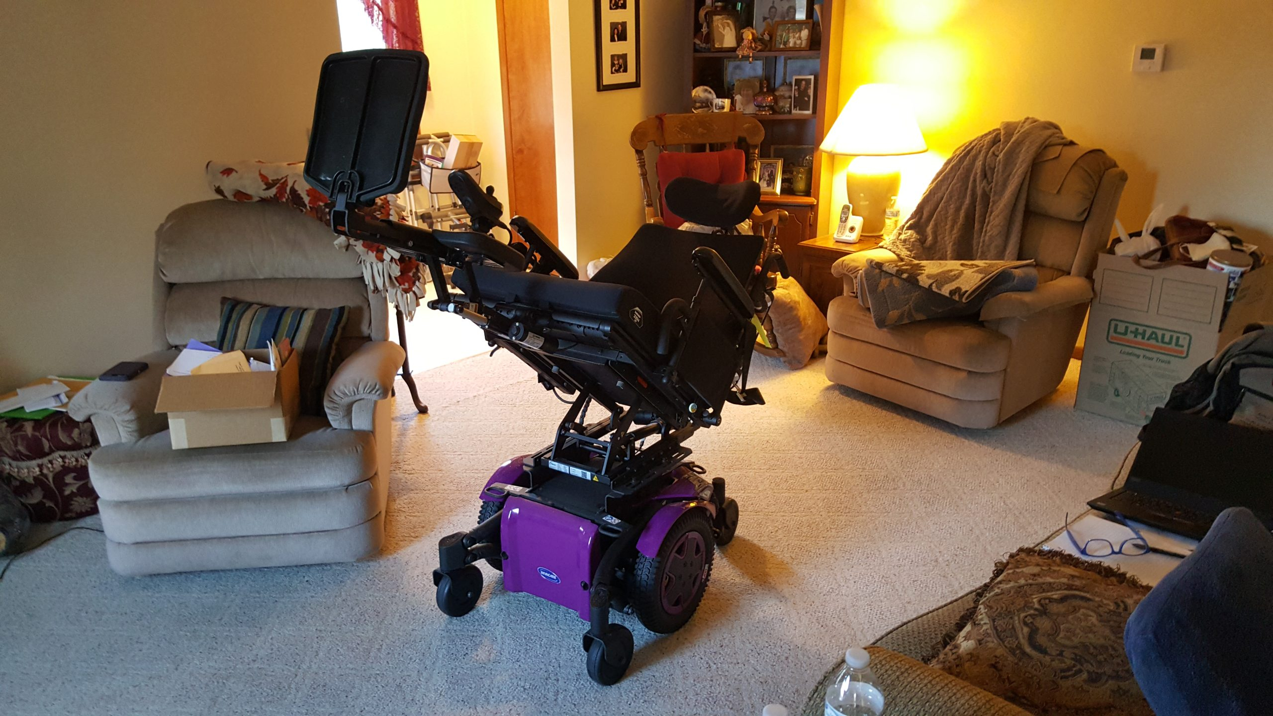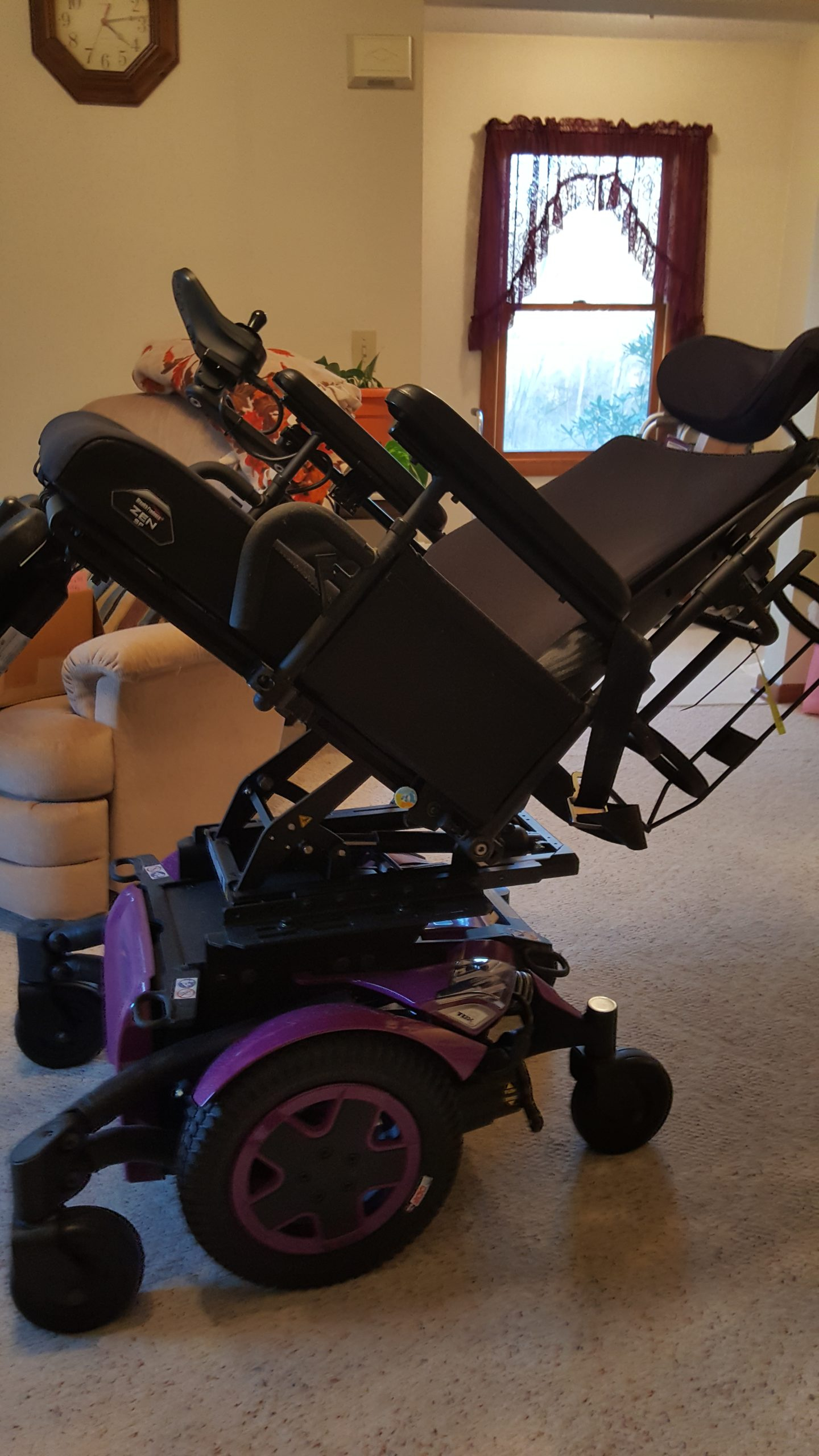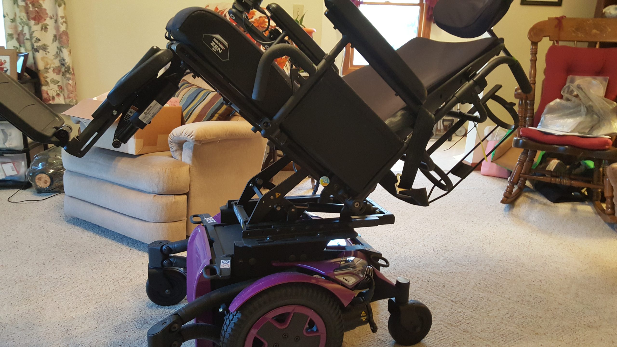 Invacare TDX SP2, Maxx Resolve Joy Stick - Right Hand Mount, ultra Low Maxx Cg Tilt 50Deg, Matrx Elan headrest Pad 14", Loxx Standard Hardware with 15" Vertical Post, Conyour Back 20Wx17H, On-chair Back Credit, Lnx Power Center Mount Art Foot Platform, Dual Function Through Drive Control, Non-Articulating O2 Tank holder, M K 22 Nf Battery, Stealth Zen Cushion 20x22. The wheel chair has had minimal use since delivery in 2022. Heavy Duty with tall and wide back and seat. Equipped with charger. Black seat and back with purple wheels and trim. Foot rests are long. Powerful wheel chair with right hand controls. The chair looks brand new and located in Wooster, Ohio. The list price of the chair to make was over $45,000. The chair's controls are broad. The chair can be adjusted for height, angle, and recline to make a patient's rest and access more comfortable and easier.