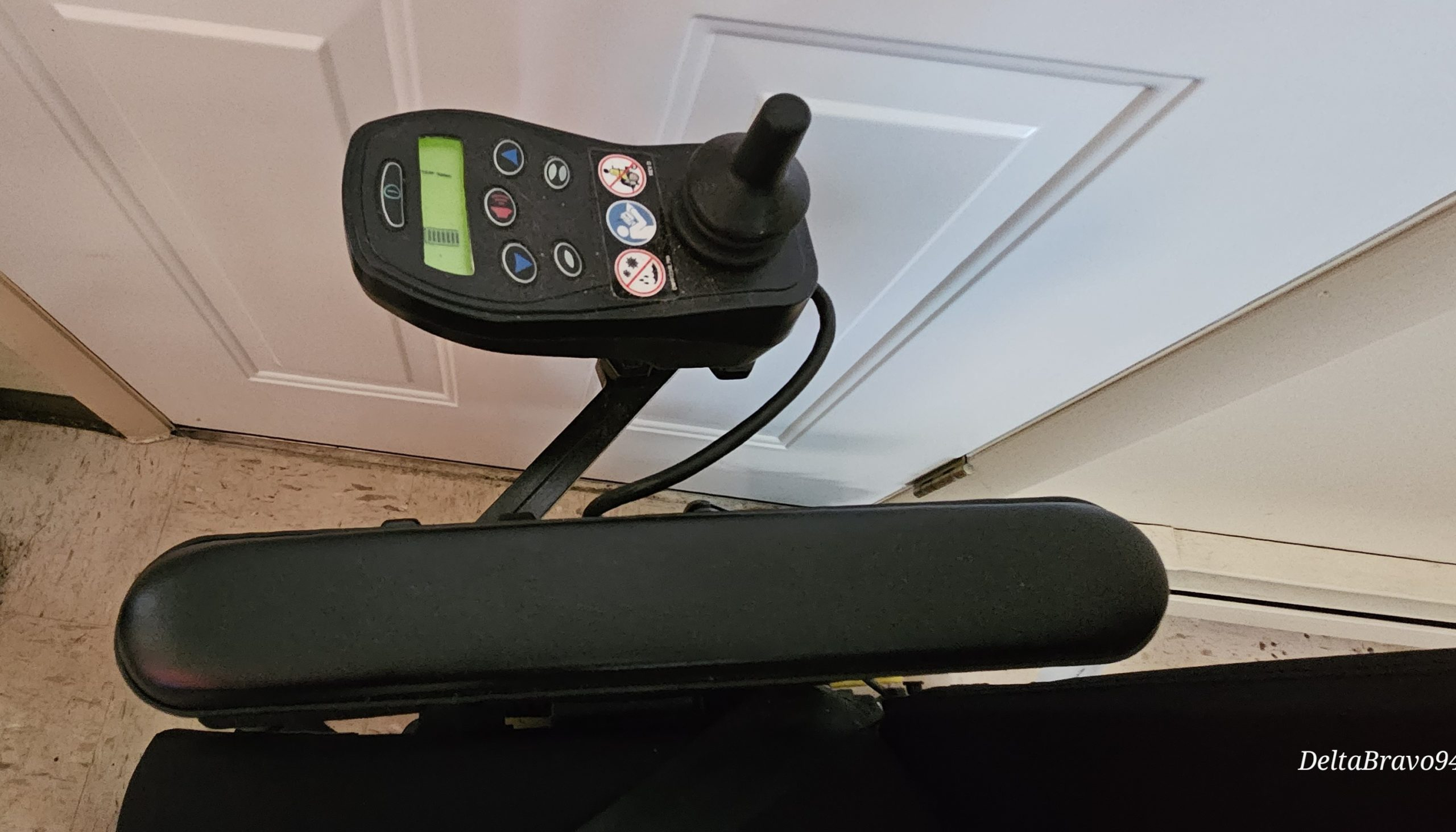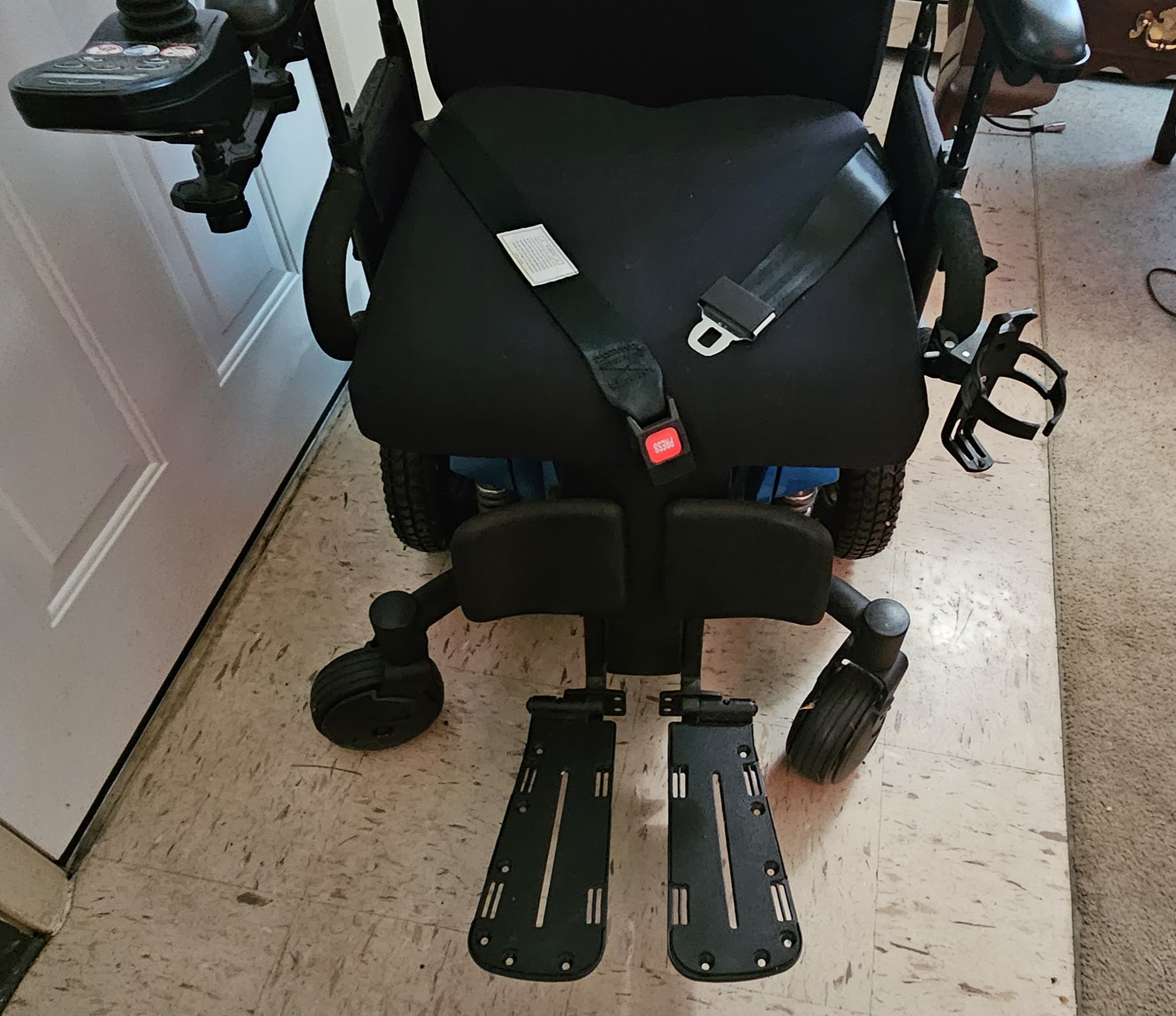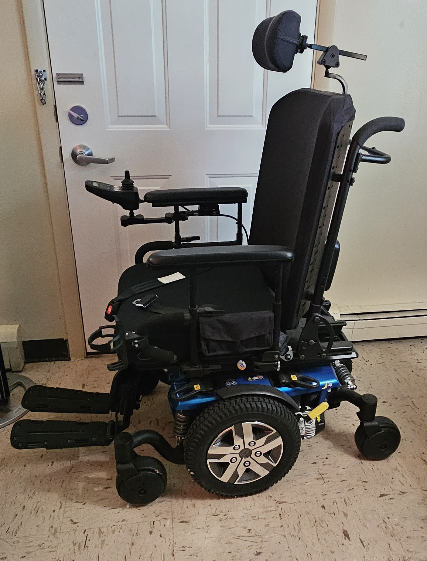 This is a custom made power wheelchair from nu-motion in Camp Hill, PA, made for me when I was suffering from major back injuries. It is a mid drive 6 wheel power base and a Q4 power tilting chair and coil suspension. 6 no flat tires. 2 Battery Interceptor 55 Ah gel batteries that I've kept charged weekly with the supplied charger. 24 inch wide chair, swing away magnetic mount for the Ne Plus joystick and 2 post flip up arm rests. Foot plates are center mounted metal and tilt and fold up. Transit hooks and 60 inch seatbelt.