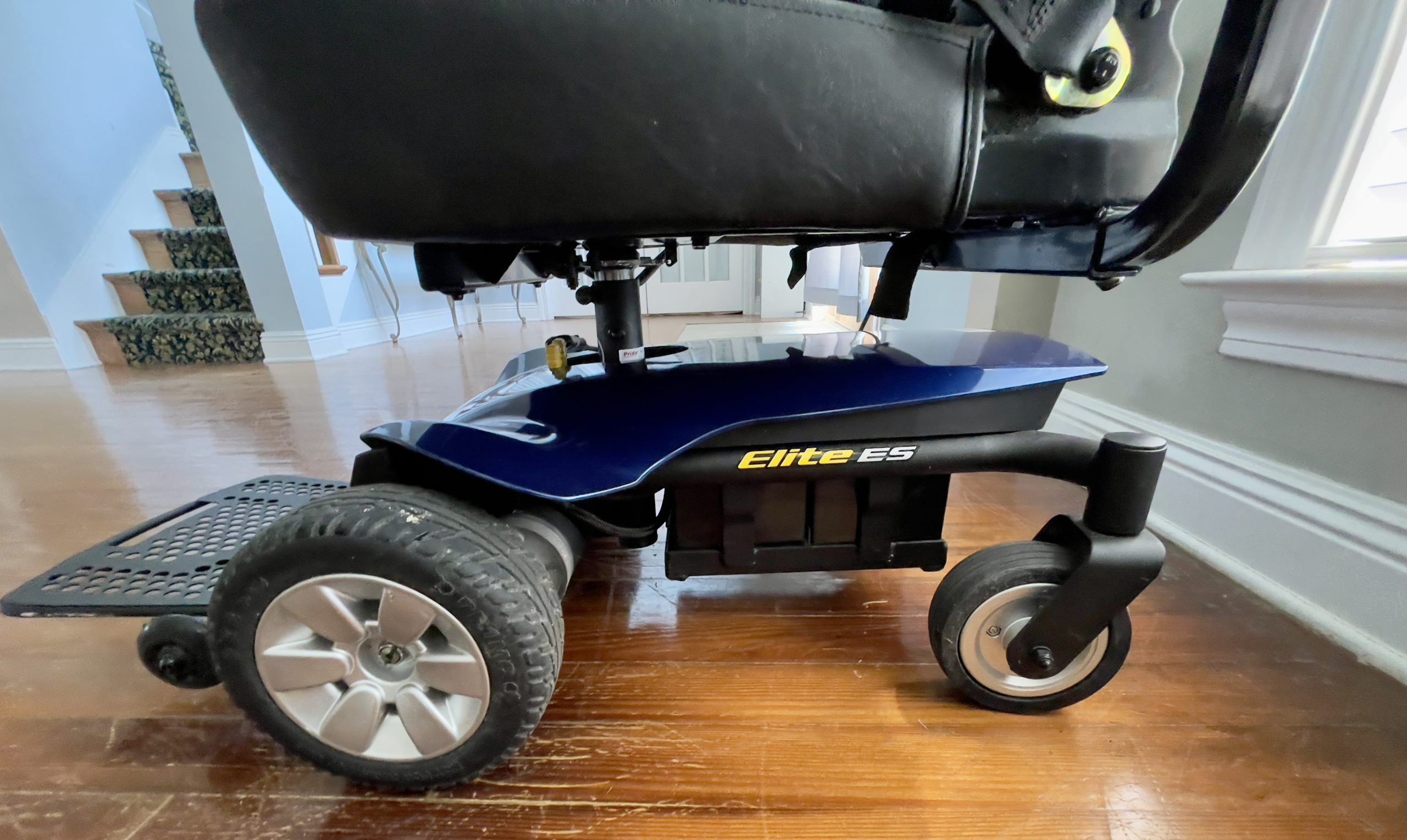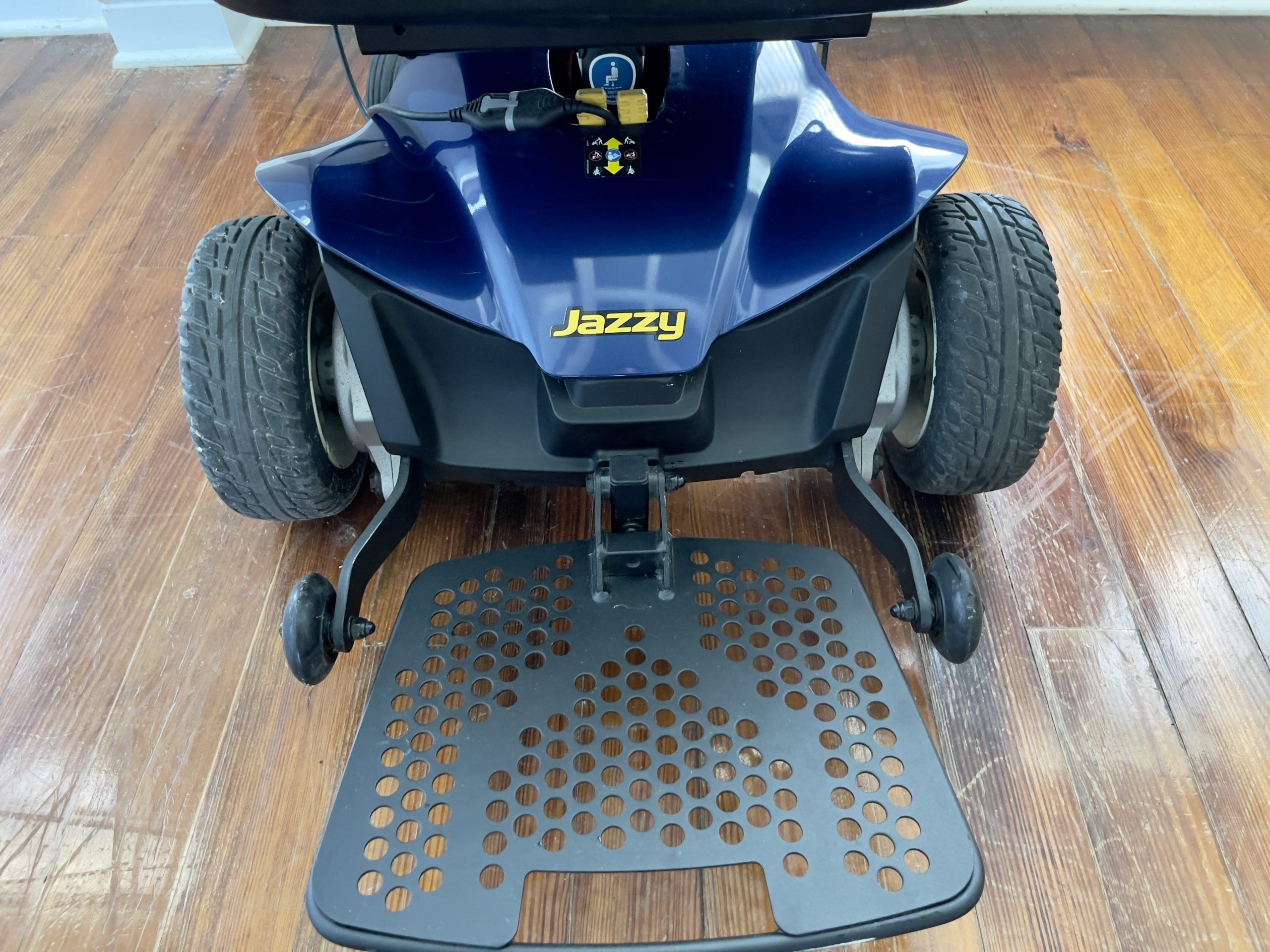 Motorized Electric Power Chair for Adults, 300 Lbs. Pride Mobility Jazzy Elite ES Group 2 Power Chairs. Two motor, Front Wheel Drive. Maximum speed up to 4 mph (6,44 km/h). "Intelligent Braking" electronic regenerative, disc park brake. With footplate. For indoor and outdoor.Maximum speed: Up to 4 mph (6.44 km/h). Range: Up to 15 miles (24.14 km ). Drive wheels: 9 in. (22.66cm) solid. Caster wheels: 6in (15.24 cm), solid, rear-mounted. Anti-tip wheels: 3 in. (7.62 cm), solid, front-mounted. Turning radius: 234.75 in (62.87 cm). Maximum Obstacle Climbing Ability: 2 in (5.08 cm). Overall Size: Length: 34,75 in (88.27 cm) without front riggings 41 in. (104.14 cm) with front riggings gs. Width: 22.75 in . (57.79 cm). Battery Charger: 3-amp, off-board.
