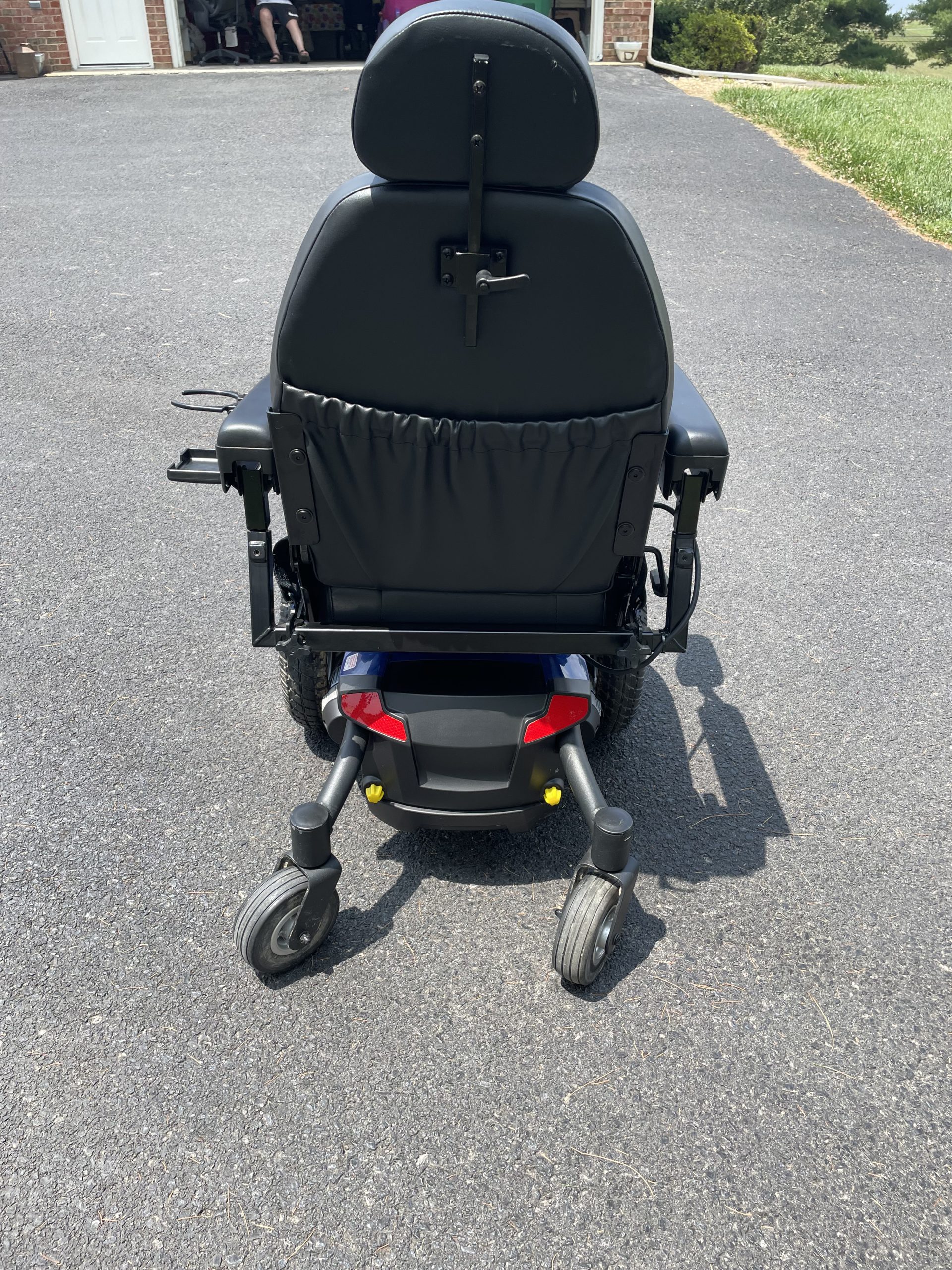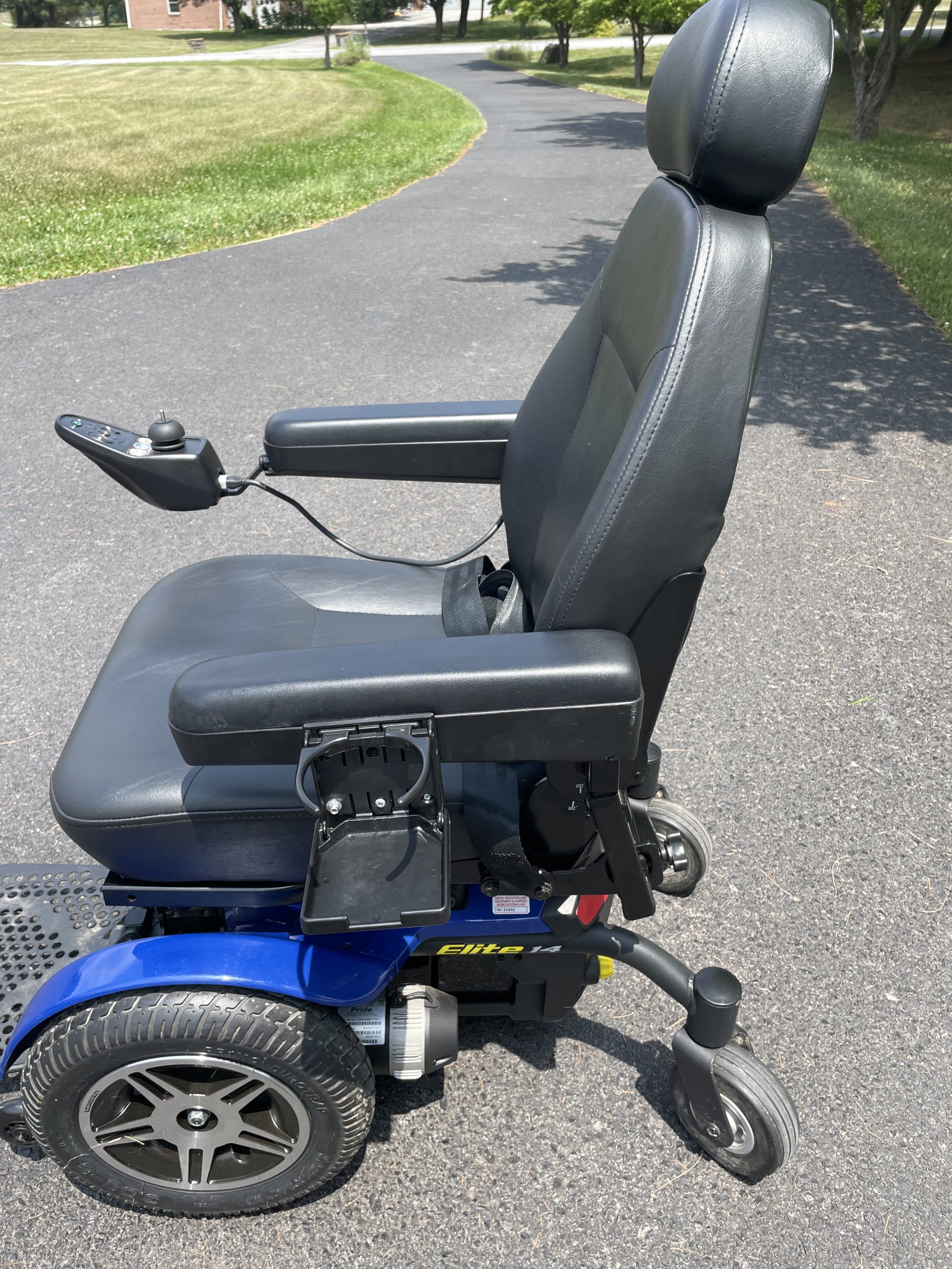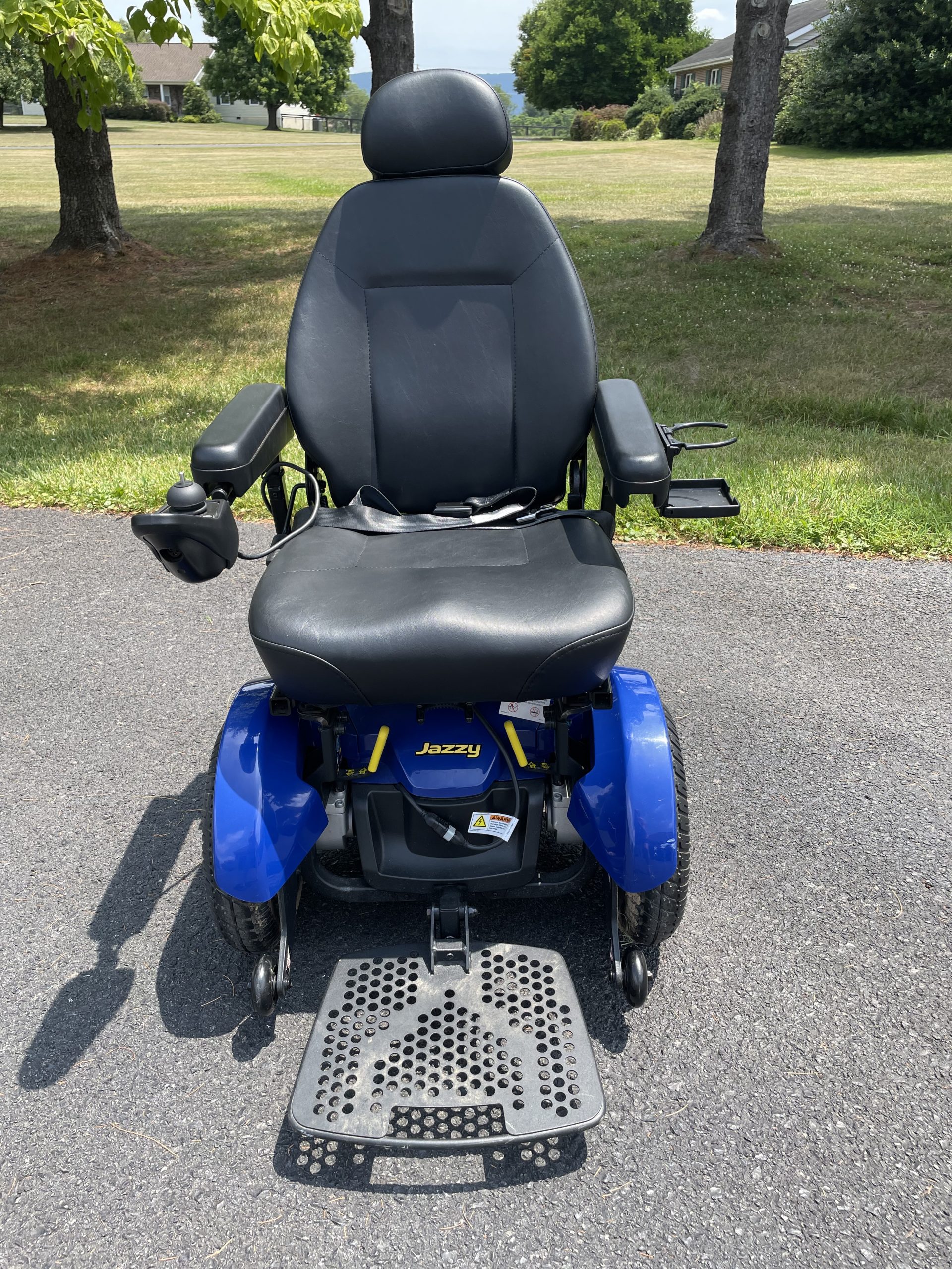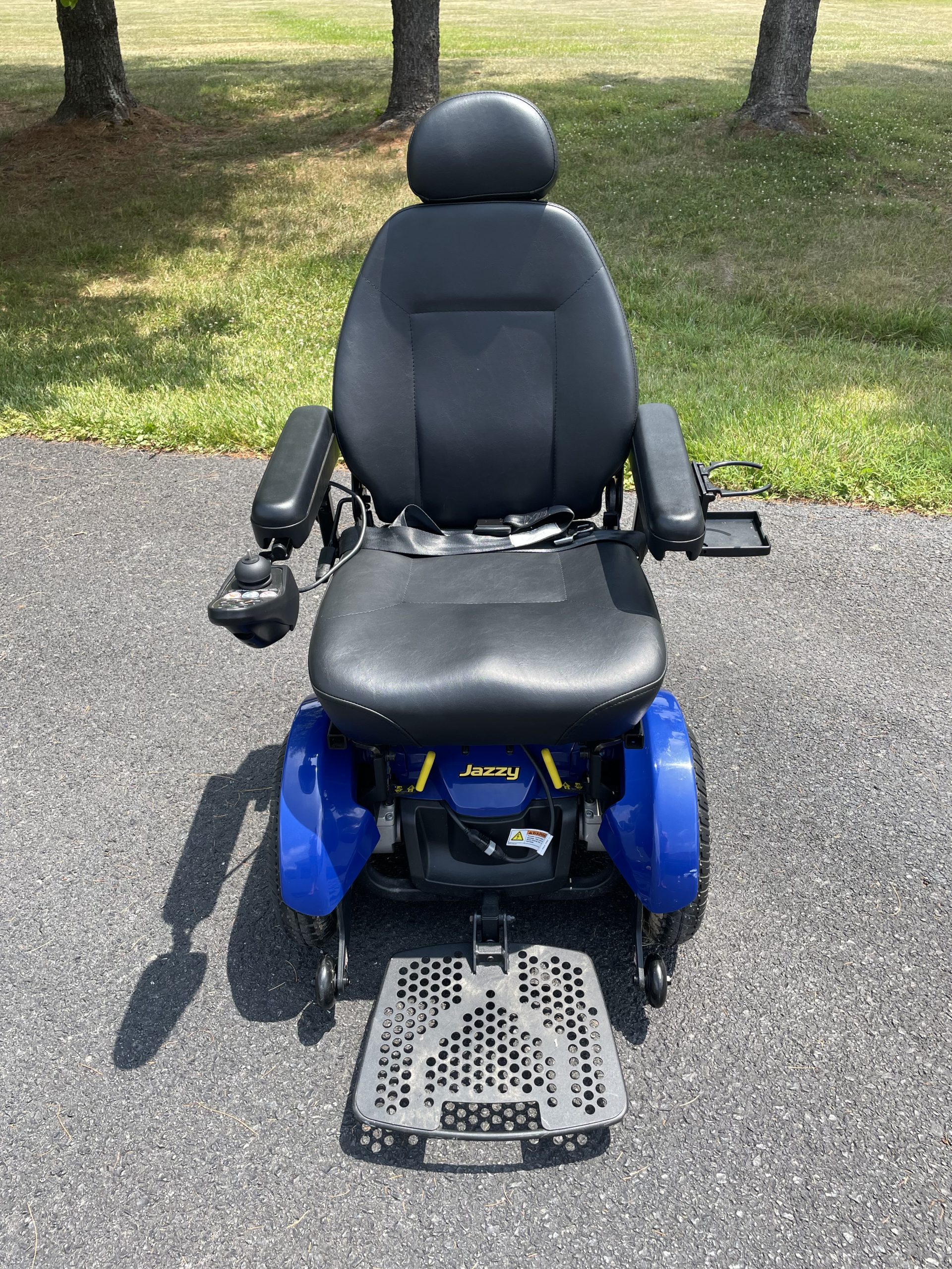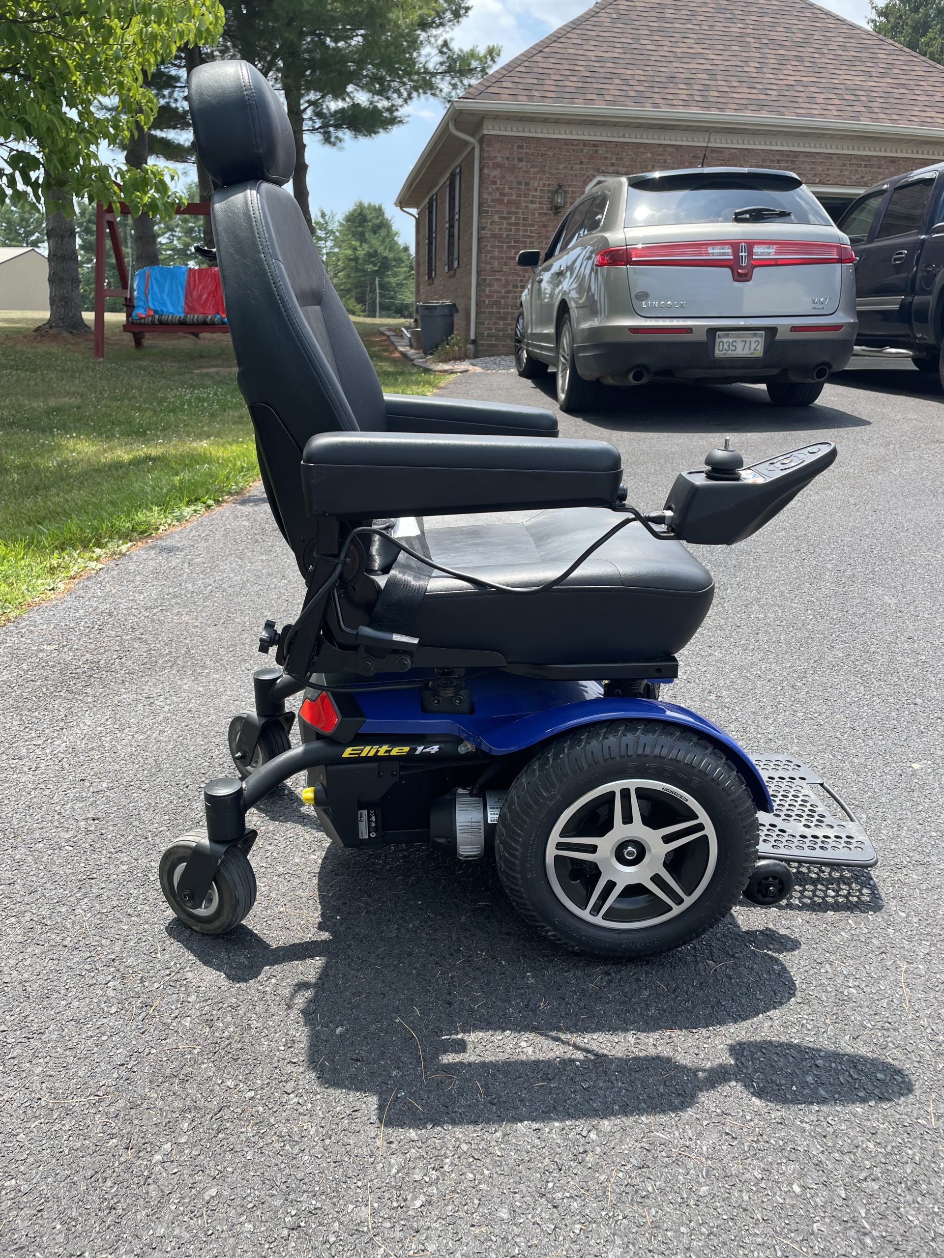 Very nice Jazzy Elite 14 power wheelchair. Excellent condition. Rarely used it because my father preferred his older wheelchair. Hard to teach an old dog new tricks. Battery charger included. All original manuals and product information are included. Cup Holder is attached. Seat belt attached. Weight capacity is 300 lbs. Maximum speed is 4 mph. Length is 35.5 in. without front riggings and 42.5 with front riggings. Width is 24.25 in. Drive wheels 14 in. Caster wheels 6 in. rear mounted. Anti-tip wheels 3 in. front mounted. Range is up to 9.8 miles. Base is 98.5 lbs. Batteries 37 lbs. Standard high back seat with controller 51.5 lbs. Drivetrain is two motor, front-wheel drive. The batteries are two 12-volt, NF-22. Very easy to navigate, two speed controls. Again this model is very nice and hardly used by father. It can be used on all surfaces and very easy to maneuver. All manuals and product specs are included.
