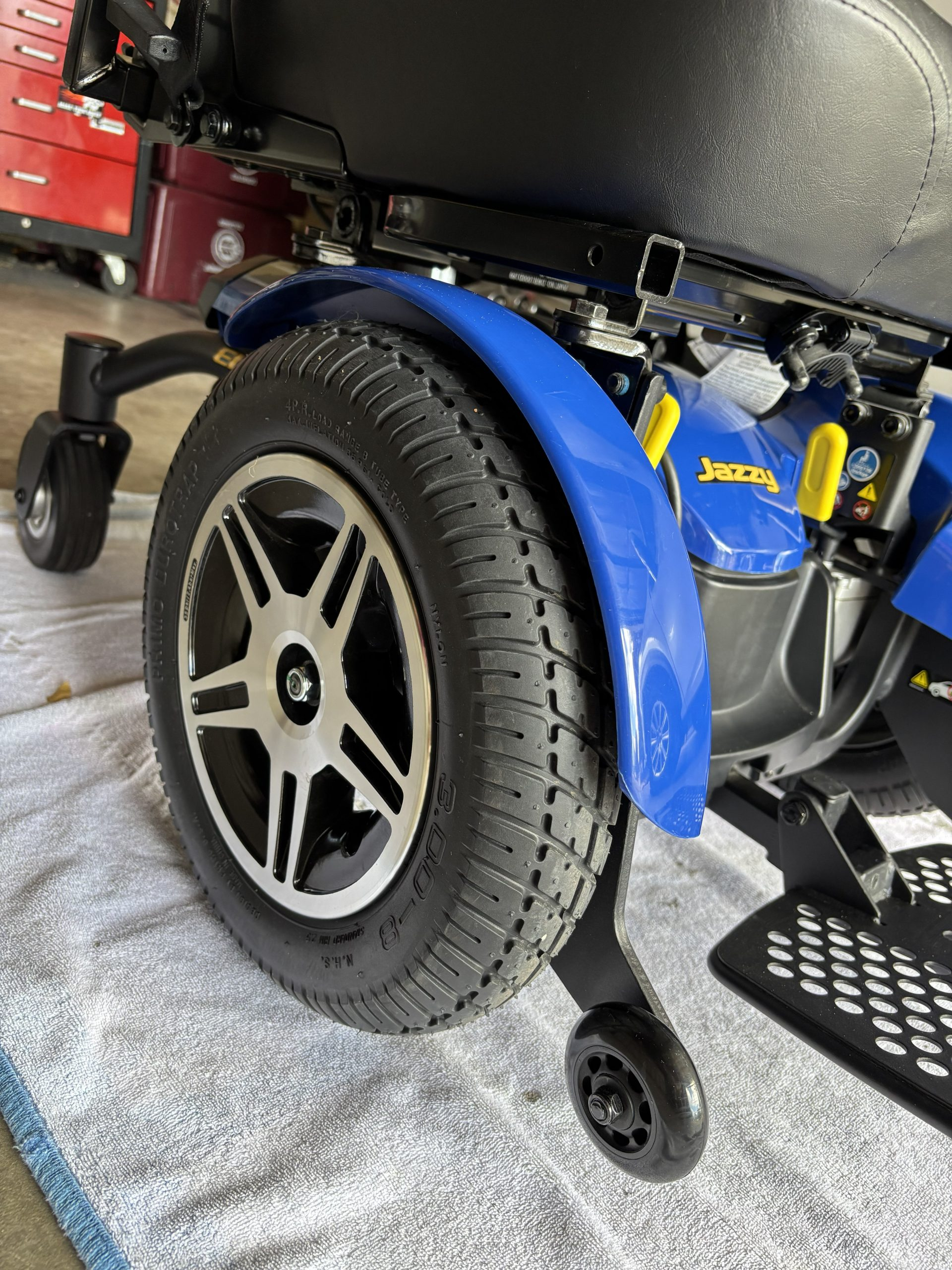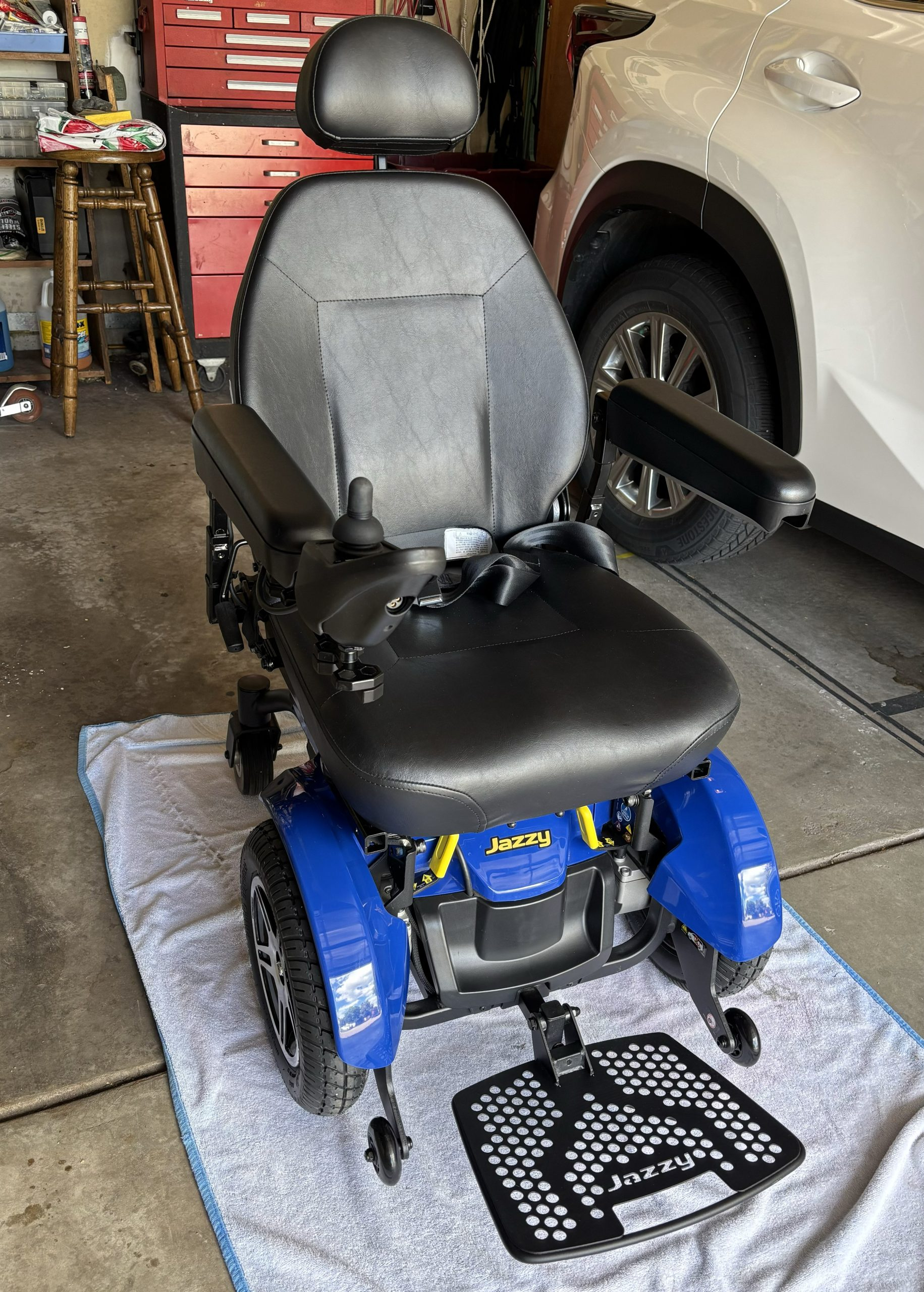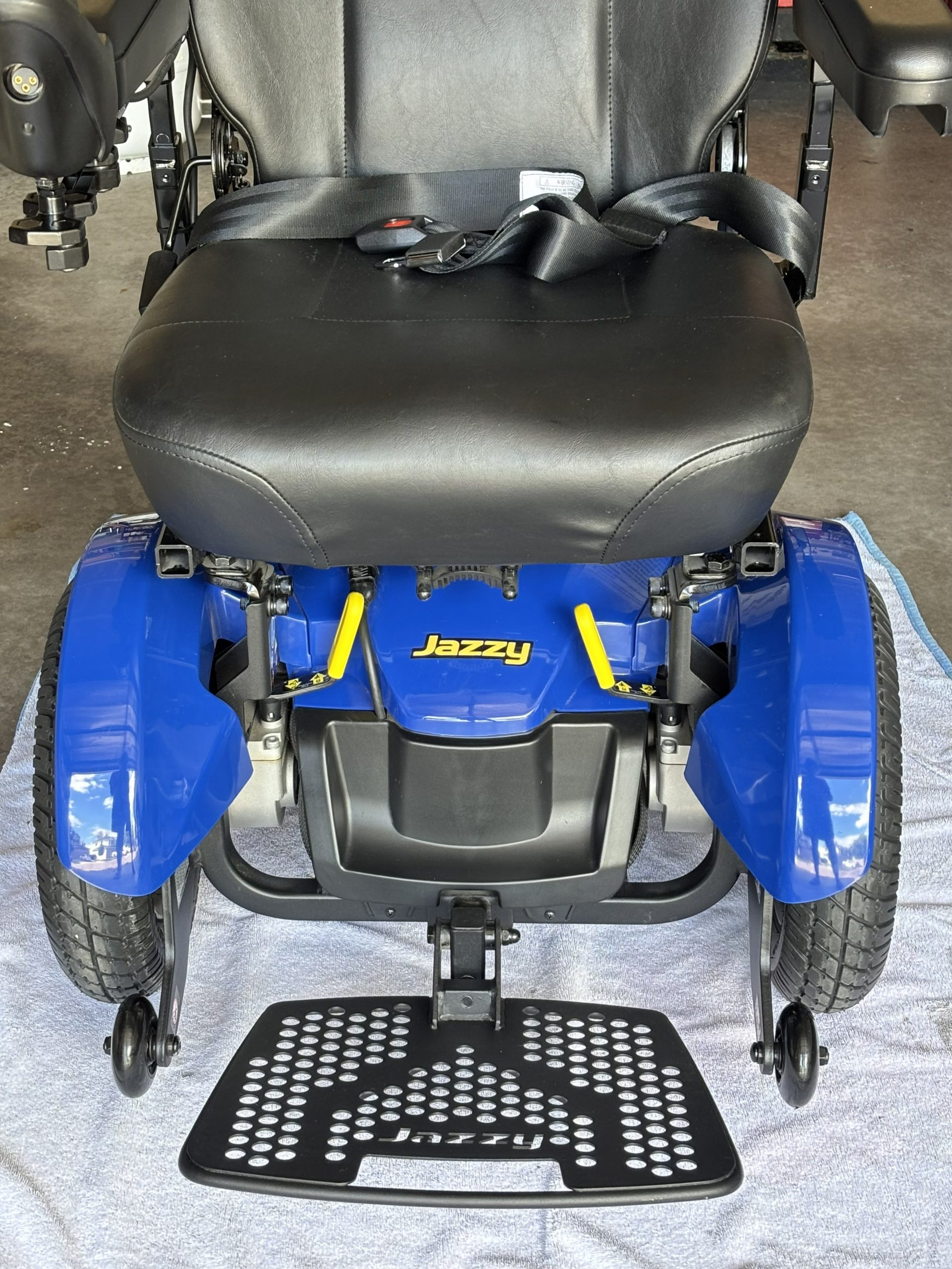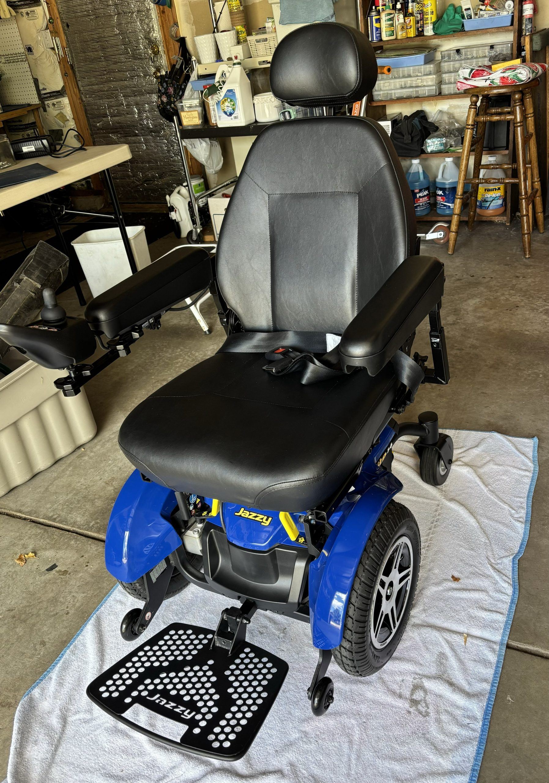 This chair is a blue Jazzy Elite 14 with a 300 pound capacity, foot rest, seat belt, front anti-tip wheels and knobby wheels for good traction. The controller has a slow and fast setting, has a horn and can swivel out to the side. Both the arms and foot rest can flip up for easy access in and out of the chair. The head rest can adjust up or down. The power charger, owner's manual and consumer safety guide are included. My husband purchased this chair thinking he would need it in the future, but never did use it. It has been stored inside the house and has not been outside. Very clean. It has been charged and put into motion frequently to make sure it is in working order. We originally paid $4,100. It is located in Littleton near Coal Mine and Kipling in the 80127 zip code. Please email if any questions need to be answered.