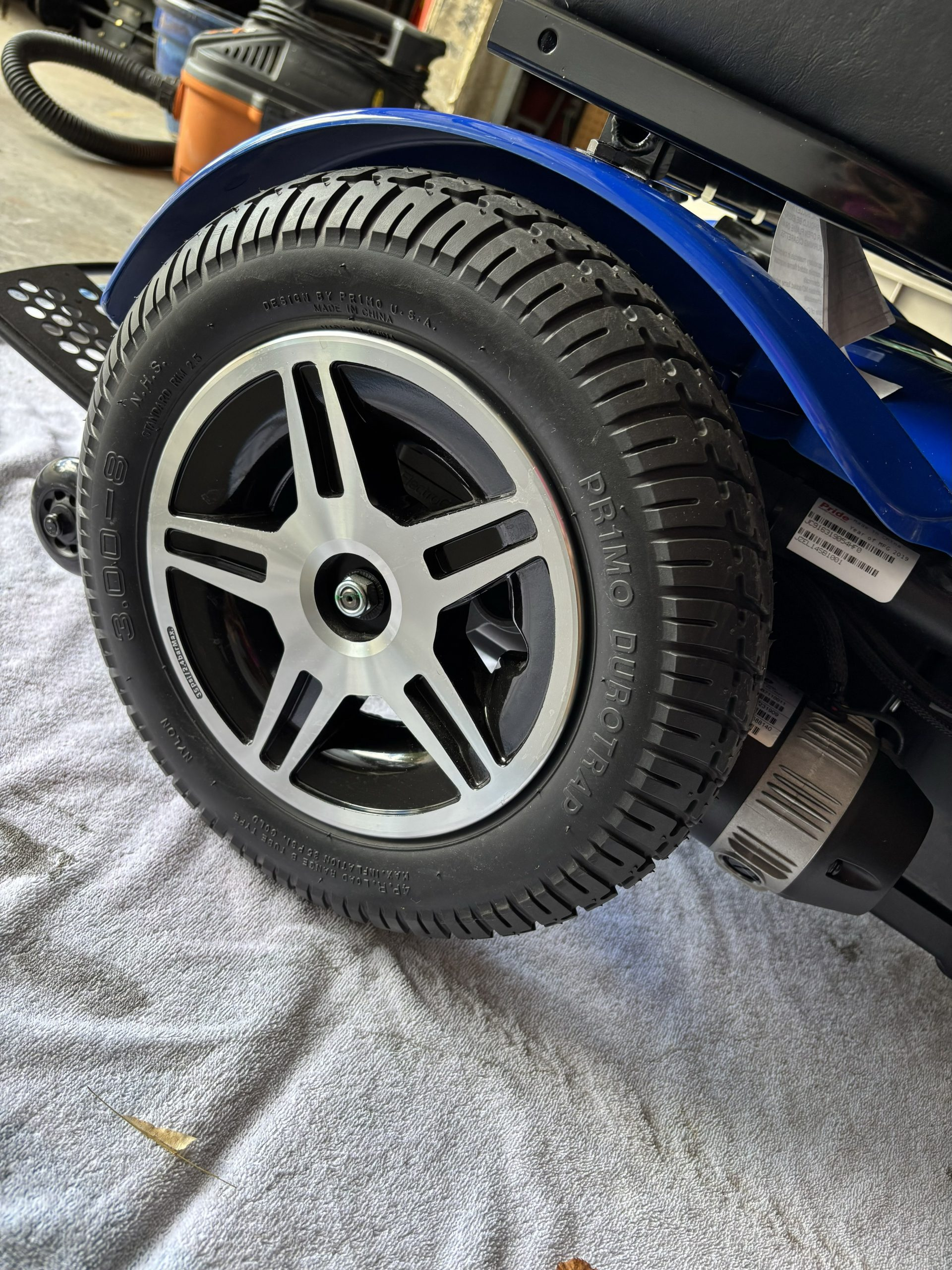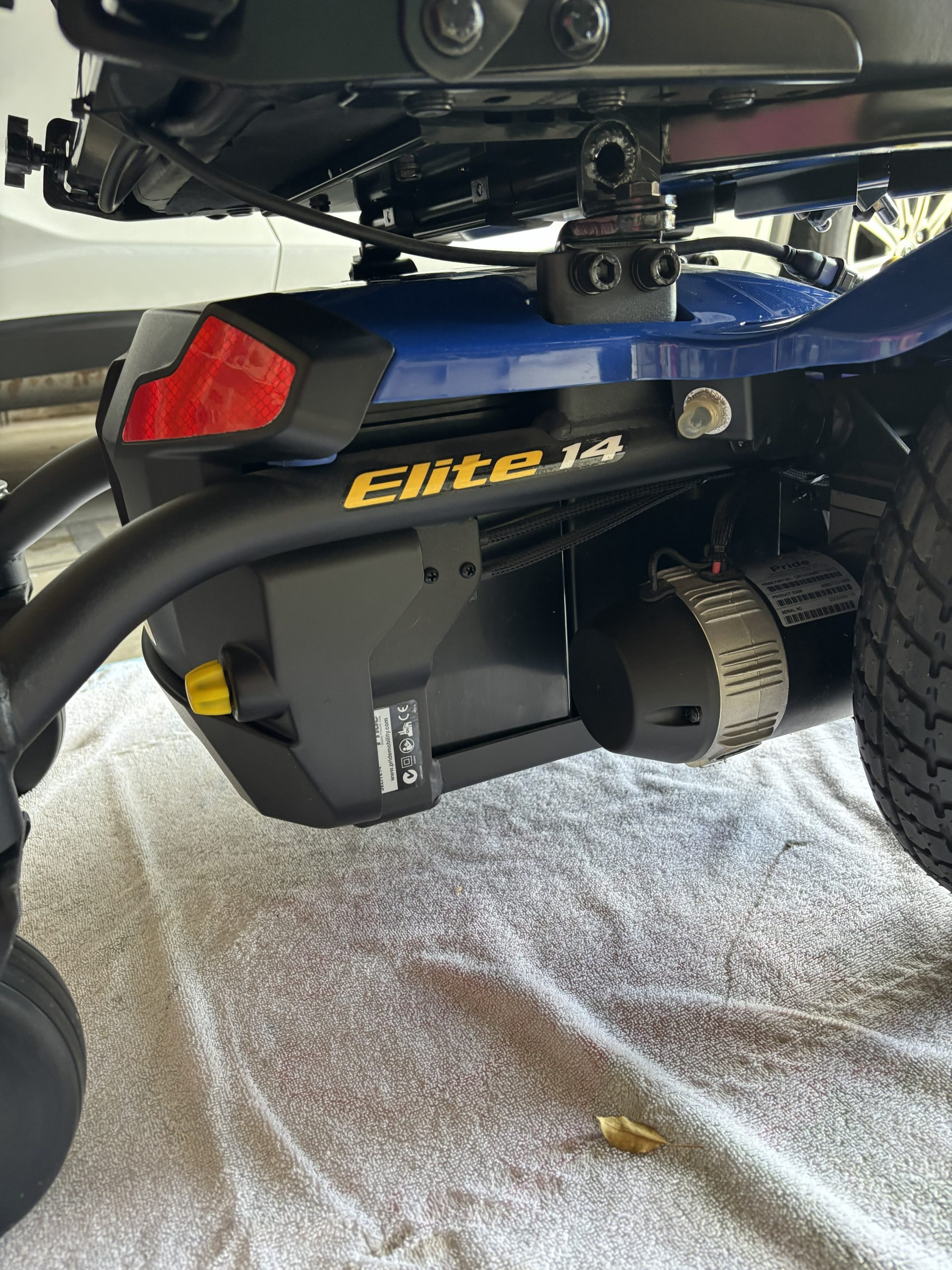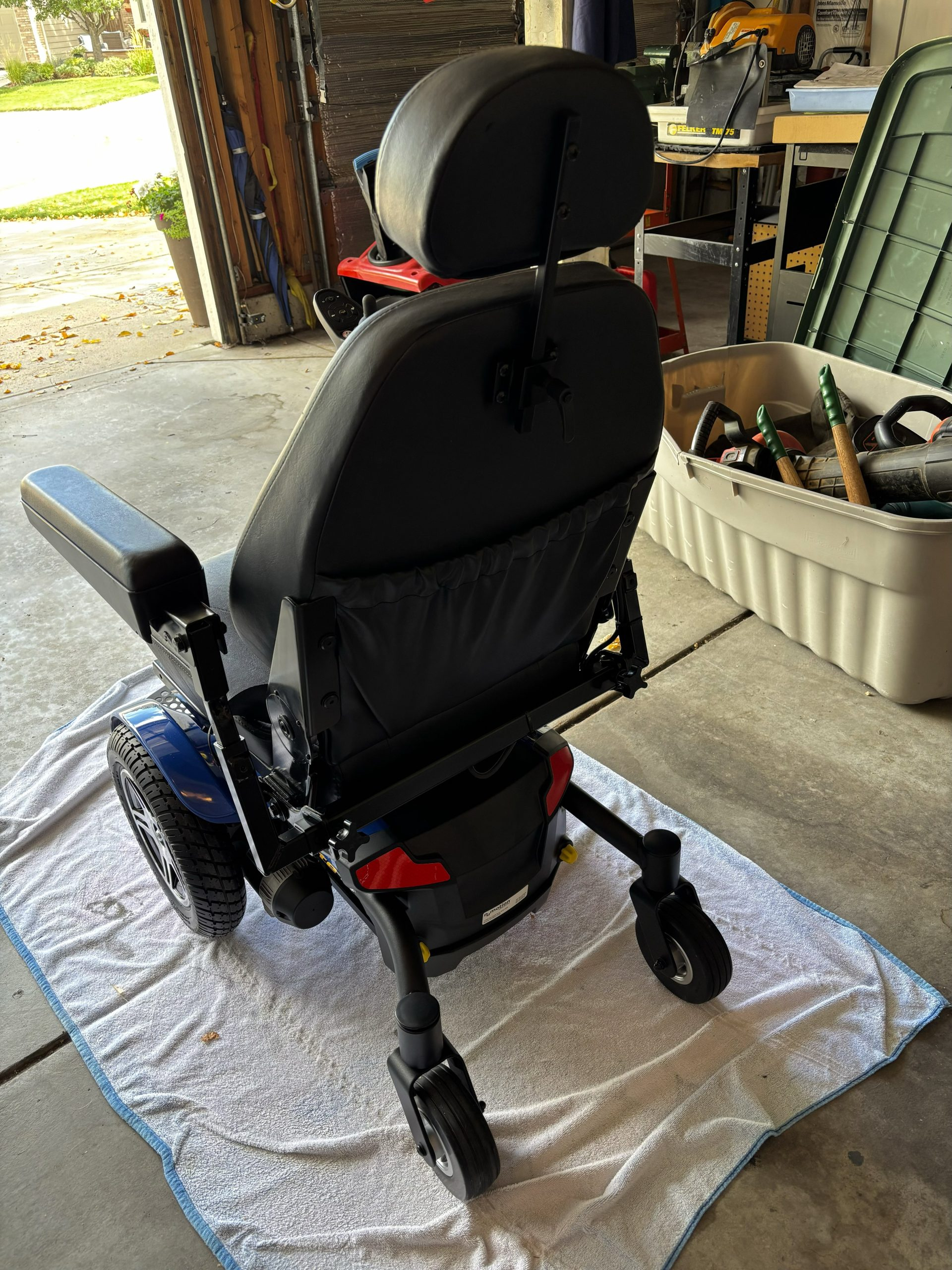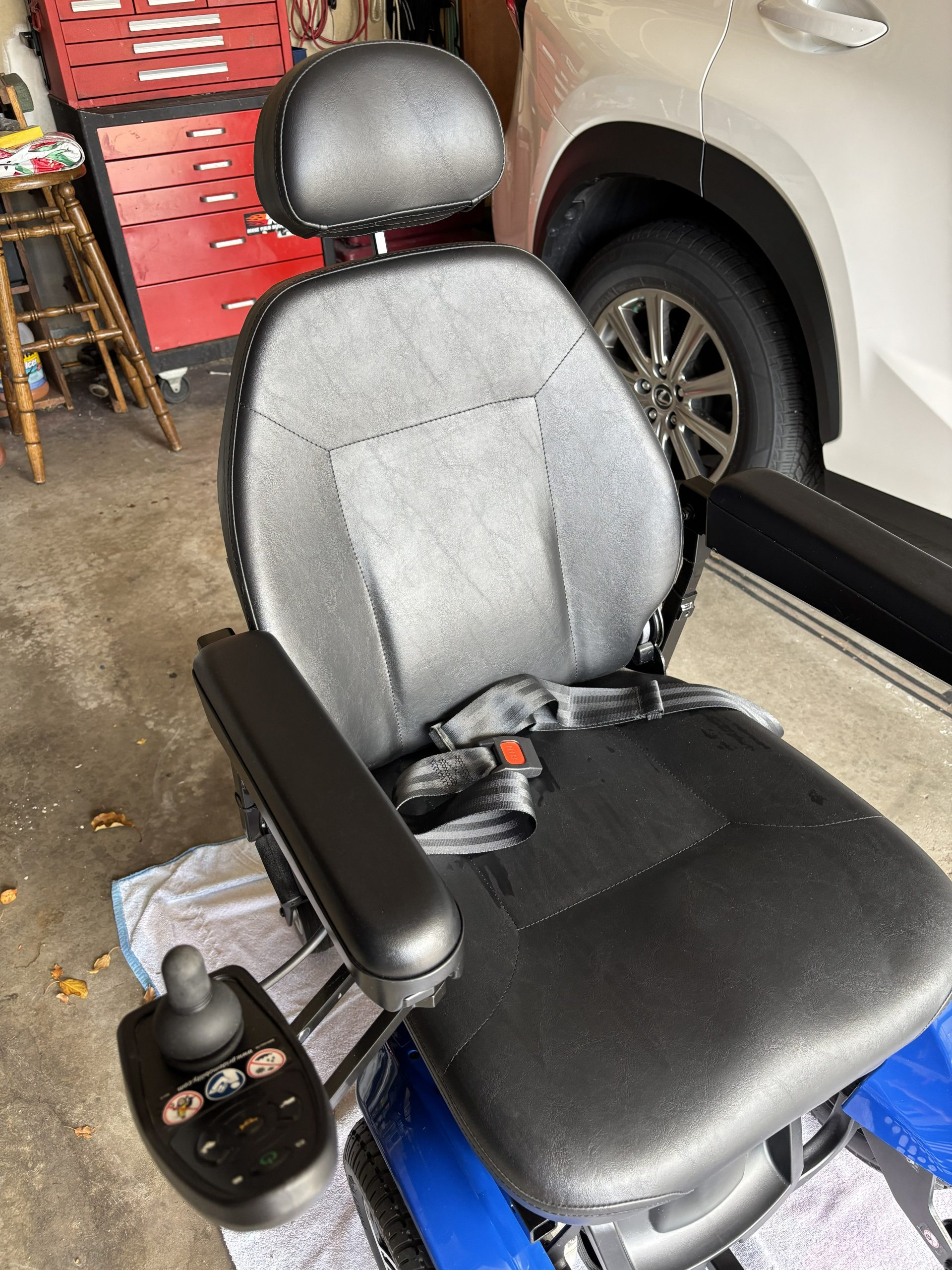 This chair is a blue Jazzy Elite 14 with a 300 pound capacity, foot rest, seat belt, front anti-tip wheels and knobby wheels for good traction. The controller has a slow and fast setting, has a horn and can swivel out to the side. Both the arms and foot rest can flip up for easy access in and out of the chair. The head rest can adjust up or down. The power charger, owner's manual and consumer safety guide are included. My husband purchased this chair thinking he would need it in the future, but never did use it. It has been stored inside the house and has not been outside. Very clean. It has been charged and put into motion frequently to make sure it is in working order. We originally paid $4,100. It is located in Littleton near Coal Mine and Kipling in the 80127 zip code. Please email if any questions need to be answered.