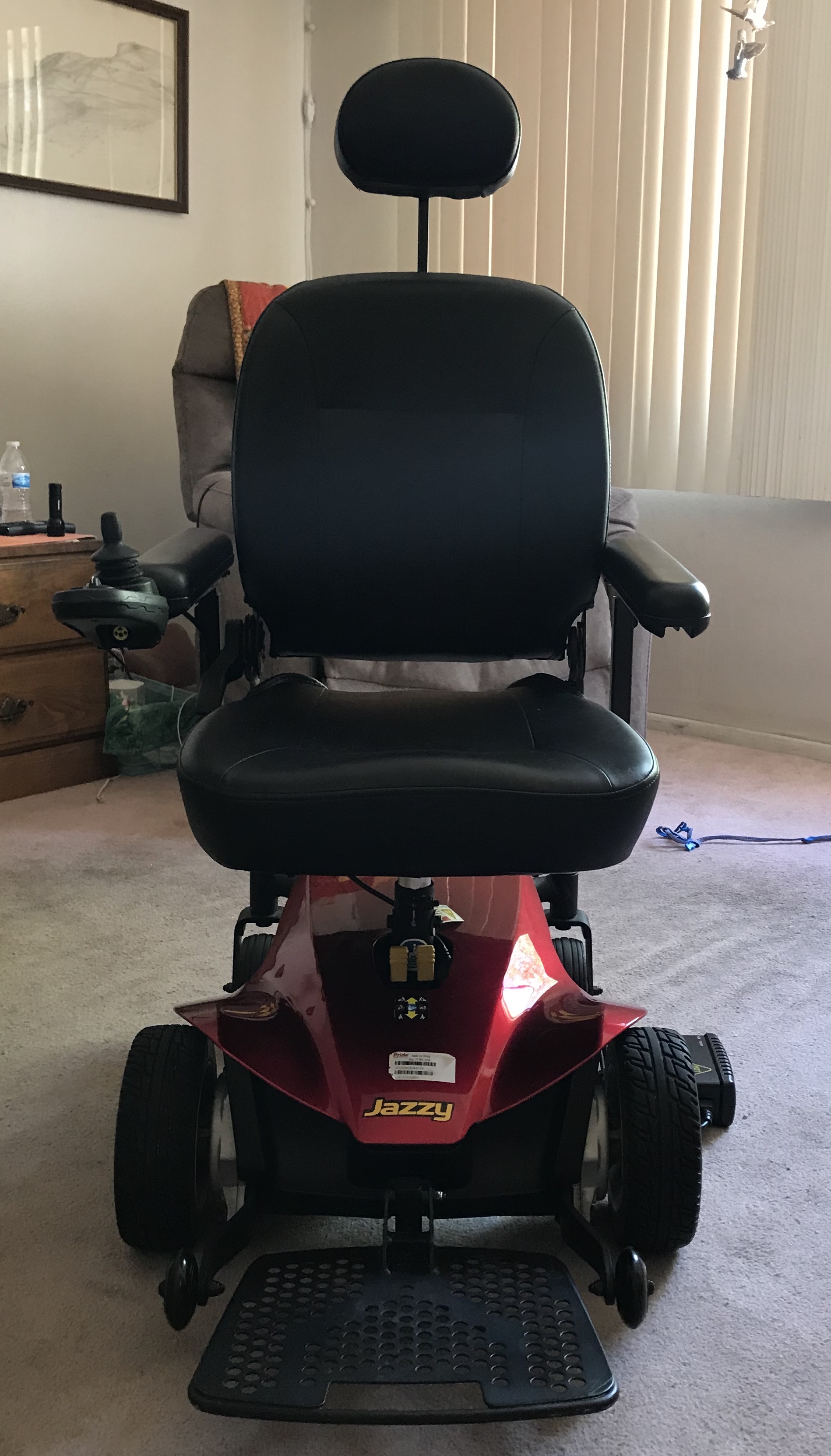 This gently loved Jazzy Elite ES Power Chair looking for a new home. This chair was brand new when purchased on 11/18 and has been used intermittently until just recently - 7/1/19. It works and it drives perfectly and is in excellent condition. It is a cheerful Candy Apple Red. Weight – 162 lbs. Weight capacity 300 lbs. The joystick steering makes it easy to steer and maneuver. The controller is equipped with a battery charge reminder feature so you always know your charge level. This chair is VERY easy to operate. It has a very tight turning radius, so it works well even in small homes, apartments or places with little room, like restaurants or stores. The chair goes approximately 6 mph and can go 3.5 miles on a single charge. The chair brand new sold for $3500, so this is an incredible bargain at $1995. This crème puff is located in Phoenix, AZ and is available immediately.