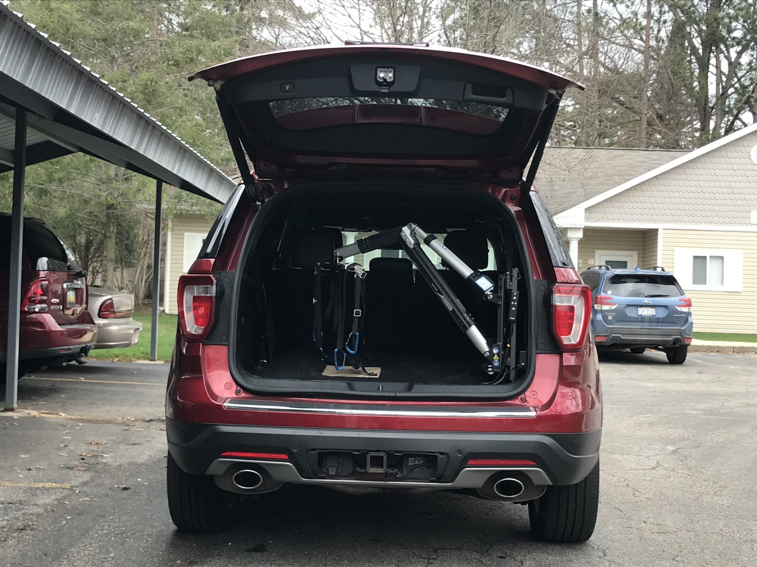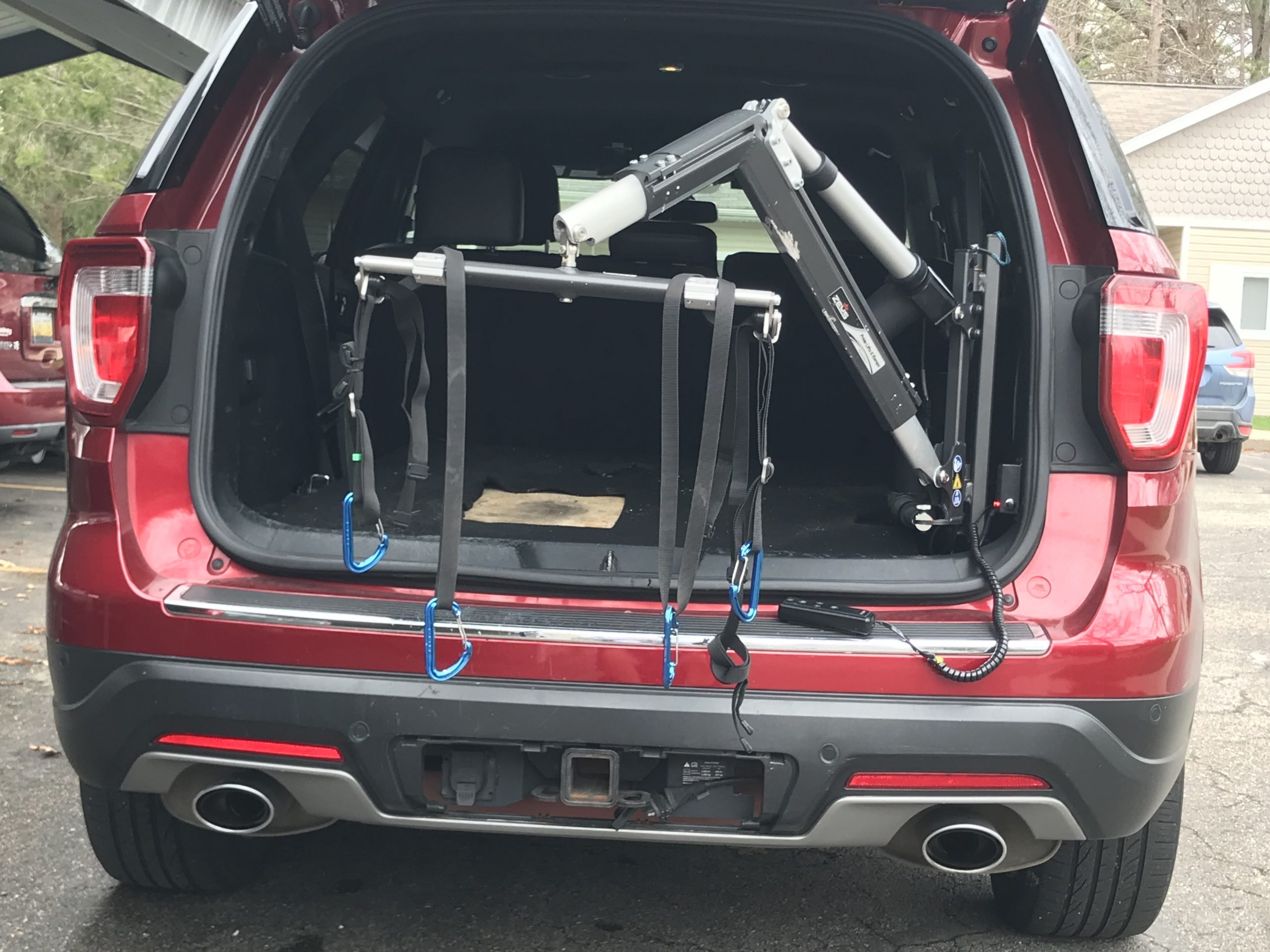 The Zeus 260 power wheelchair boom lift can be used by most SUVs (used on 2018 Ford Explorer) mechanically sound but with a few small scratches. The boom mounts to a vehicle without damaging interior trim and can be easily removed from the vehicle by removing two pins. Wheelchair fits behind the second row of seats and on top of folded down third-row seats. It has a wired remote control to swing the boom out and to raise and lower the boom. Basically a one-finger operation and easy to use.