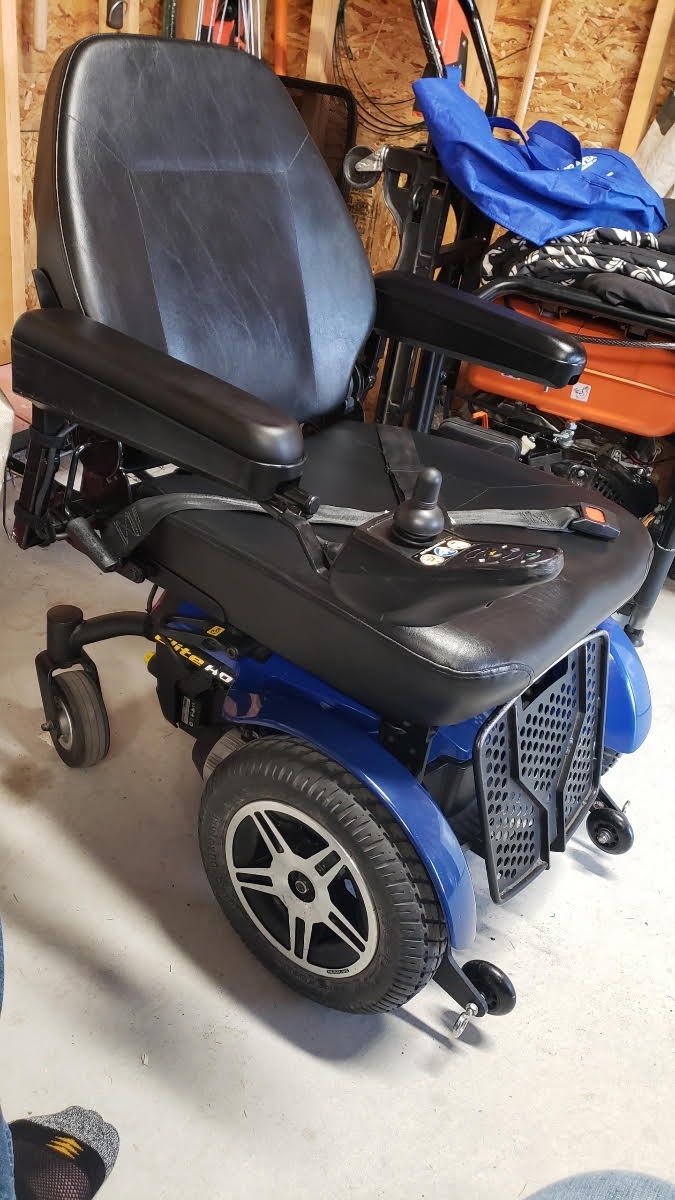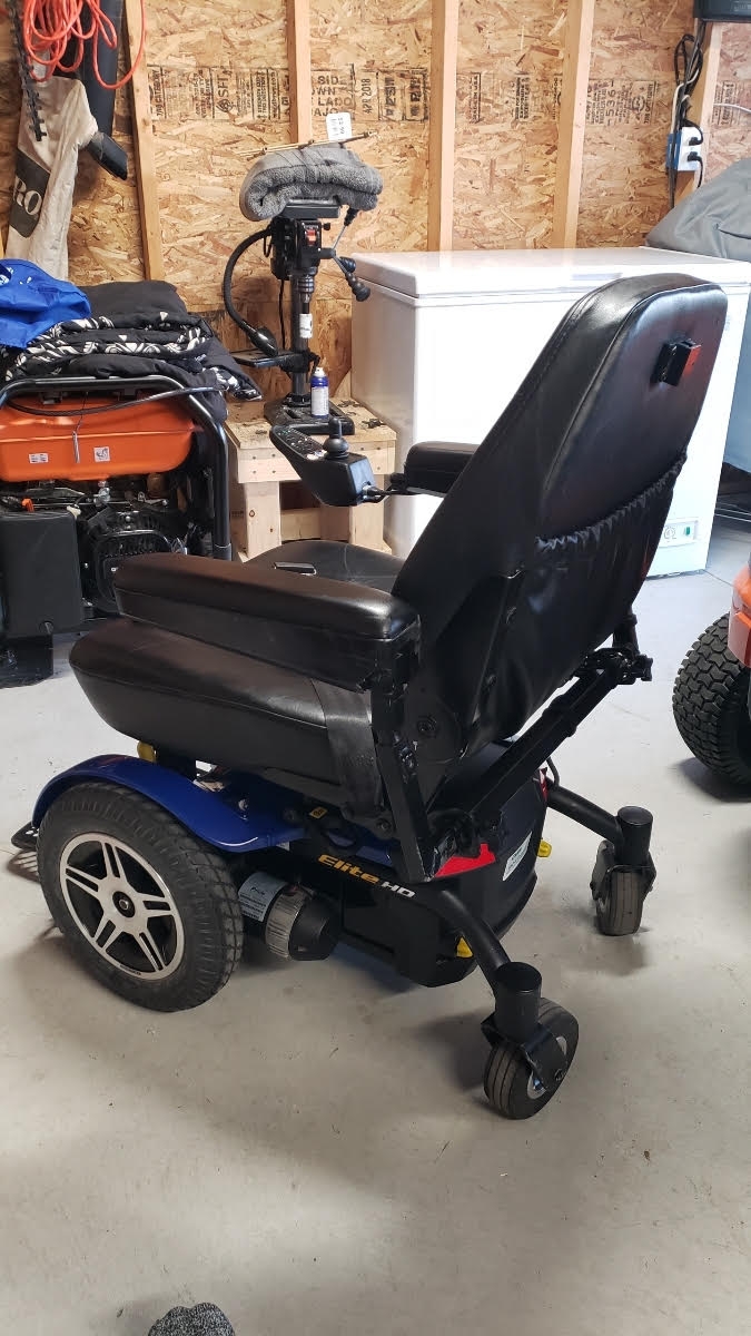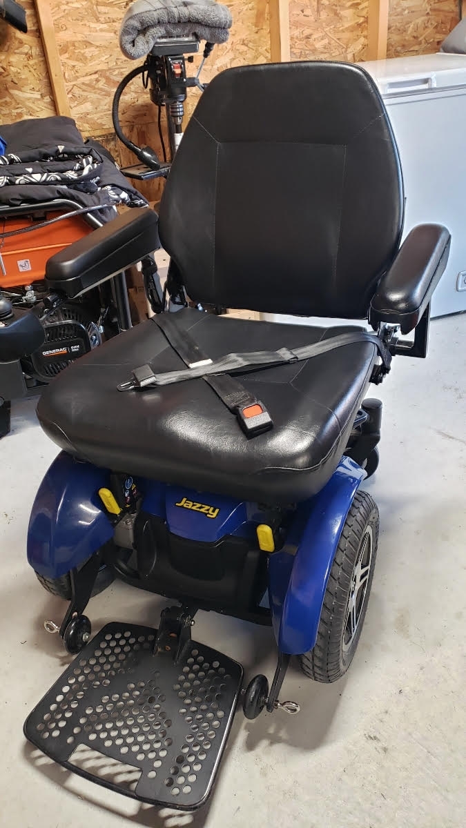 JAZZY ELITE HD - Is in EXCELLENT condition, and has two brand new batteries that were purchased in March 2021. A new battery charger is also included. The JAZZY ELITE HD is Blue with a black seat and headrest. The wheelchair has 4 tie-down anchor brackets to attach to a lift, a boom lift, or to a vehicle floor. The ZEUS 260 comes with a trapeze style frame and strap mechanism with secure adjustable attachments to lift the chair.