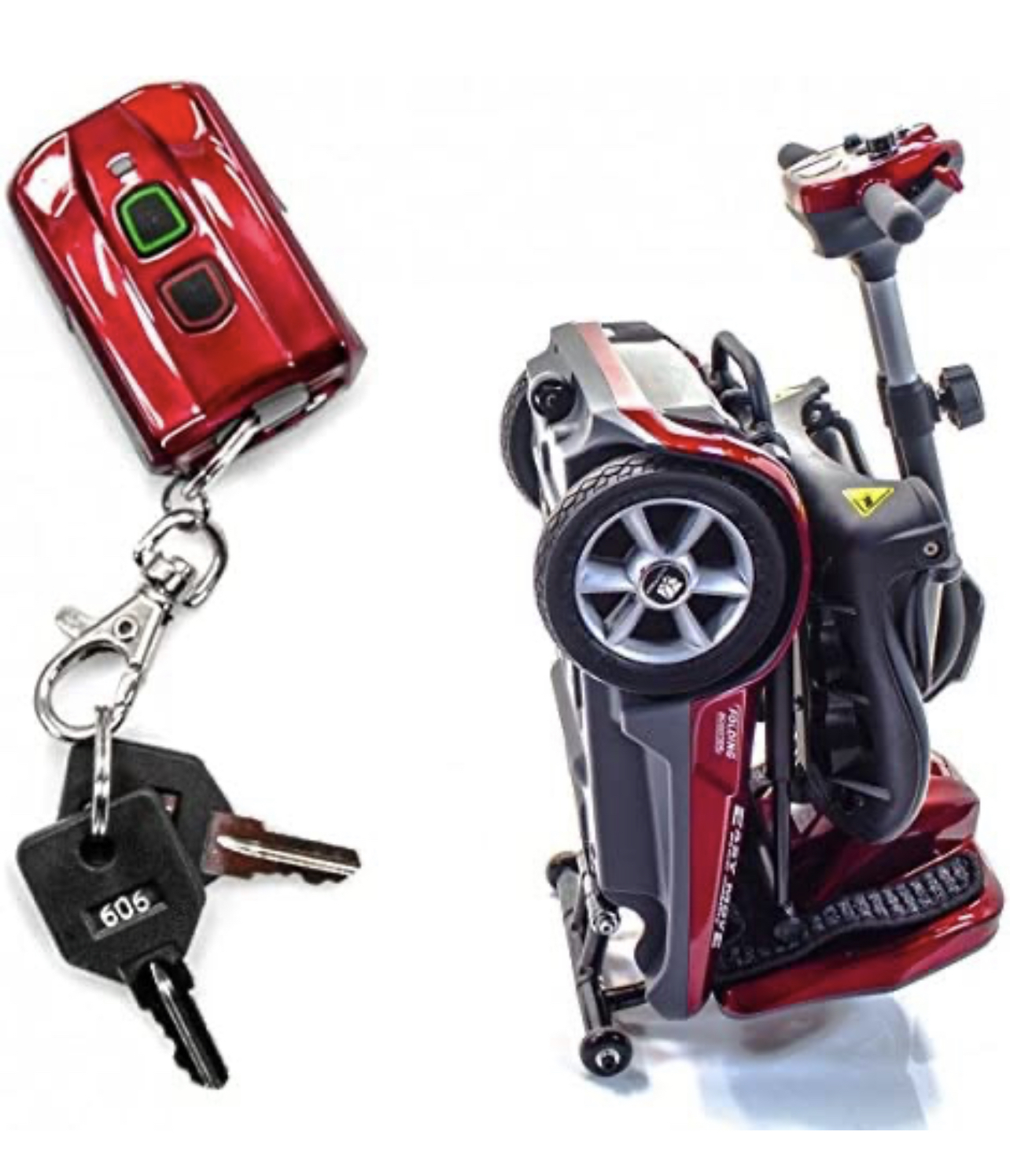 Automatic Folding & Unfolding with one touch on a Remote Control, A true one, two, three-step folding/travel scooter.