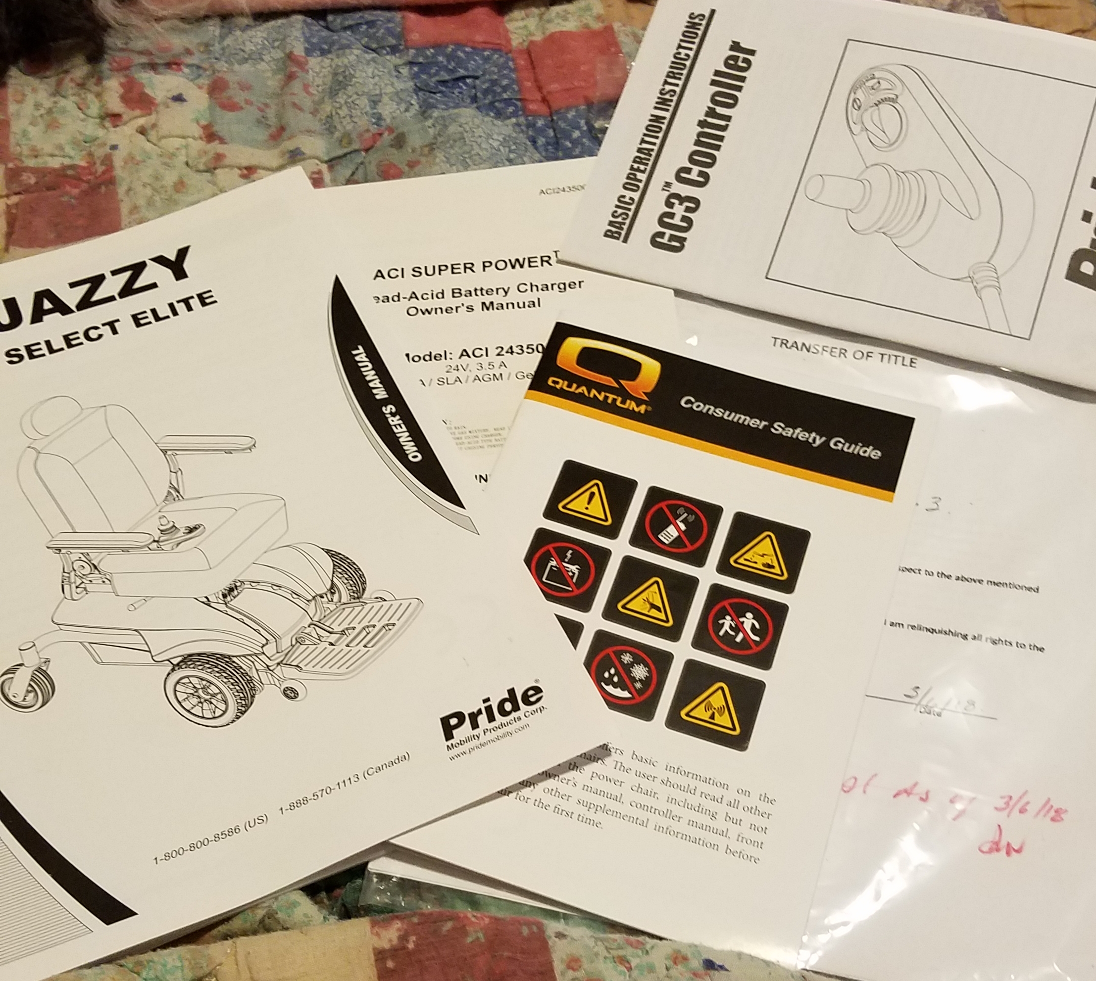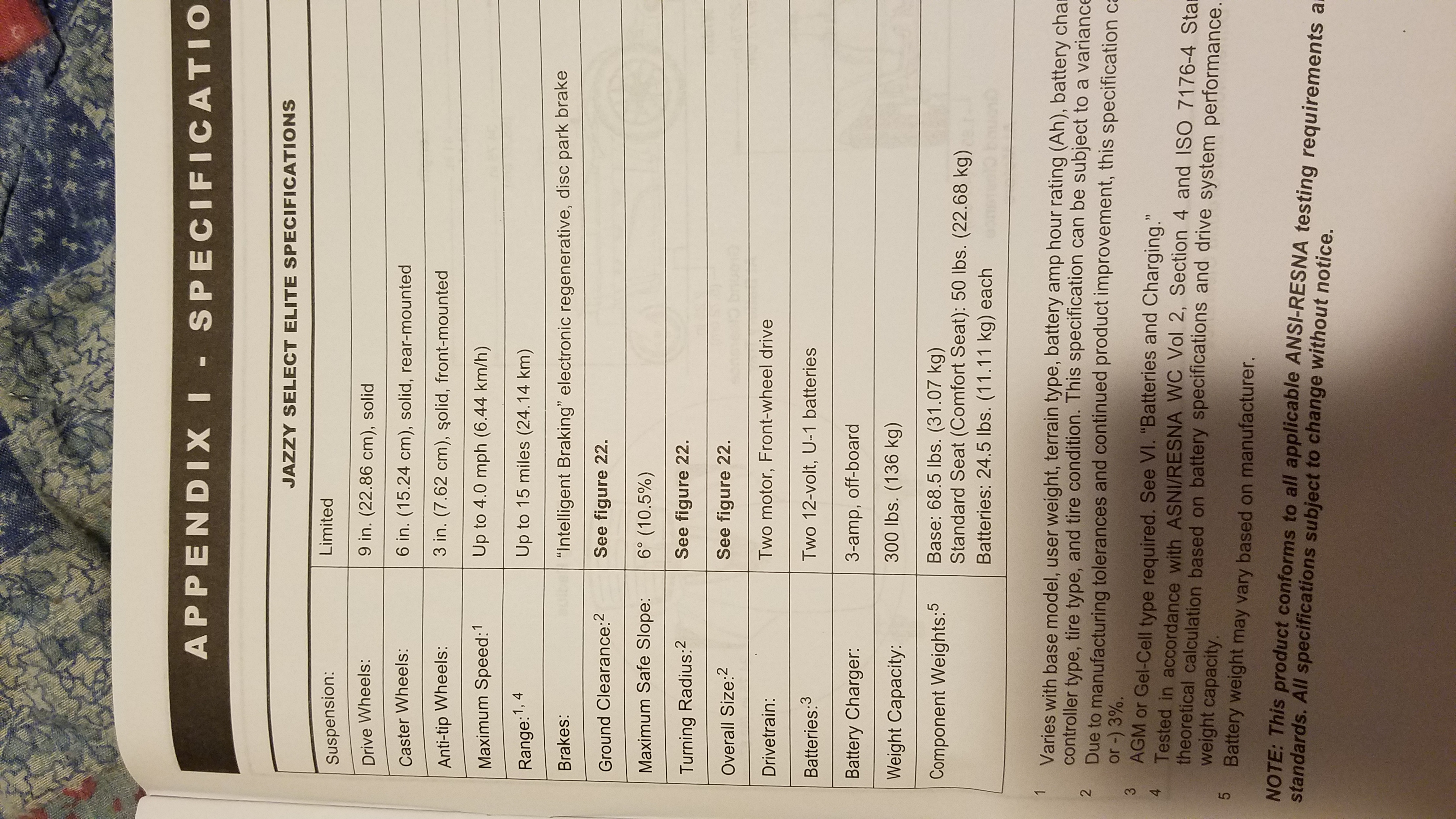 I purchased this Pride Jazzy Select Elite in March 2018 and used it for only three months. Then I stored it in a Climate control unit. It is in like new condition. Since it has been in storage it needs to be charged, but there are two freewheel tabs under the seat. The seat swivels. The back reclines. The armrests lift. There is a seatbelt. The headrest is adjustable and completely removable. I added hooks to the back of the headrest so i could hang tote bags. There is an attached slip so you can add a hitch for a pull along cart. I have the Manual and all the booklets that came with the chair. I included a picture of them so you can see them. The title is included in that picture. You are free to transfer the title and make the chair yours. I took a picture of specs so you would be able to have them. I prefer a cashiers check but will also take cash. Please feel free to email me for questions or more information.