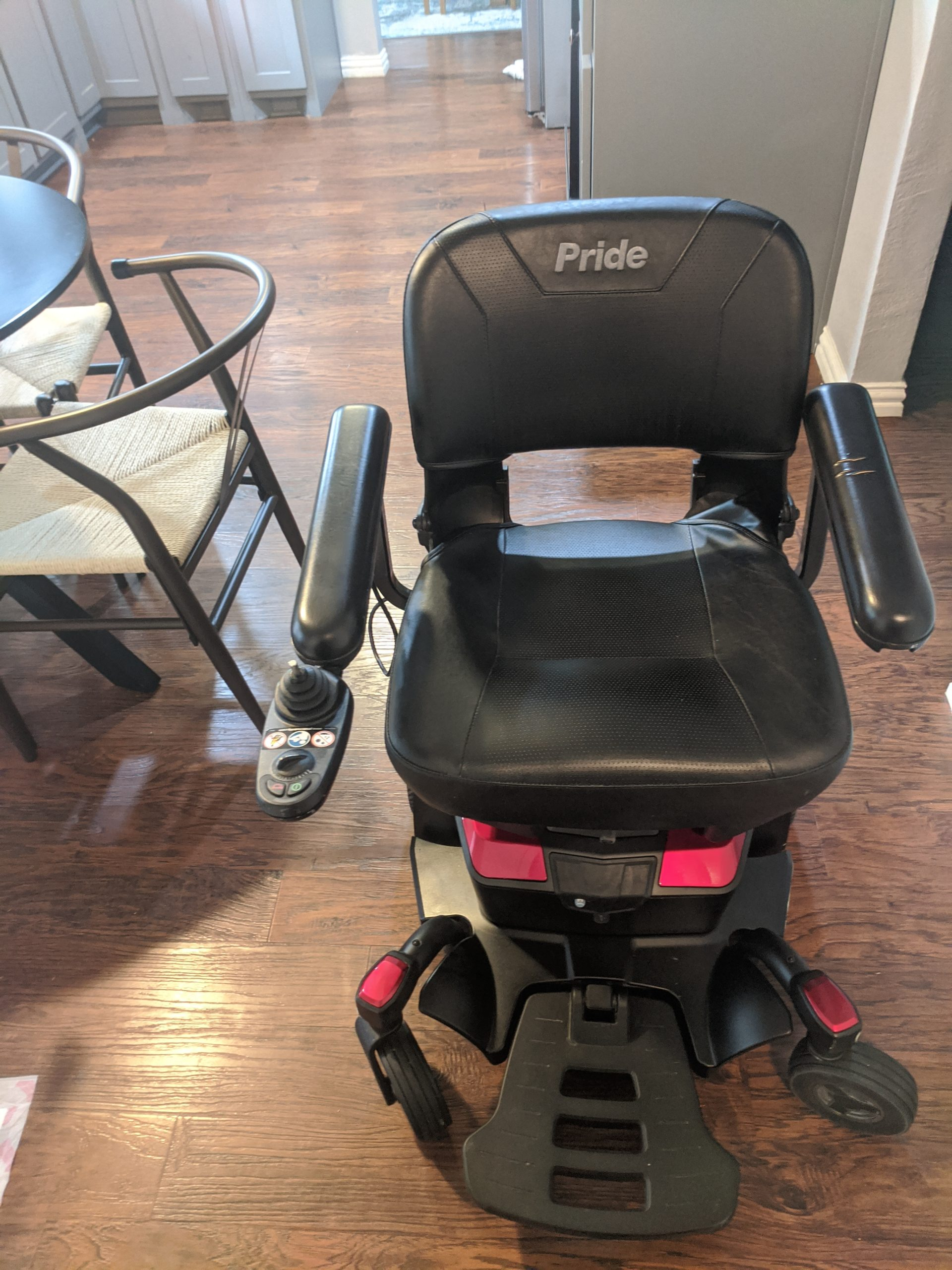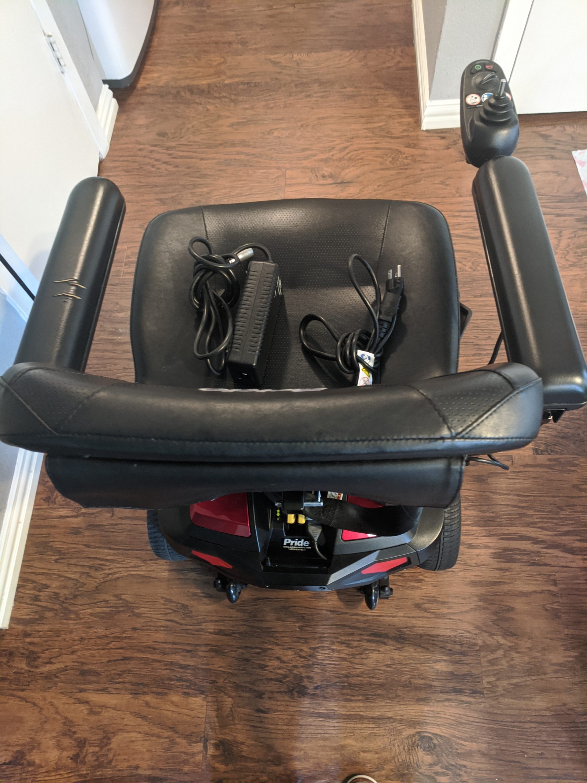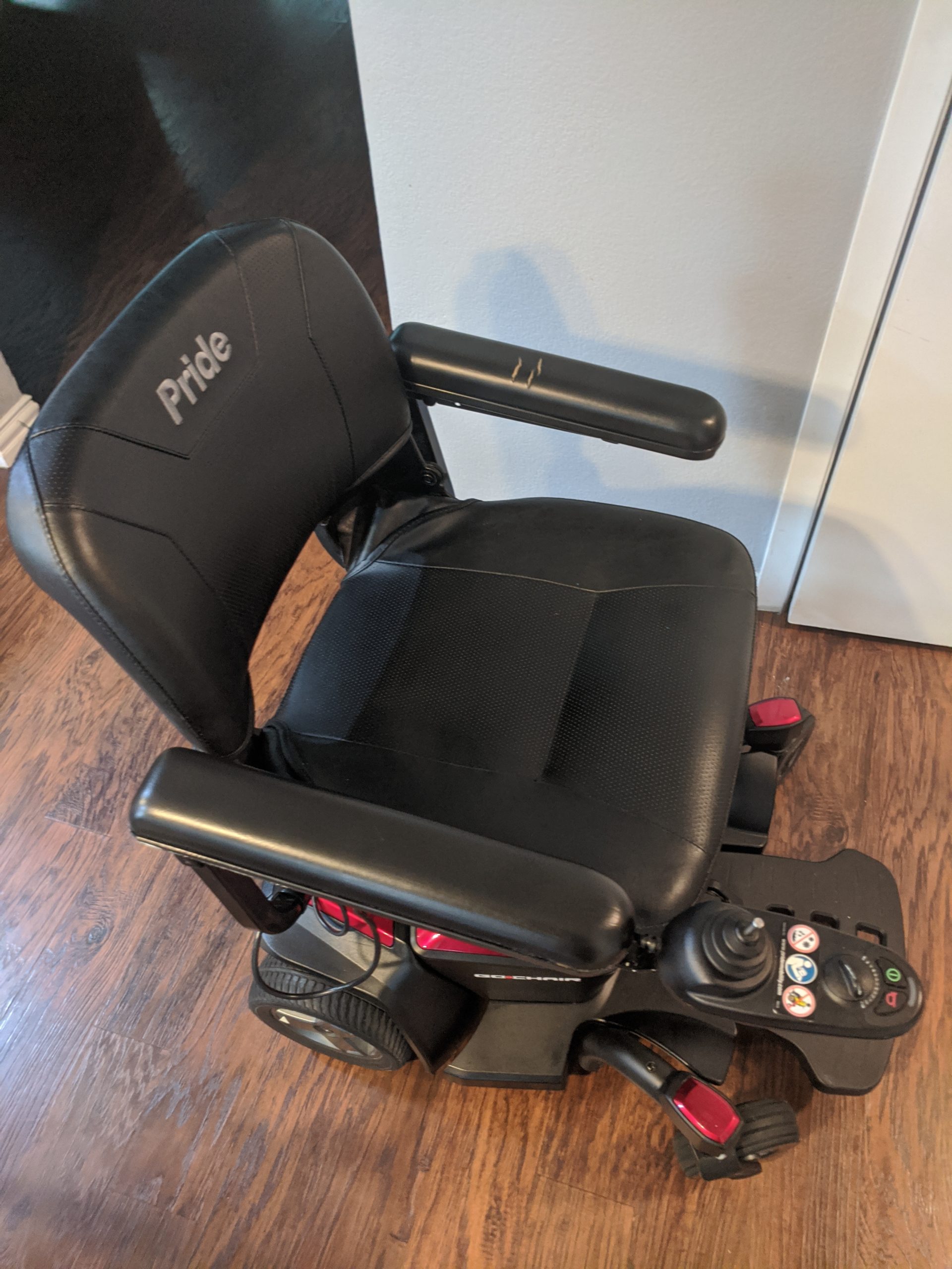 For sale, Pride Electric Travel Power, Wheel Chair. Ruby Red in Color, with Black Leather Seat and Trim. Rear Pocket Bag, for storage of items. Clean and well maintained, like new and compact. Including Battery, Charger Power Cords and Side Pocket Containers, for extra storage, or carrying of items. In Great Condition, runs smooth and works perfectly, with no issues. Only one year of use and well maintained. It also has a Seat Belt and the Seat folds forward, for easy storage and the Foot Rest folds up and down, as well. It includes reflectors for night visual, horn and 6 wheels in total. Tires are Nice Tred. Great Price. Sell Price of $900. Retail Price of $1,600. Located in the DFW area and Serious Inquires only. No Low Ball Offers. Text 214 482-9653 if interested. Pick up only. This is a very nice Power Chair and you will be well pleased .