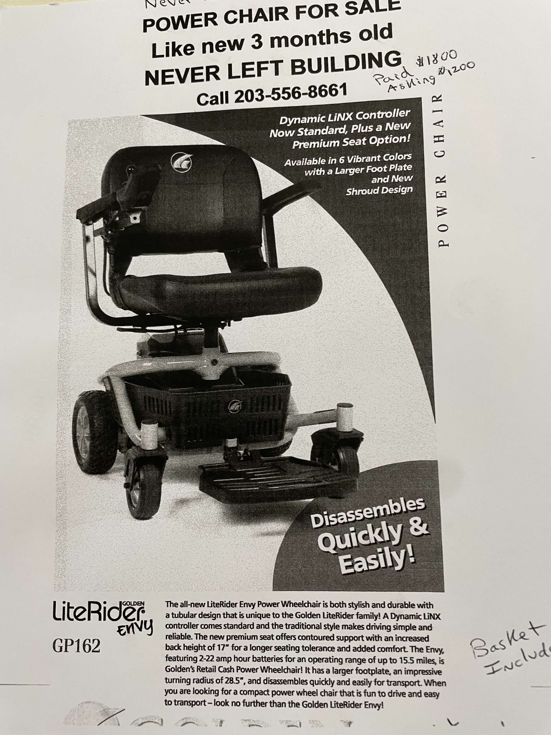 Owned three months by my dad who used it very little unfortunately prior to passing. He never left the apartment. Basket is included. Paid $255 extra for expert white glove assembly. The LiteRider Envy has a compact size and small footprint that makes it convenient and easy to handle, making it a great choice for maneuvering through narrower doors and hallways. The Envy is also great in shopping centers and outdoors on smooth surfaces such as sidewalks and asphalt. Easy disassembly as the heaviest piece is 37lbs. Total Product weight is 123 lbs. Back ht 17” Range is 15 miles on 1 battery charge. A larger foot platform makes seating more comfortable, especially for taller riders. My dad loved the handy basket under the seat for small bags and personal belongings and the easily removed battery pack complete with batteries for long life . 28.5 turning radius. 300 lb capacity. Please contact me by email with questions.