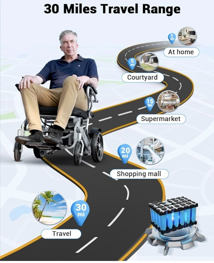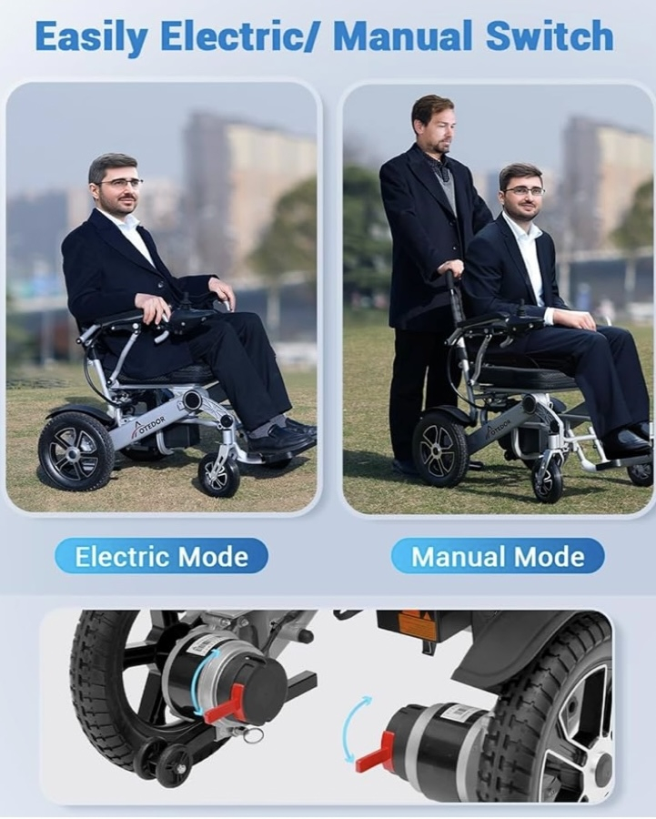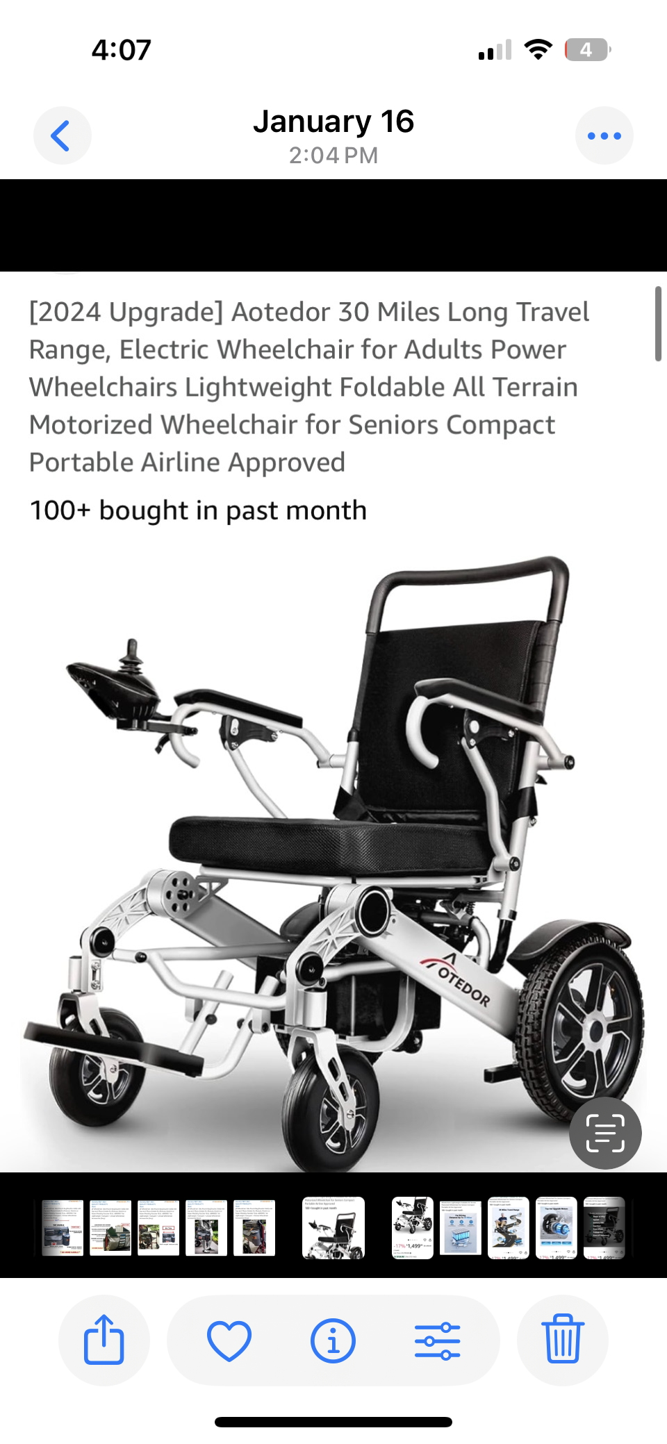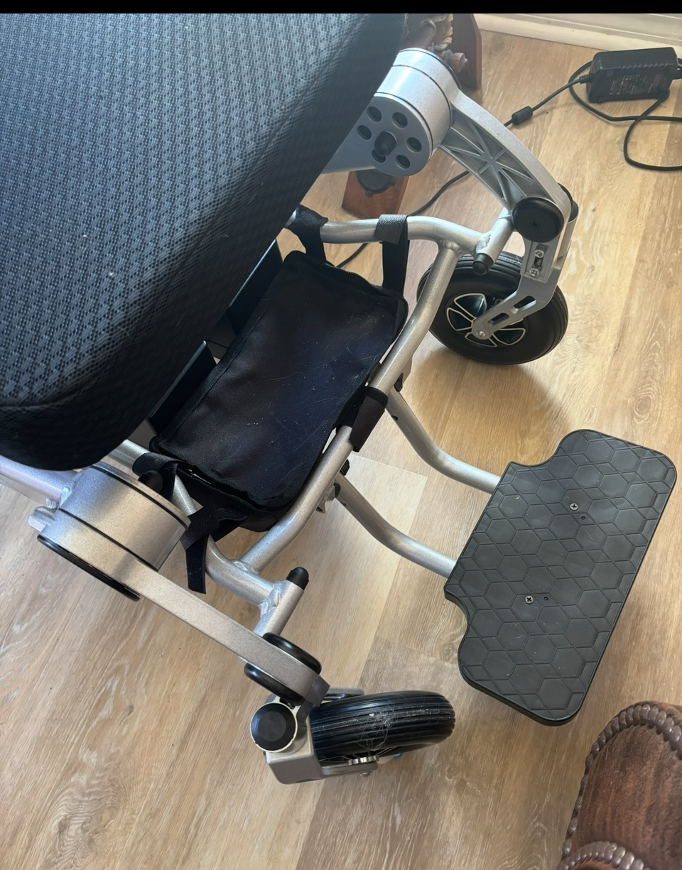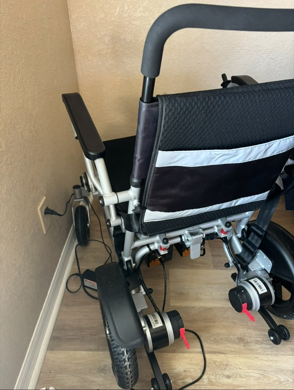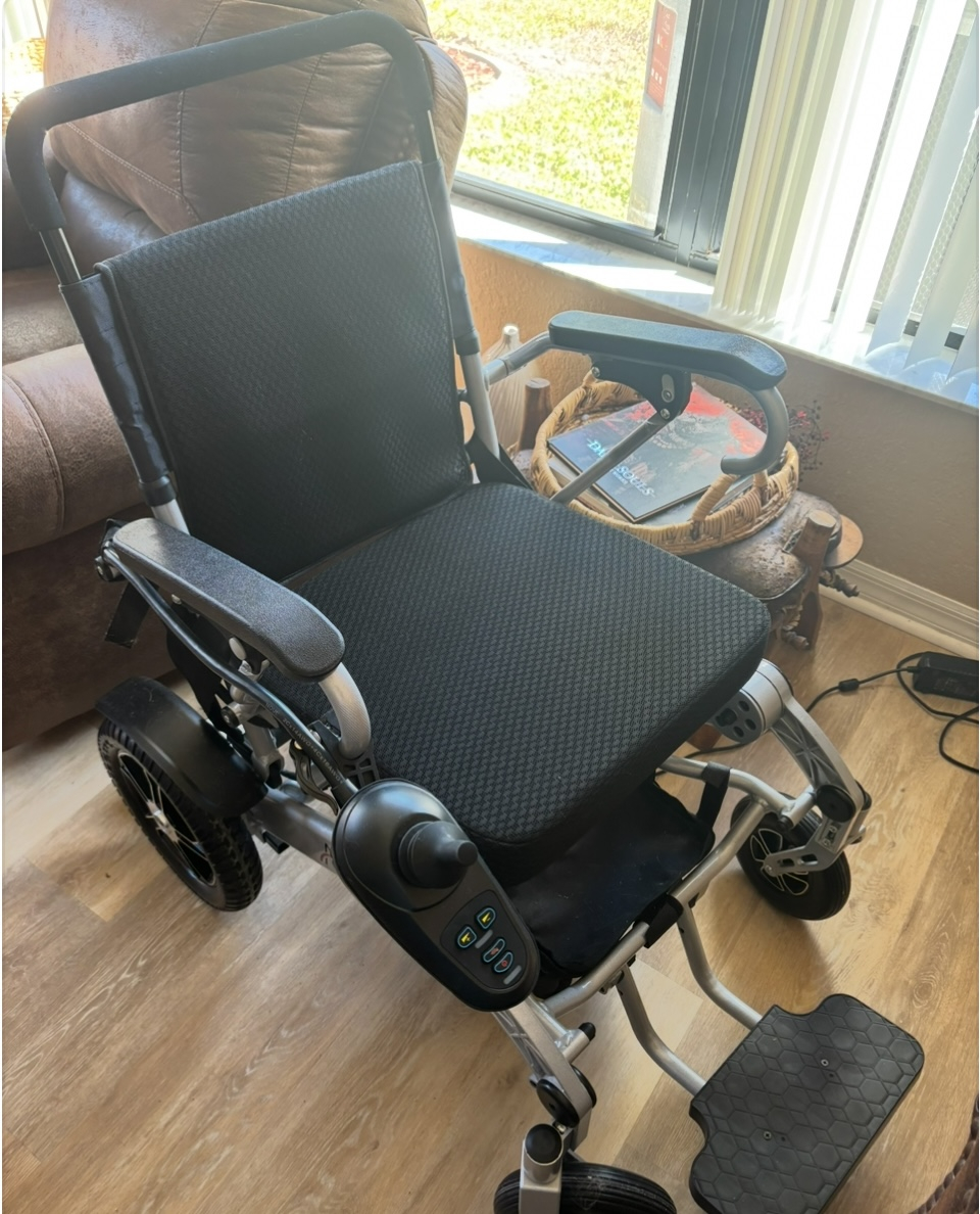 Long range foldable electric wheelchair. Works on multiple terrains, electric or manual, TSA approved, up to 30 miles, 360 degree control rotation. Used a handful of times over a 2 month period. Comes with free detachable medical bag. Asking $1,000. Cost $1,700 new. Weighs 50 pounds. Aotedor brand. Lightweight, compact, multiple speeds. Seatbelt, goes pretty fast, in nearly perfect condition. I had a short term neurological illness and it is no longer needed. Please reach out to fmanigli@gmail.com or call 703-505-2927. Please don’t hesitate to ask any questions. Purchased in sept 2023. Very comfortable seat. Ease of folding, ease of carrying and ease of switching between electric and manual. 24AH lithium battery, 10 hours charging time, top tier motor and controller. 3 seconds to fold. Local pickup only in North Port,FL. Cash only accepted form of payment. This was purchased from Amazon. I have experienced no glitches or problems using the chair. Has seatbelt. Free medical bag is detachable and velcros to chair.