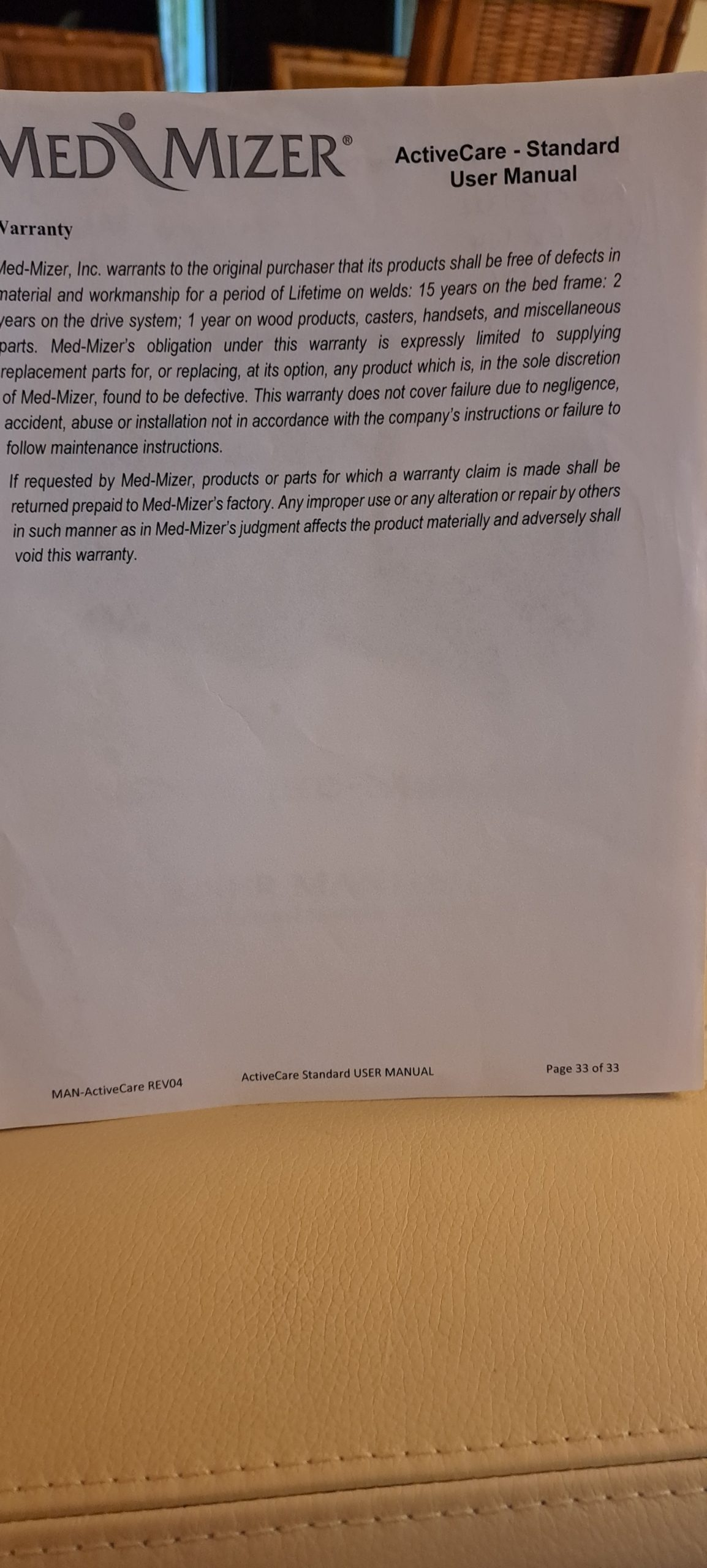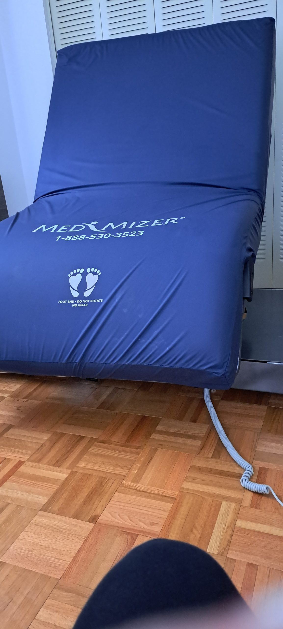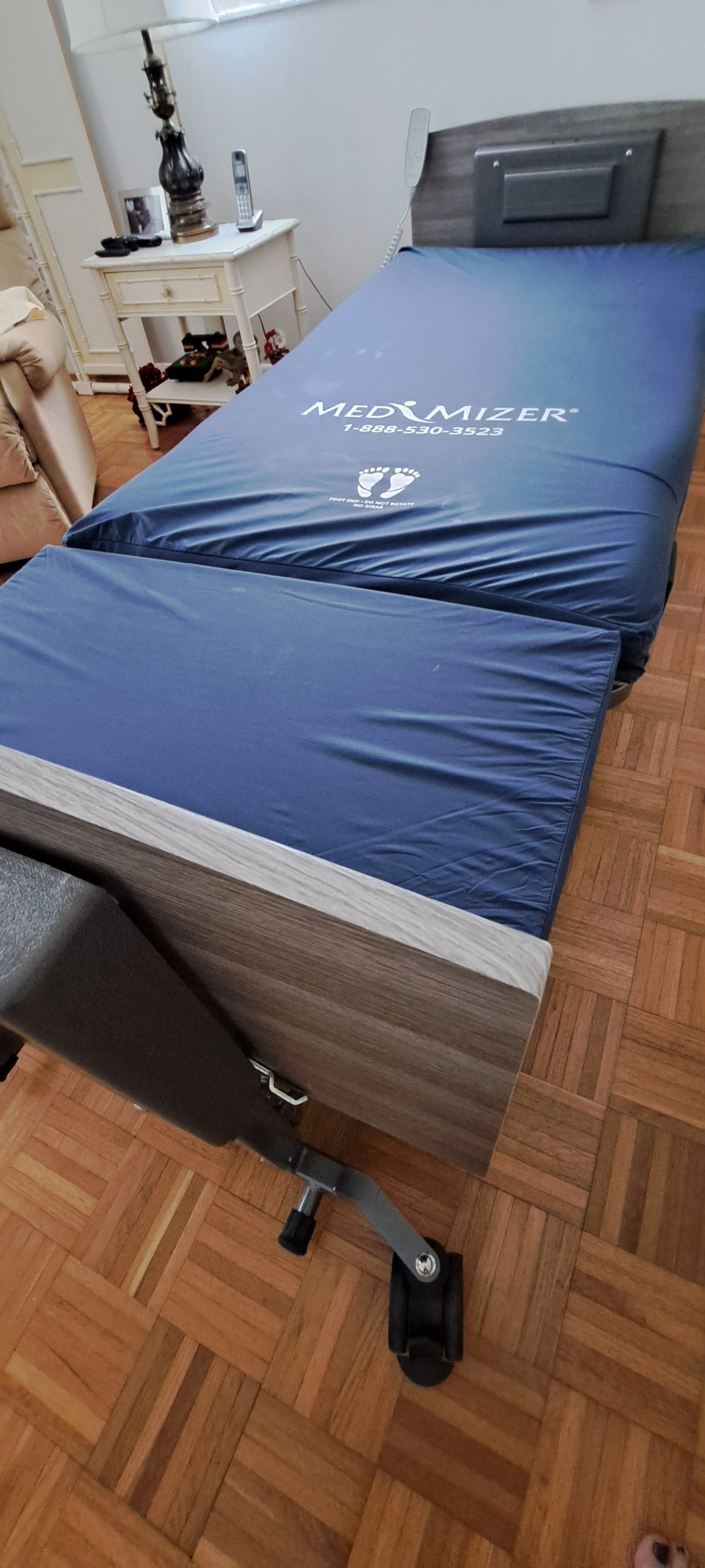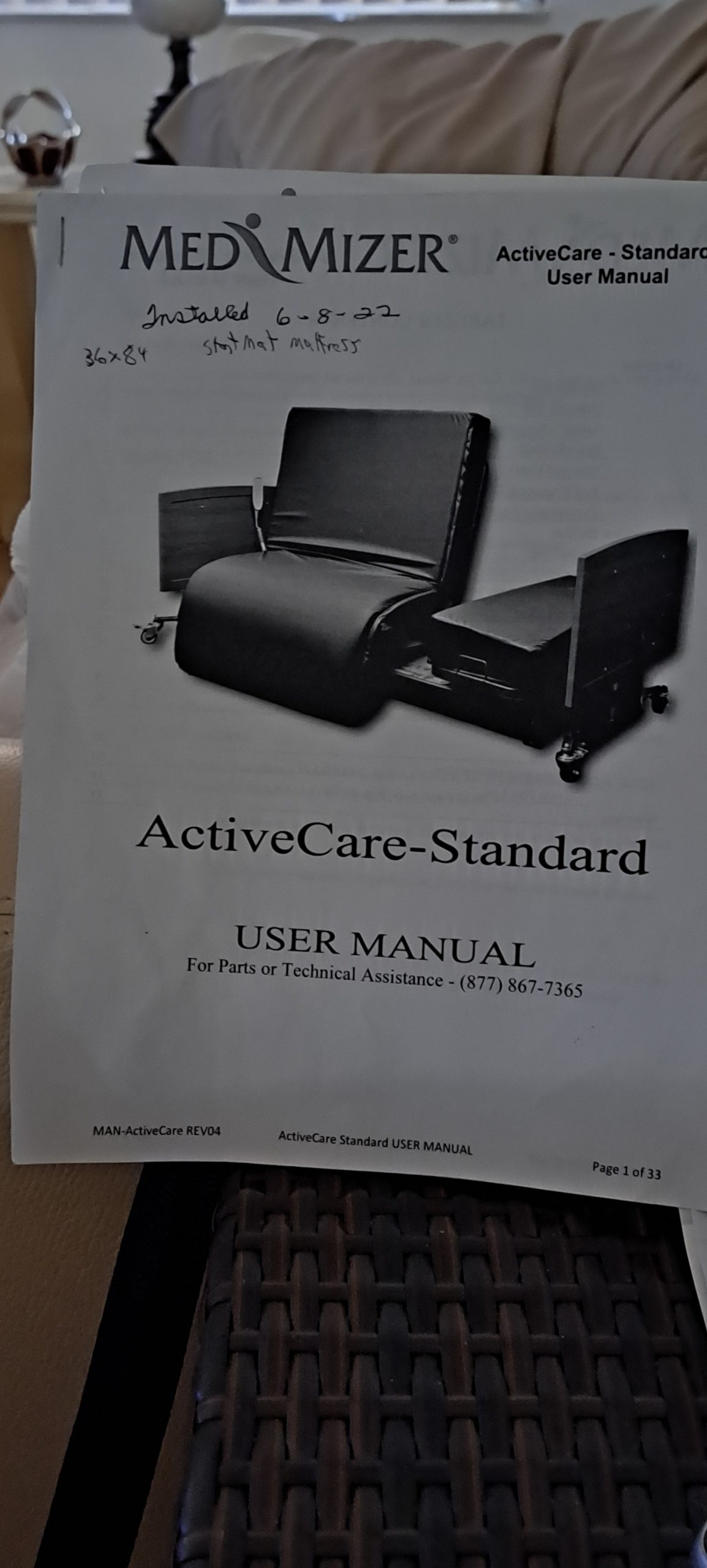 MED MIZER ACTIVE CARE STANDARD ROTATING & SIT UP AUTOMATIC HOSPITAL BED. THE BED IS INTENDED TO PROVIDE A MEANS FOR A SINGLE OCCUPANT TO RECLINE AND SIT, AND TO ASSIST THE OCCUPANT IN MOVING BETWEEN RECLINING, SITTING AND STAND POSITIONS. RATED FOR UP TO 600 LBS LOAD. THIS BE WAS PURCHASED NEW FOR OVER $6,000 IN JUNE, 2022.