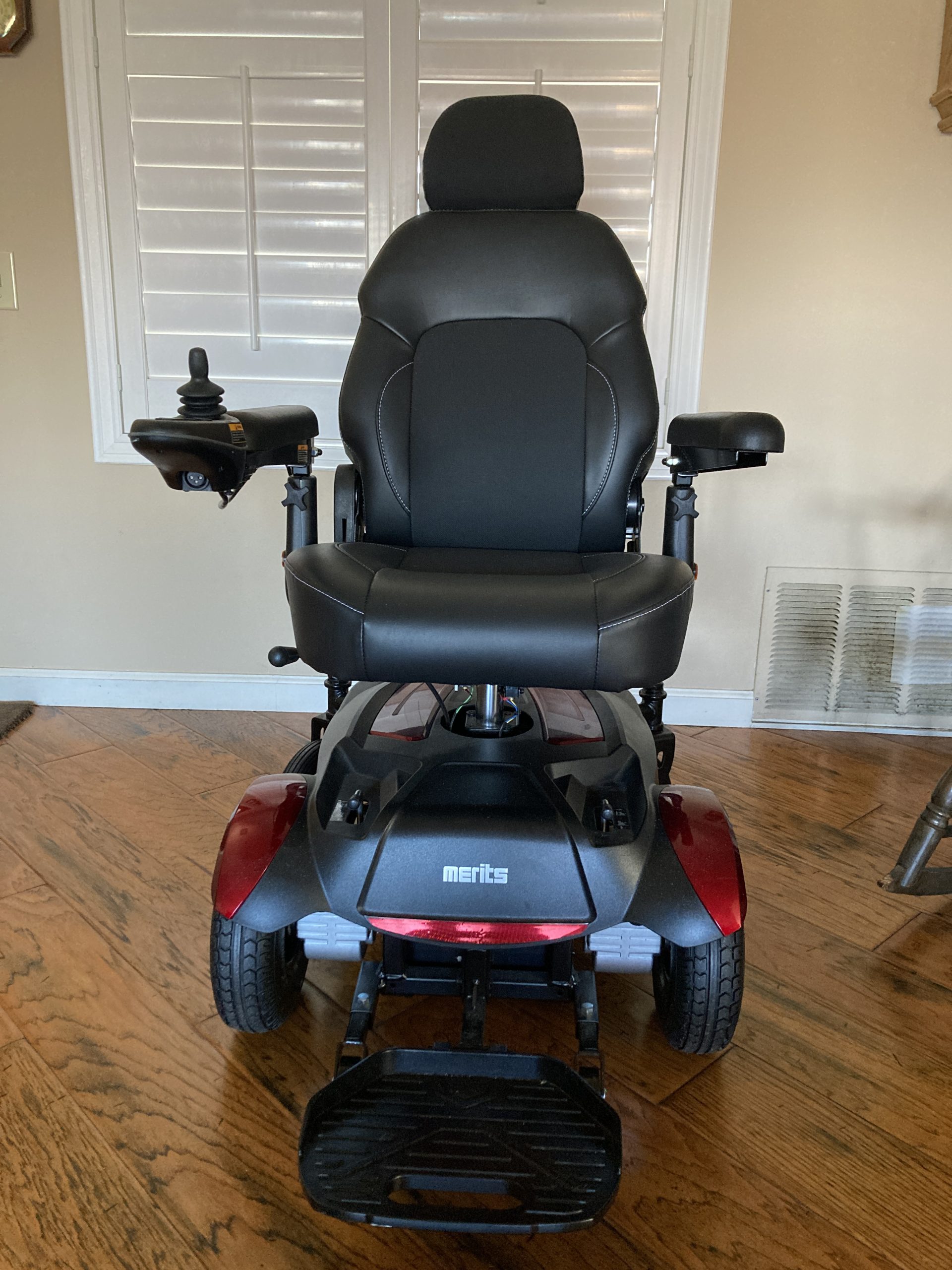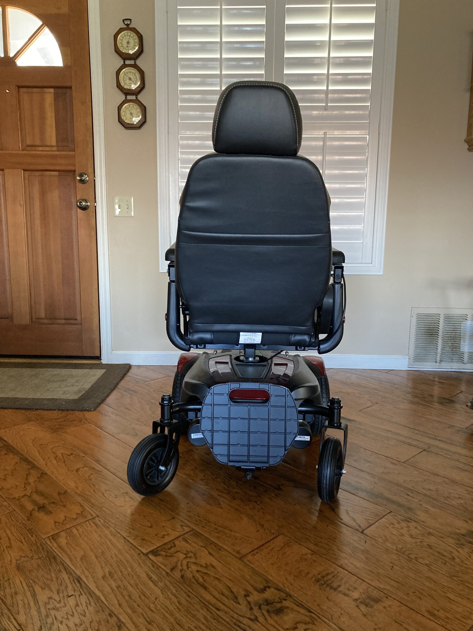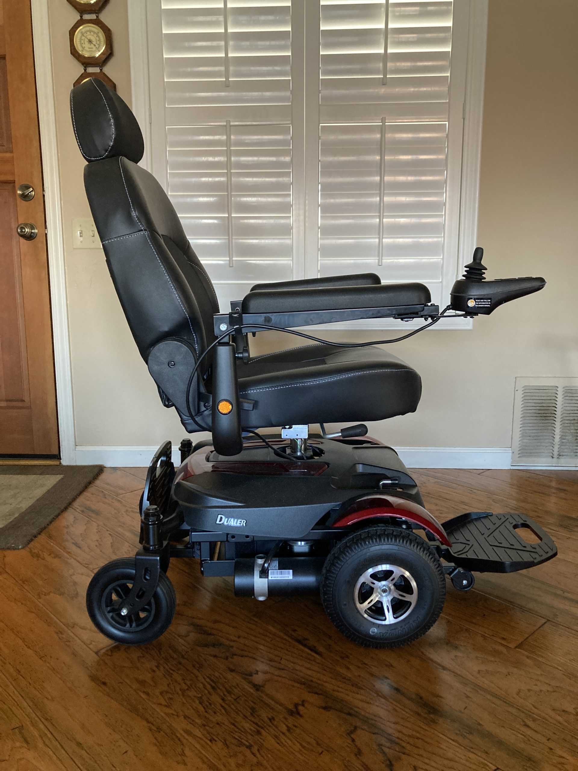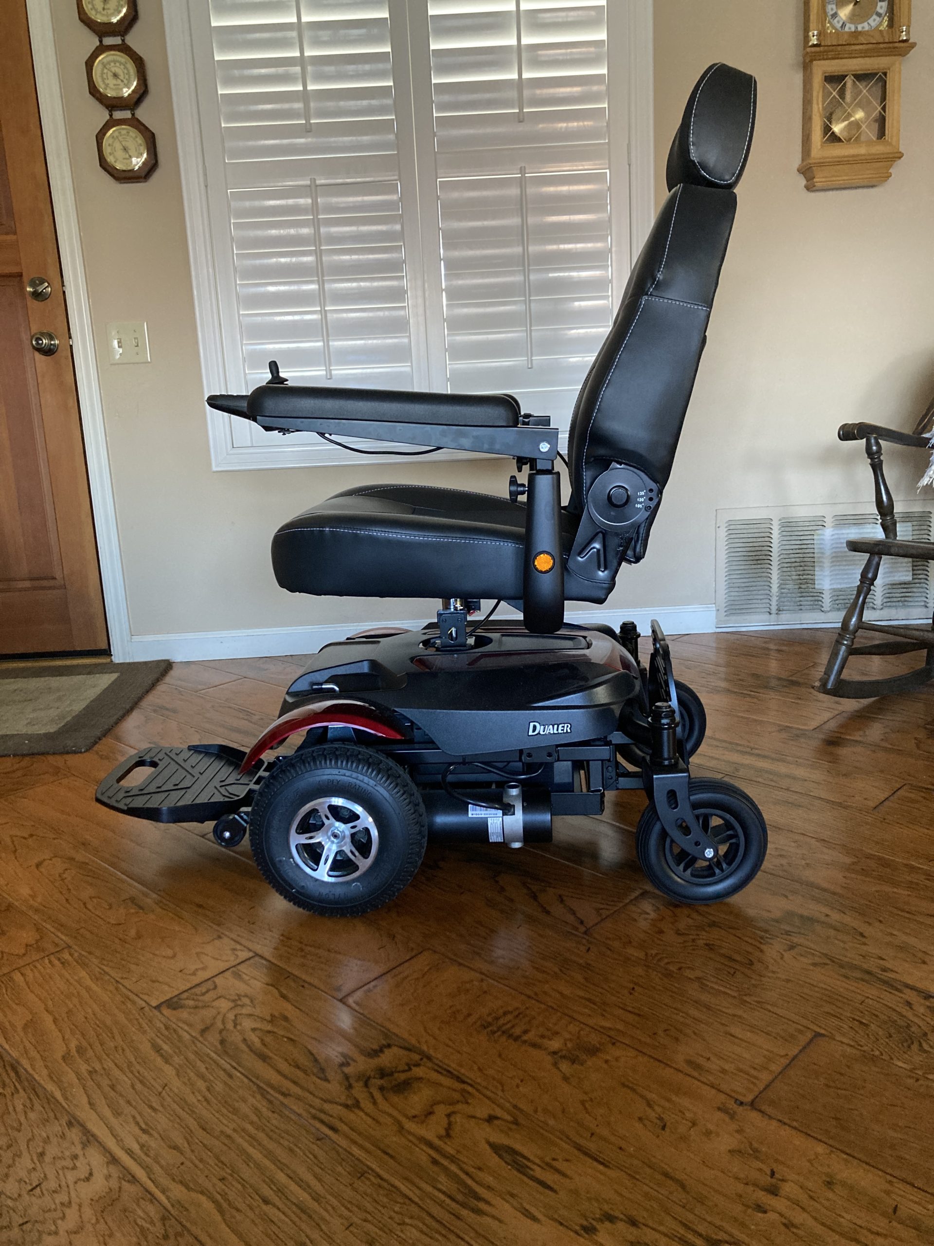 The great two and one powerbase feature of the dealer, let you maneuver without having to make as many three-point turns as many of us competitors do you just pivot seat and driving the opposite direction returning radius of the chair is Is 21 inches which is small compared to a full size power chair.