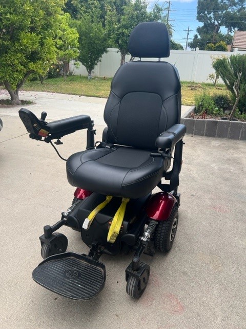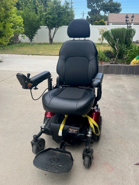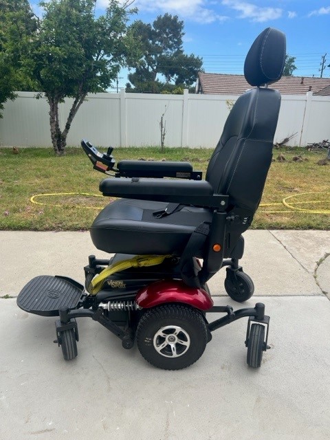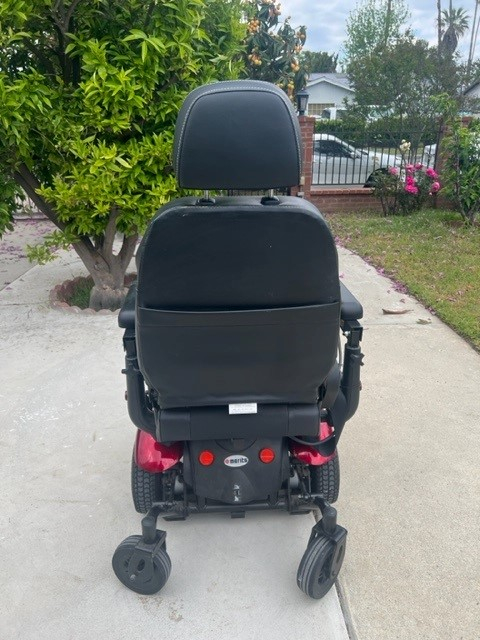 This listing is for the sale of a Merits Health Vision P326A electric wheelchair. This was our Mom's wheelchair and she has passed away. The unit has a leather seat, and red base. The chair was not used too frequently as she used a manual wheelchair in the home and this unit remained in our van for the most part. Wheelchair works like new and there is minimal wear. All functions are working properly from what I can tell. We have the charging unit and straps that were used to tie down the unit inside of the van. height and width adjustable armrest, swing back controller bracket, and dual in line motors. Unit has a 20 inch turning radius, with six inch solid tires in the back and front and ten inch solid tires in the middle, for no flats.