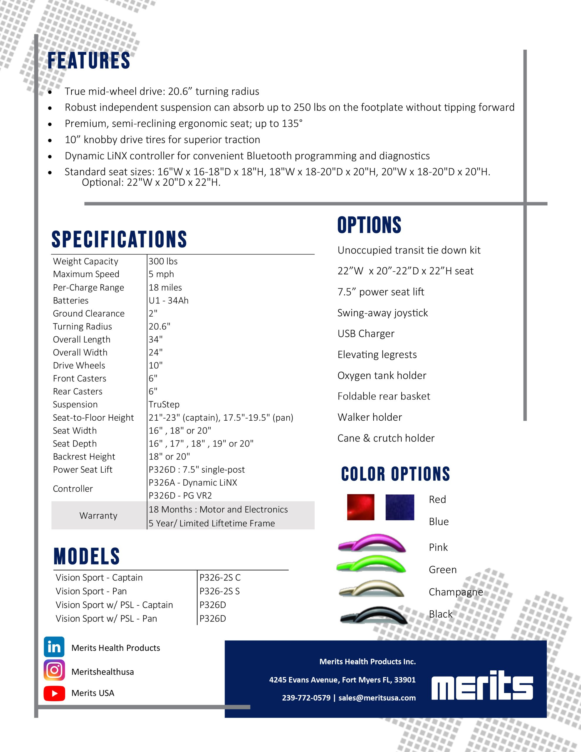 Features per the brochure: True mid-wheel drive: 20.6" turning radius, robust independent suspension can absorb up to 250lbs on the footplate without tipping forward, Premium semi-reclining ergonomic seat (up to 135 degrees), 10" knobby drive tires for superior traction, dynamic LiNX controller for convenient programming and diagnostics. Weight capacity 300lbs, Max speed 5mph, per-charge range 18 miles, front and rear casters, TruStep suspension.