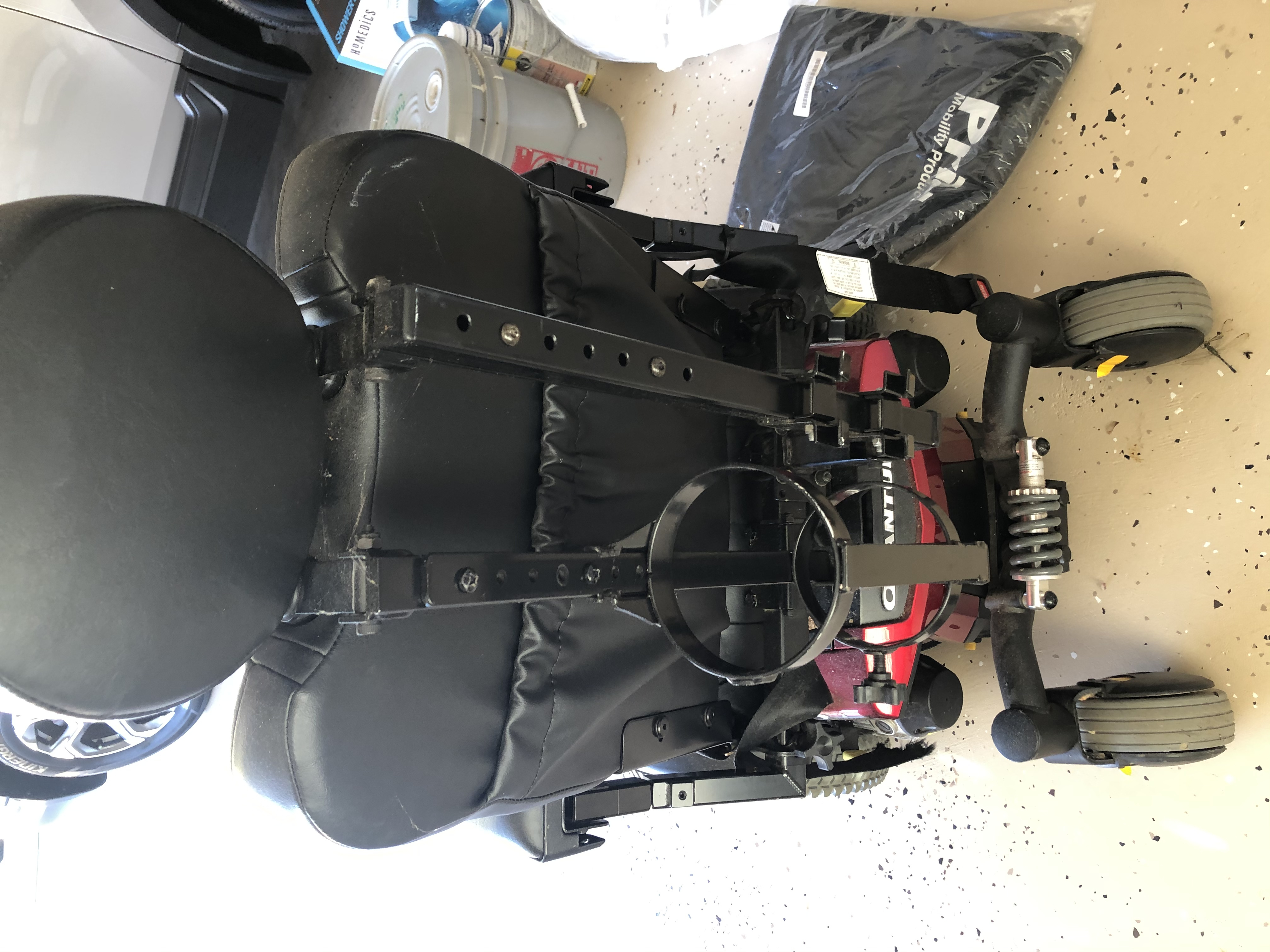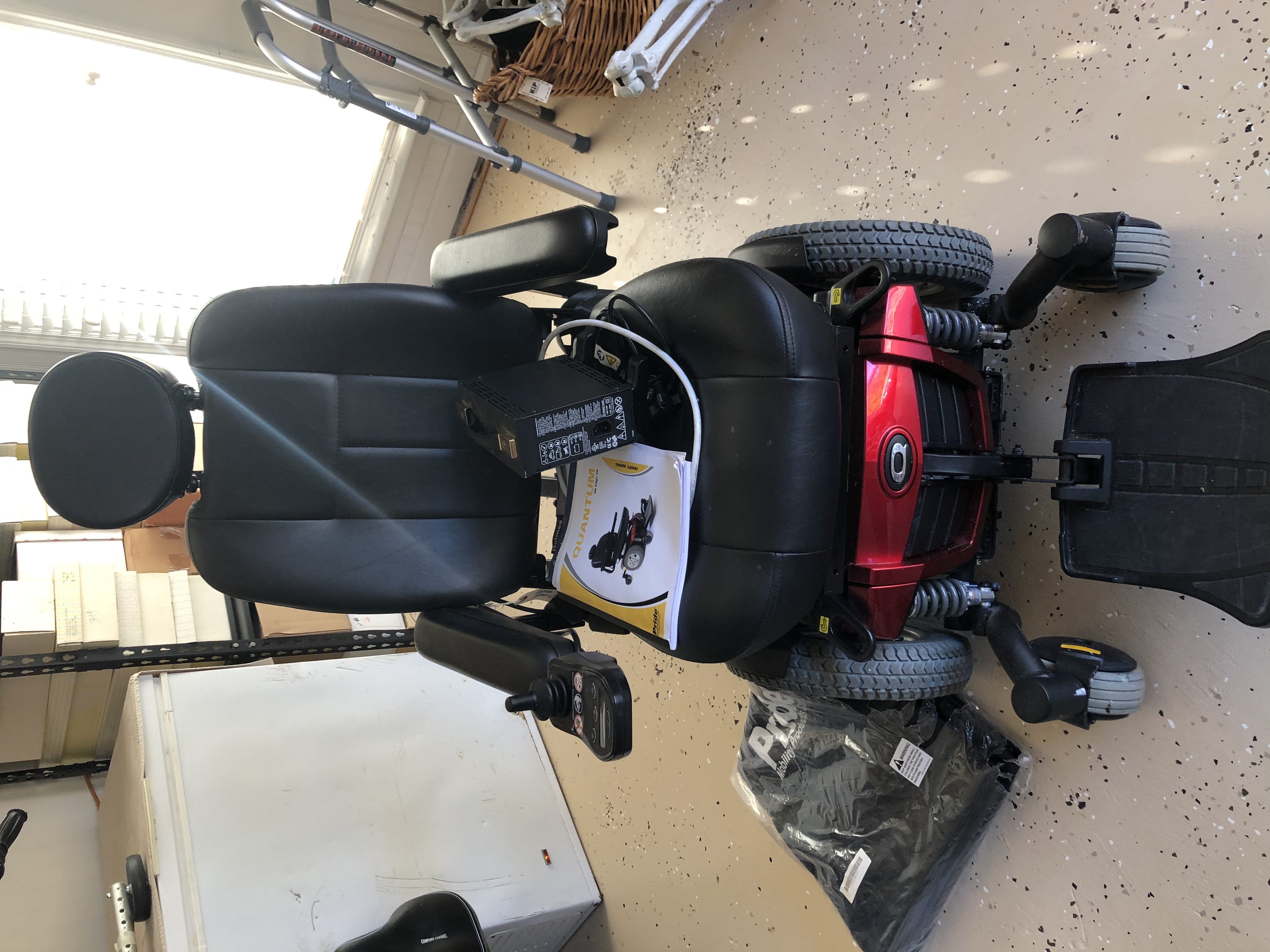 Nice red color. Scooter has speeds from 1-5. It goes in reverse and extremely agile in the house and around corners. Black leather seat. Had a new cover that had never been used. It’s a Quantum q6 model. Head adjust. Manual brakes. Oxygen tank holderIs removable. If you have any questions, please contact. I’m located in Columbus, Ga. I Did not have means to transport the mobility scooter so it was only used around the house. The mobility scooter was not used on a regular basis so no maintenance was ever required. Was only used to get around locally in and around the house and rarely outside use. We were the only owners and my father mobility lessened about a year prior to his going home. This is a very convenient means for the more mature to get around. Nice mobility scooter