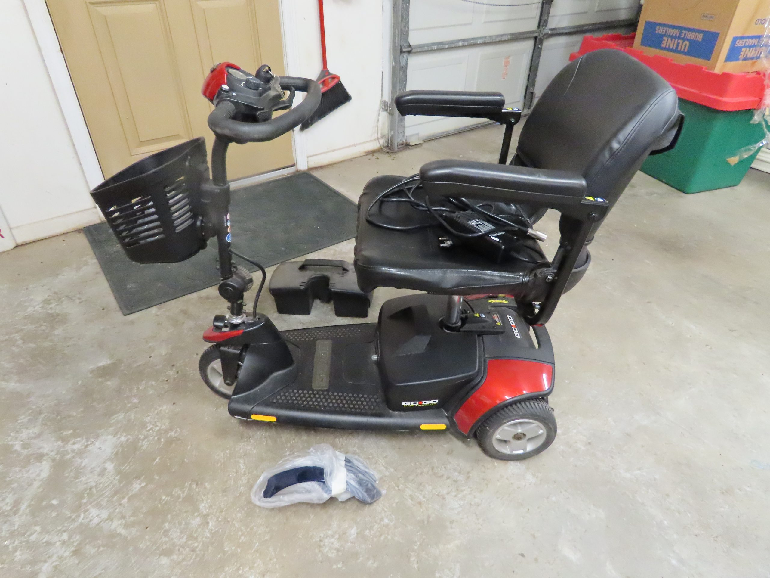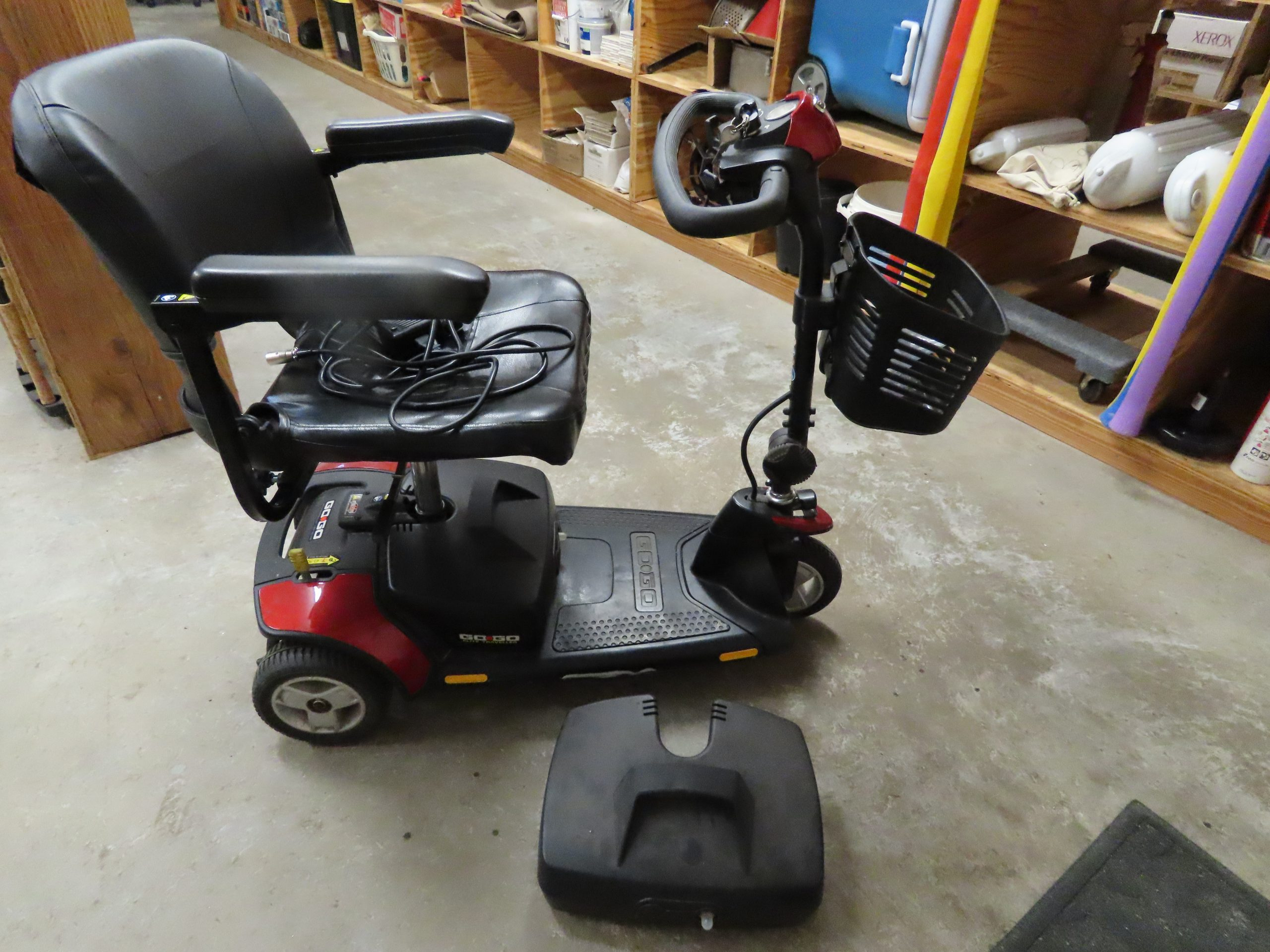 The Go Go Elite Traveler 3-wheel Mobility Scooter has a 300 lbs. weight capacity and up to 4 mph maximum speed. It is 42 x 21 x 21 inches and when assembled is 115 pounds. The turning radius in 33 inches. It can go up to 12.4 miles per charge with the 12 volt battery. It has an extra battery pack for charging while still using the scooter. There is a spacious deck for your feet and legs and a comfortable 17" x 17" swivel seat. That means when you roll up to the dinner table, or need to disembark, simply pivot your seat. The standard front basket provides storage but can be removed if not needed. Can be easily disassembled into 5 lightweight pieces for transport and storage. The heaviest piece only weighs 29 pounds. Has Pride’s exclusive black, non-scuffing tires. Includes two sets of easily changeable, red and blue colored shrouds. Can be used outside or in the house.