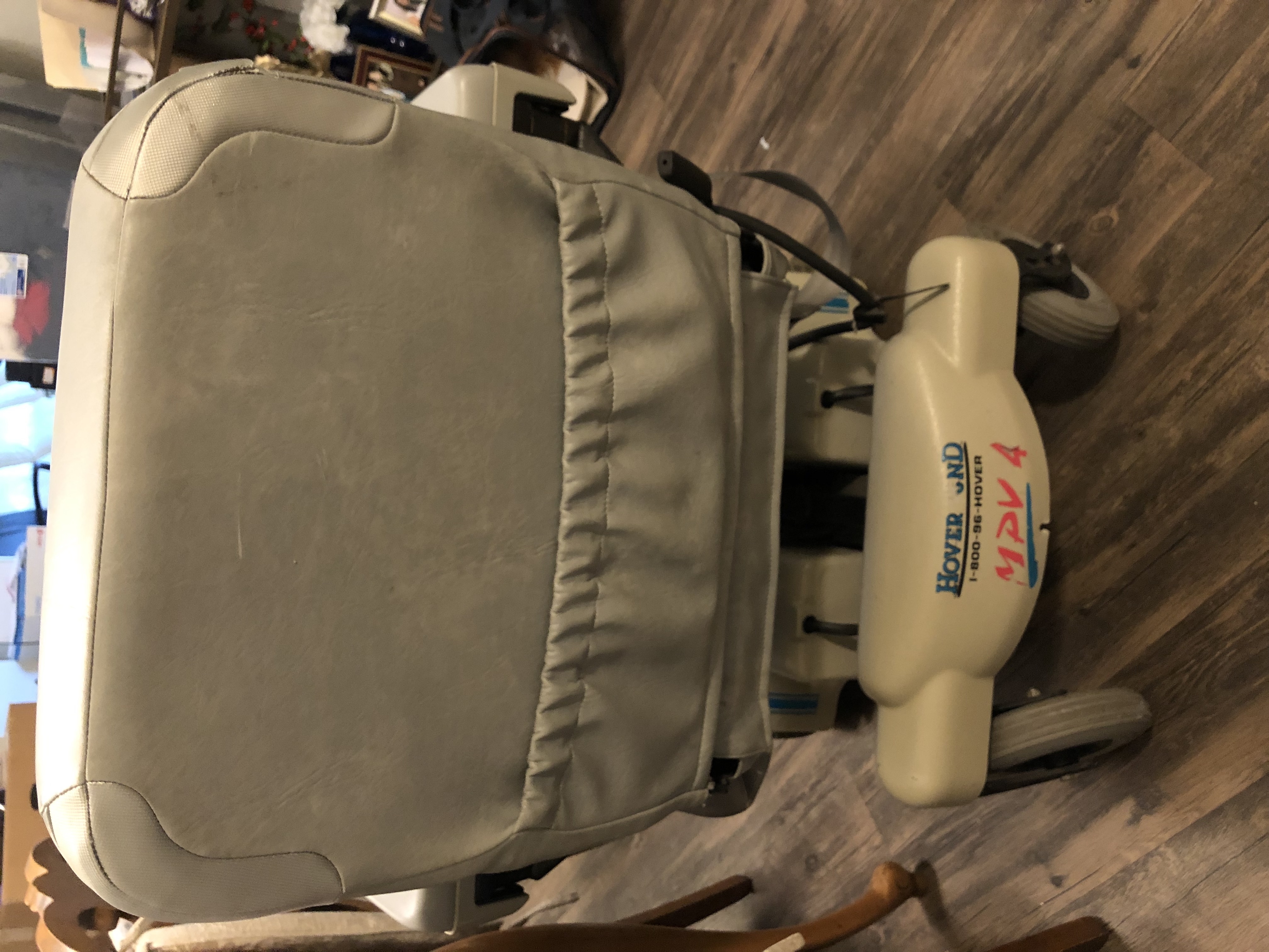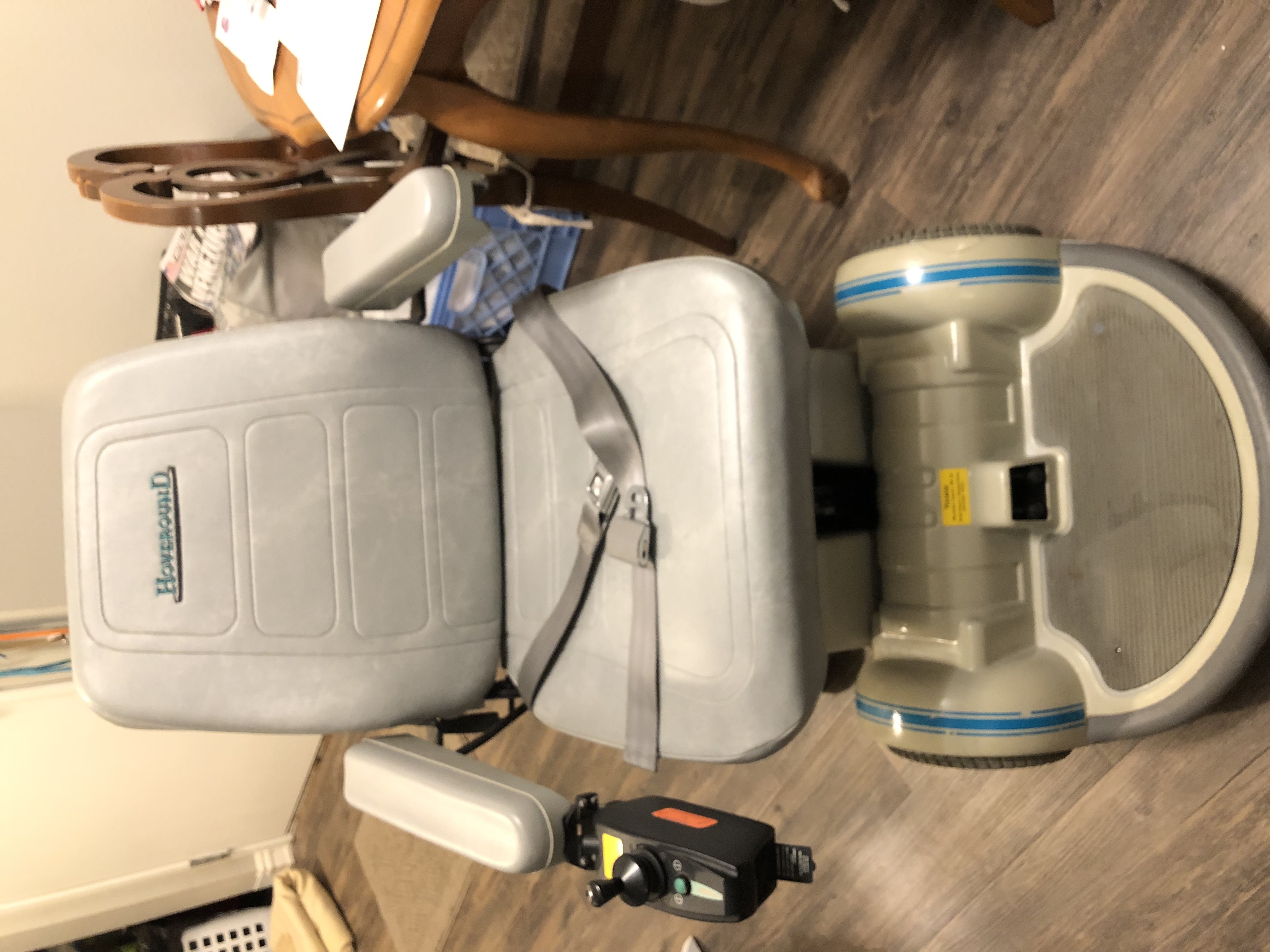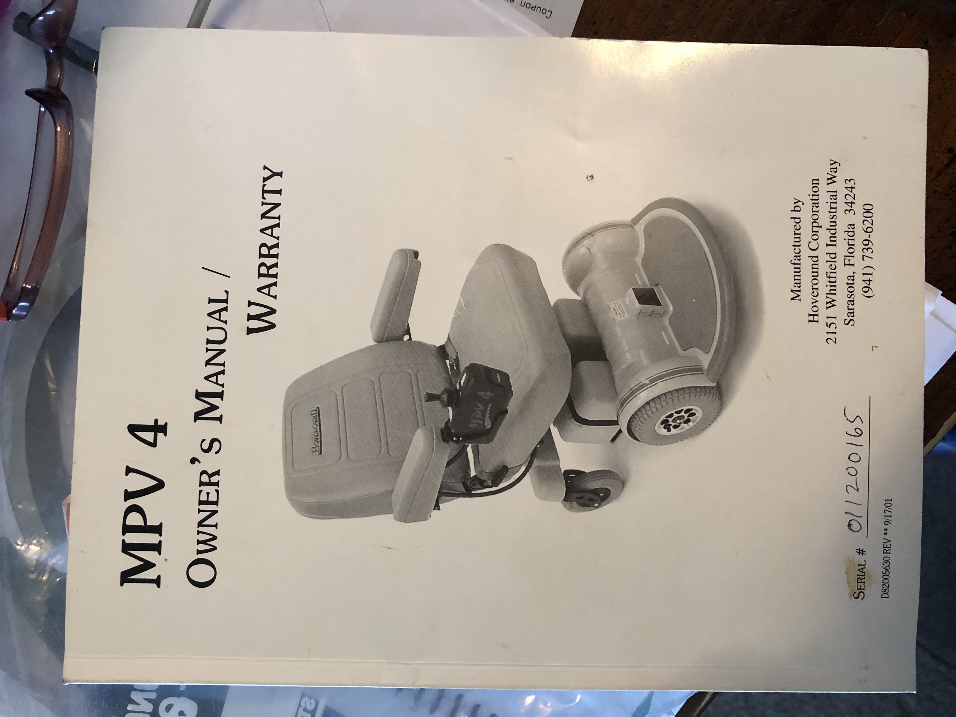 Hoveround MPV4, is a home Mobility Wheelchair. This Compact chair is gentle yet powerful maneuverability and functional for daily wheeling about in Senior apartments or home. The comfortable padded chair moves in and out of an apartment; elevator, and building hallways and out doors on level terrains without a problem. The Wheelchair has a replaced newer battery and a brake release levers. The chair seat is adjustable and swivels and permits the seat to pivot from forward position through 90 degrees in either the left or right directions. The chair have adjustable arms rest and adjustable seat- back, recline, a foot rest and a adjustable joystick controller for turns. The joystick controller is programmable for functions: Acceleration, Decelerations, Turns Accel. and Deccel, forward -max and min. Turn- max and min and Reverse.